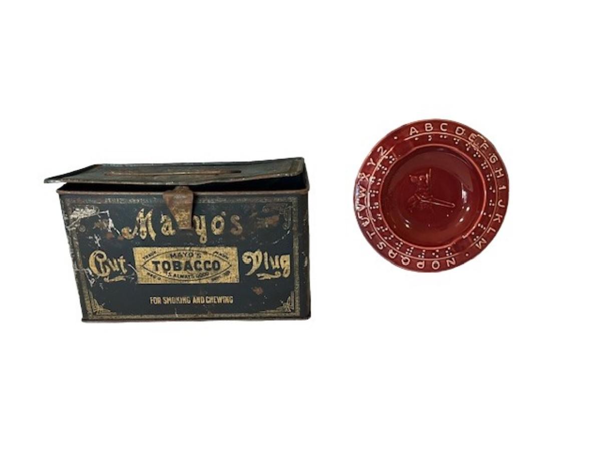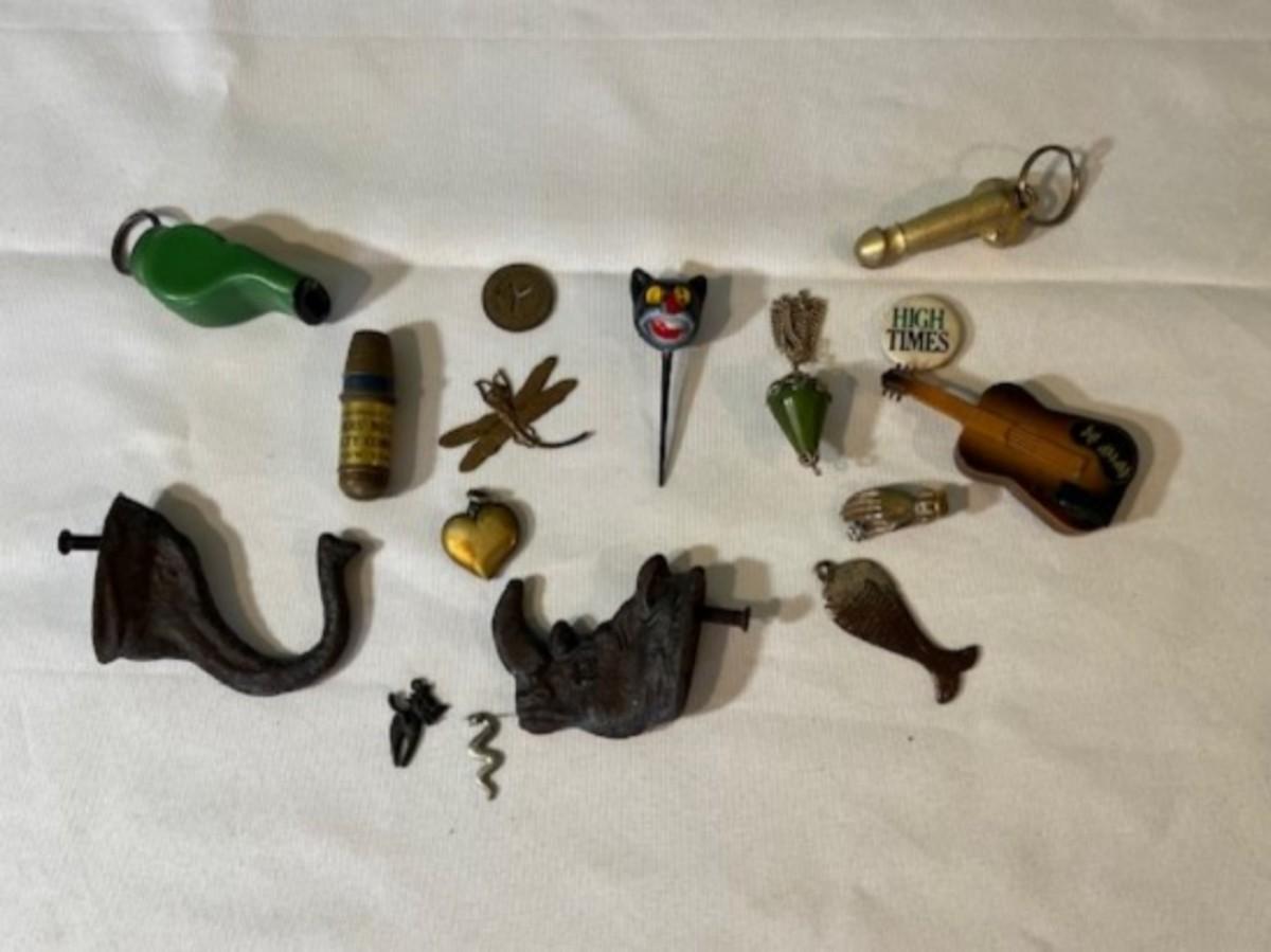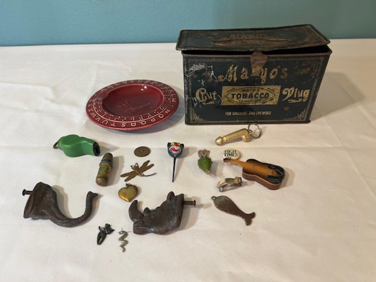 Includes keychains, pins, iron hooks, an ashtray, a tobacco tin, and more. Total of 15+ pieces. Measurement of largest: 8" x 5".