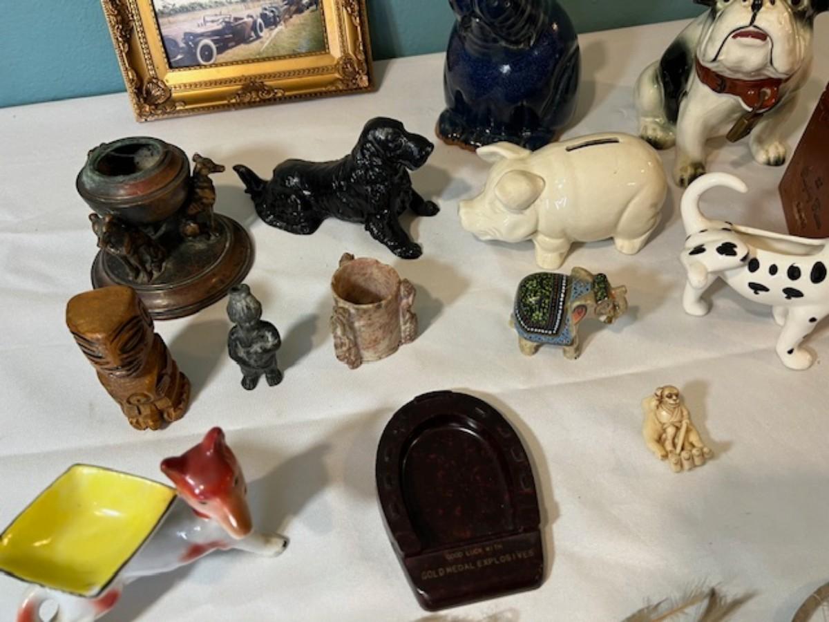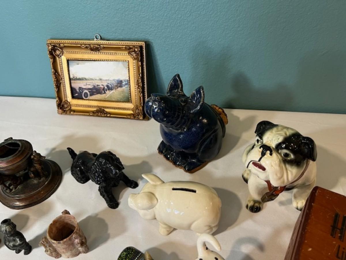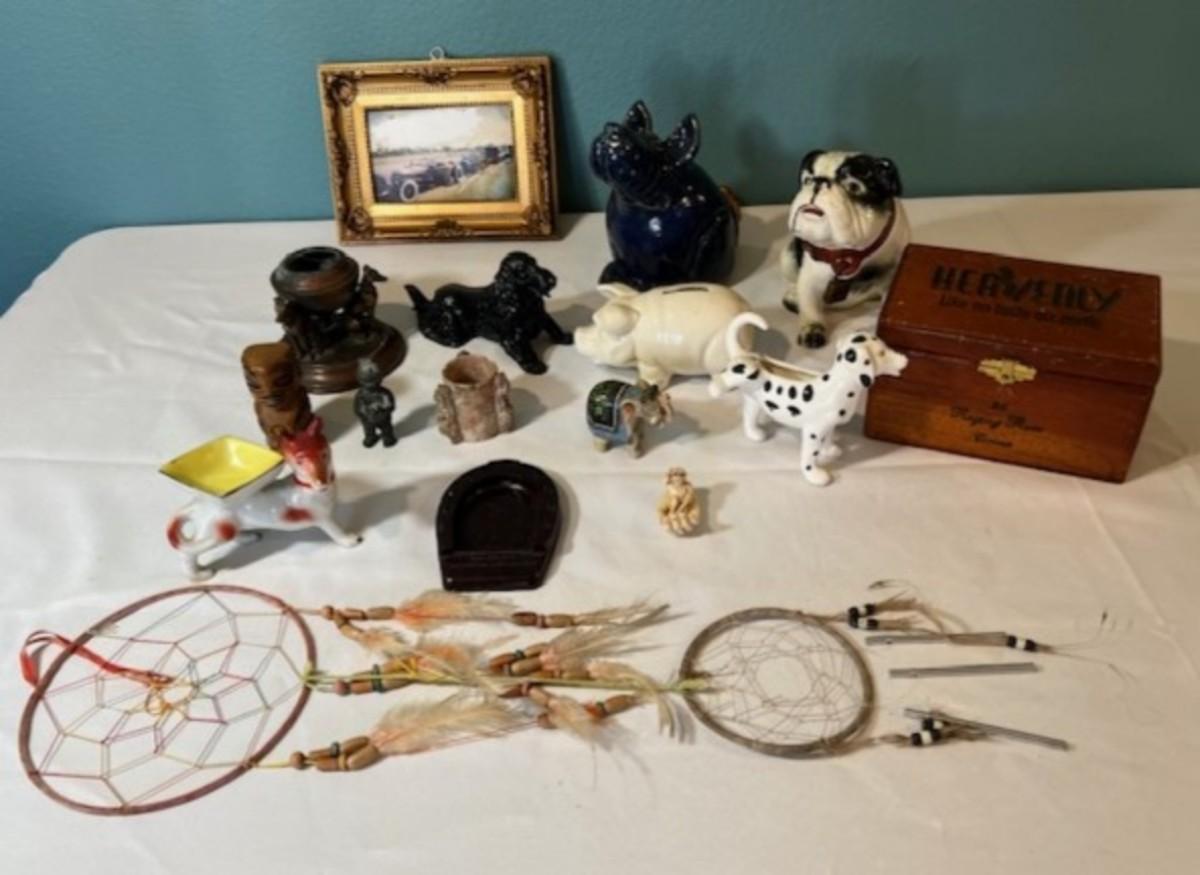 Some are vintage. Includes piggy banks, netsuke, a dreamcatcher, and more. Total of 15+ pieces. Measurement of largest: 8"H.