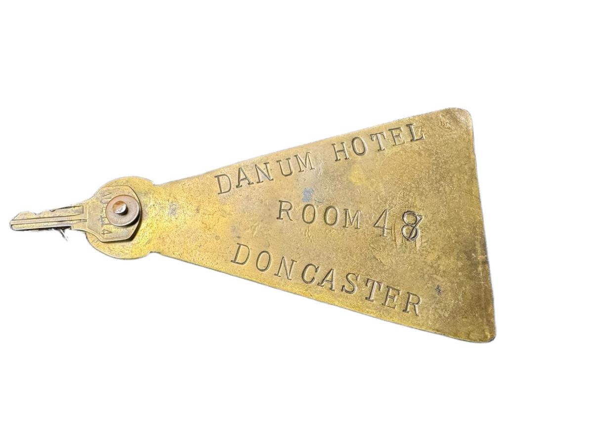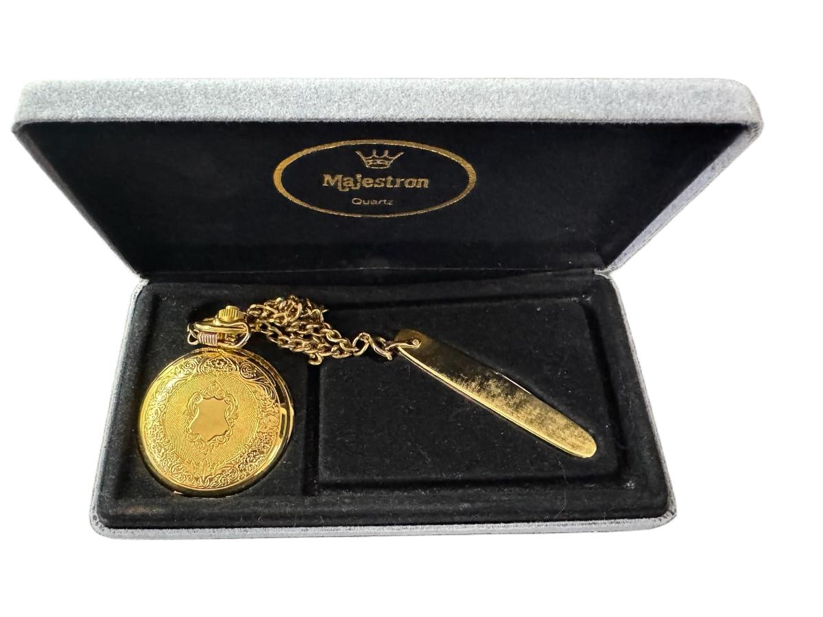 Includes a Majestron pocket watch/knife combo, and a brass Danum hotel key from Doncaster. Total of two pieces. Watch not tested. [RM]