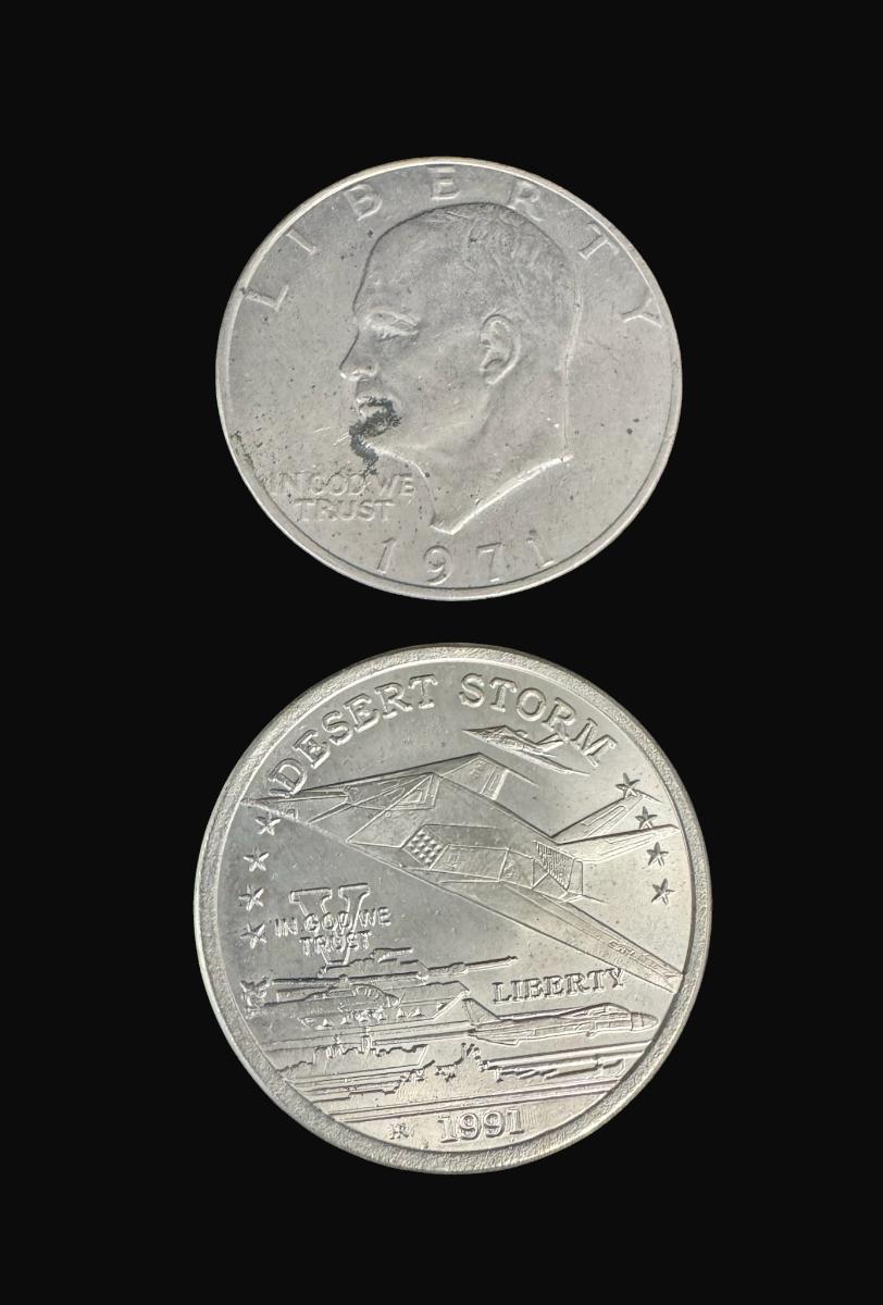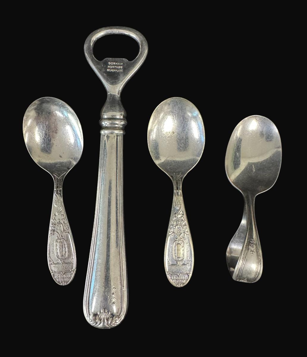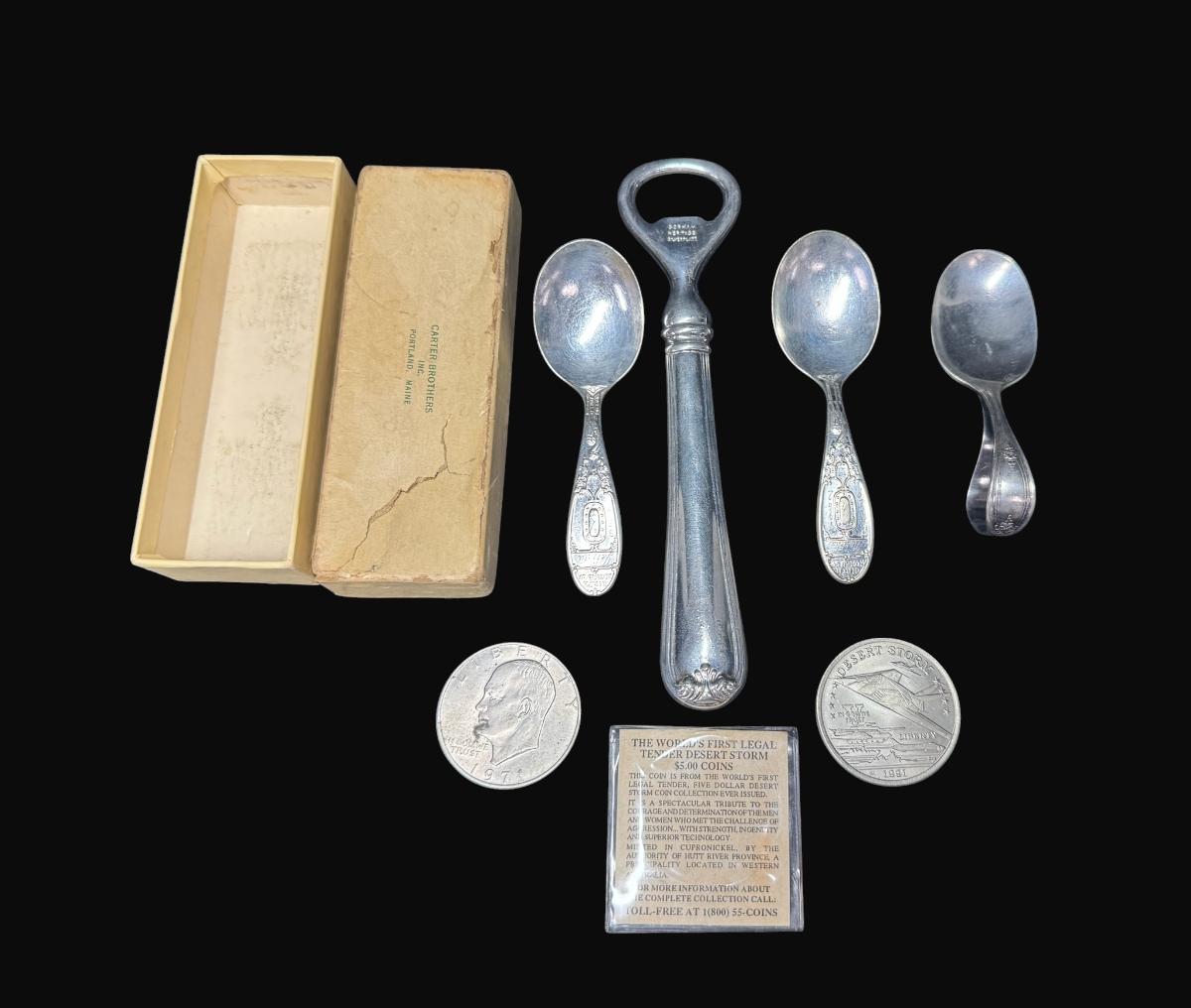 Includes three infant spoons, a bottle opener, a 1971 Eisenhower dollar, and a Desert Storm coin. [RM]