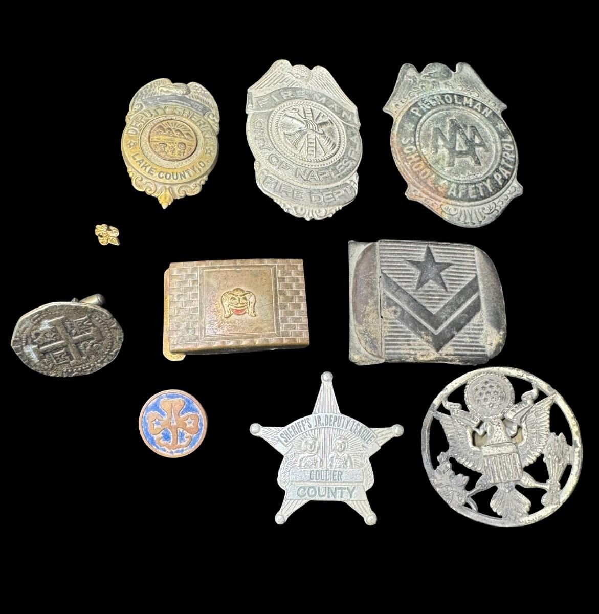 Includes badges, belt buckles, and more. Total of nine pieces. Various metal compositions. Measurement of largest: 2.5”. [KD]