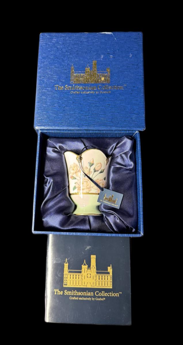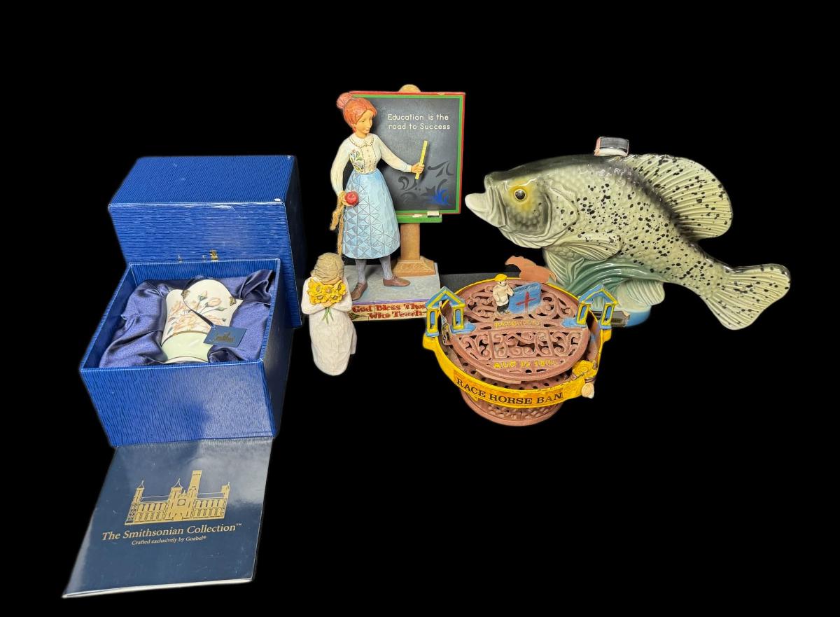 Includes a Jim Beam crappie fish decanter, a cast iron mechanical horse bank, a Jim Shore Heartwood Creek statue, a Smithsonian Goebel tealight in the original box, and a Willow Tree Warm Embrace statue. Total of five pieces. Measurement of longest: 13”. [CS]