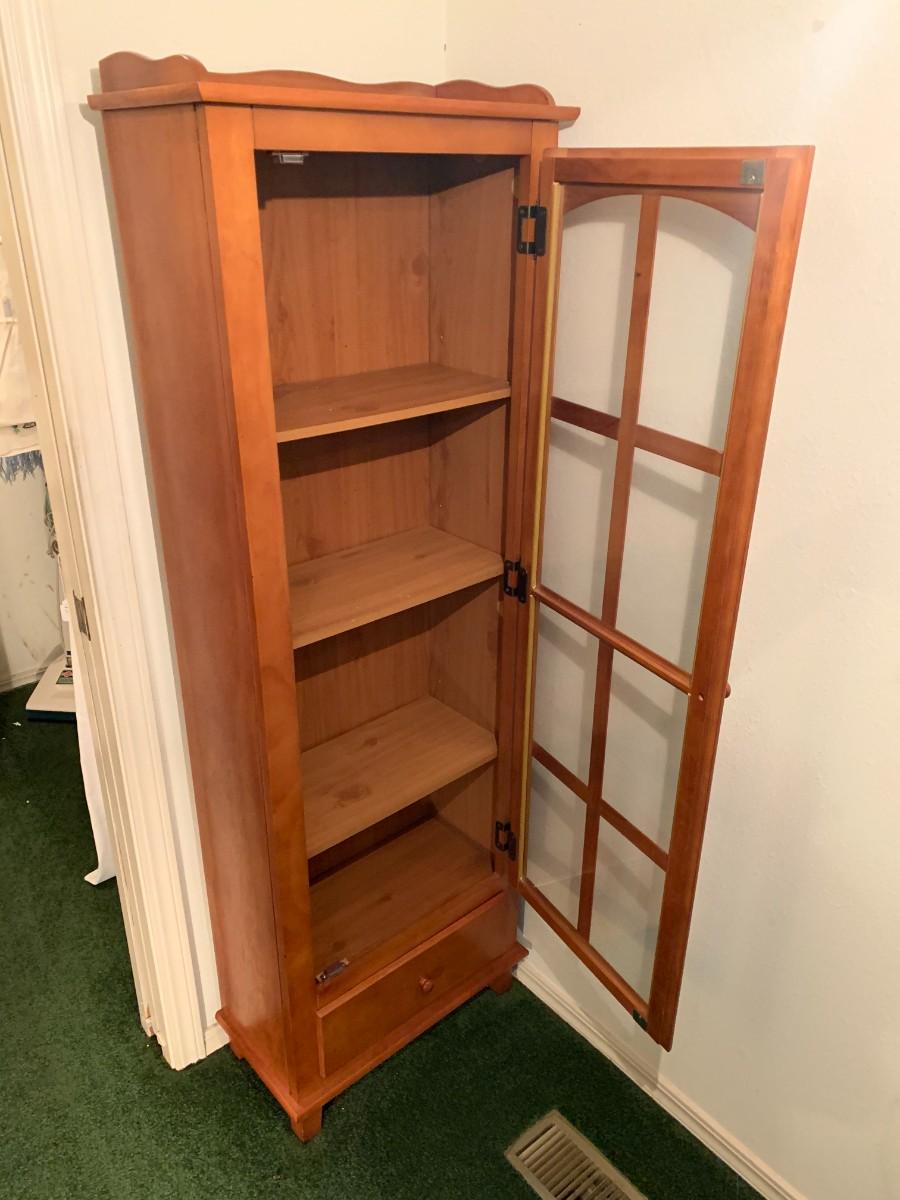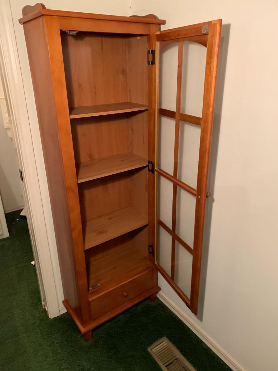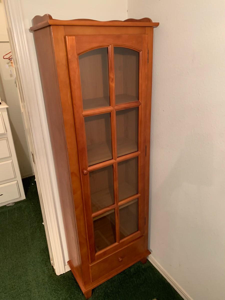 Nice glass front cabinet to keep your treasures displayed. Stands approximately 5'6" tall and is approximately 12" wide and 8" deep. Very good condition.