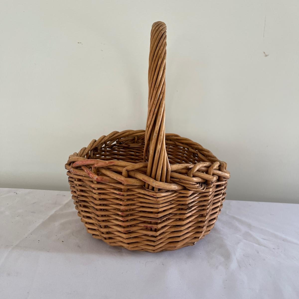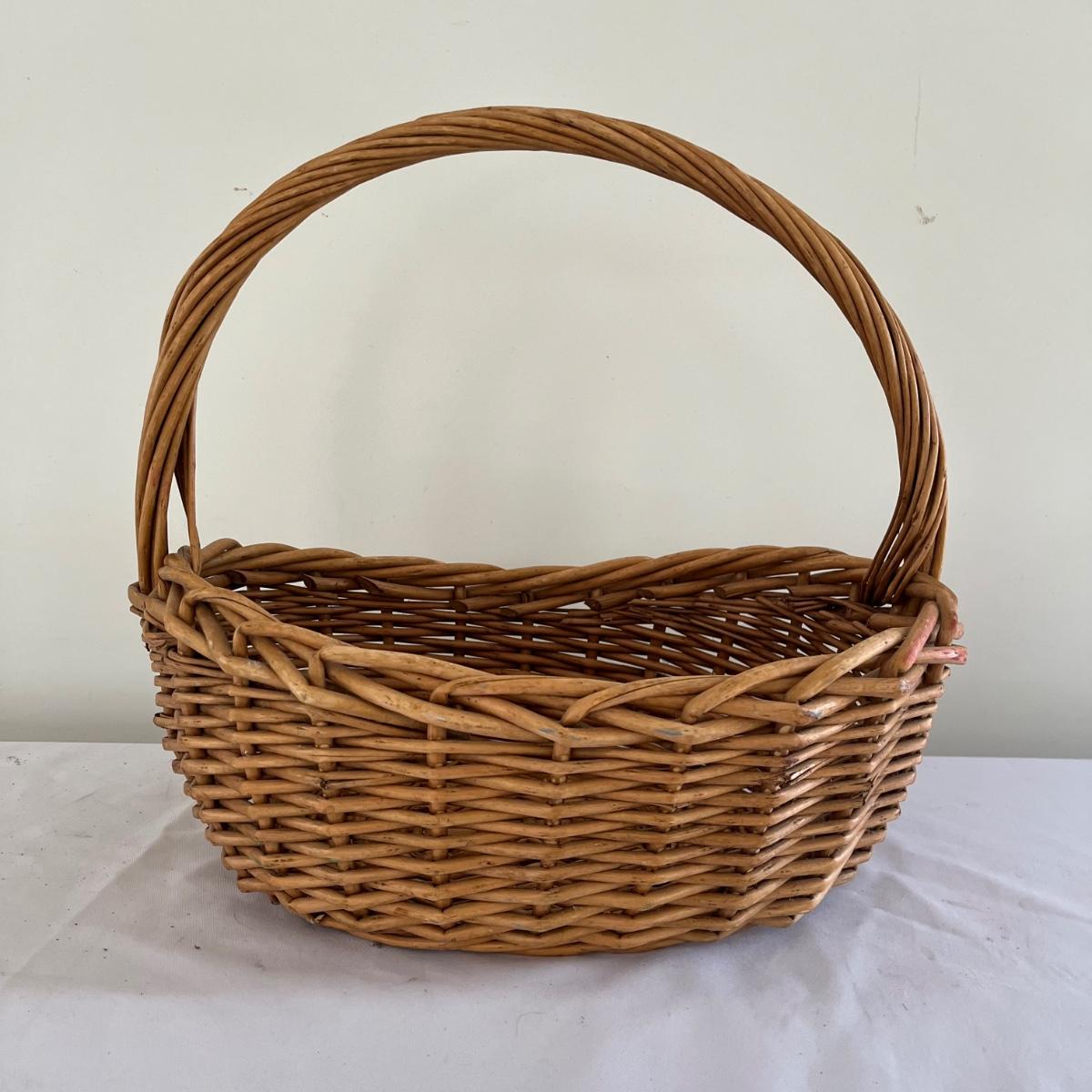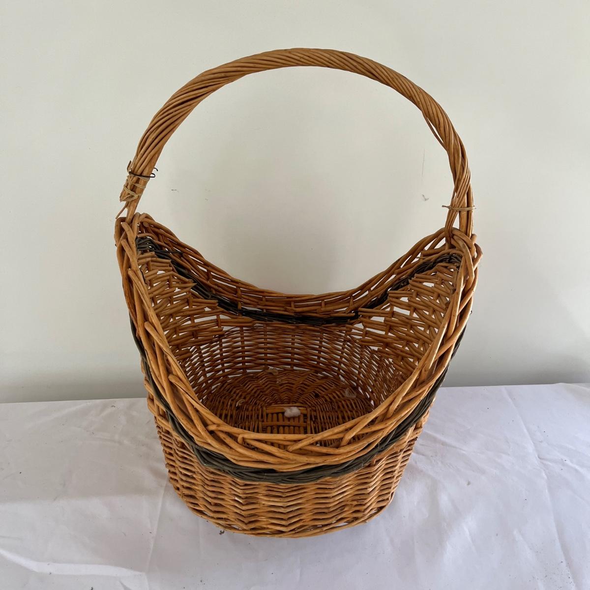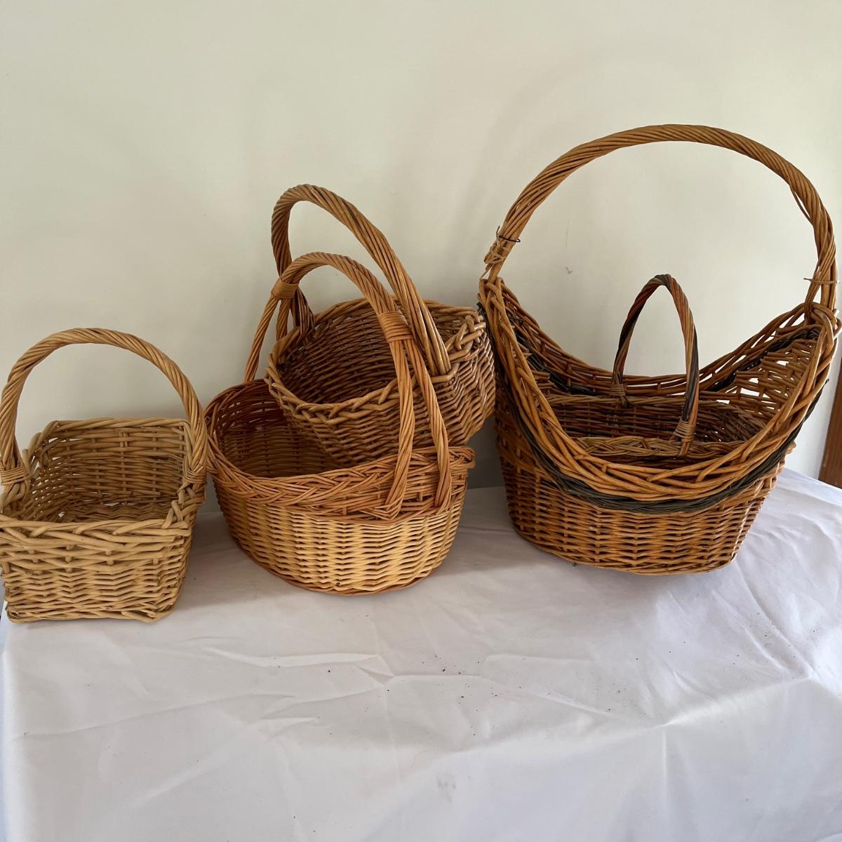 Lot includes includes five woven baskets with handles in a variety of sizes, styles and shapes. Largest basket measures 22”D x 24.5” tall.