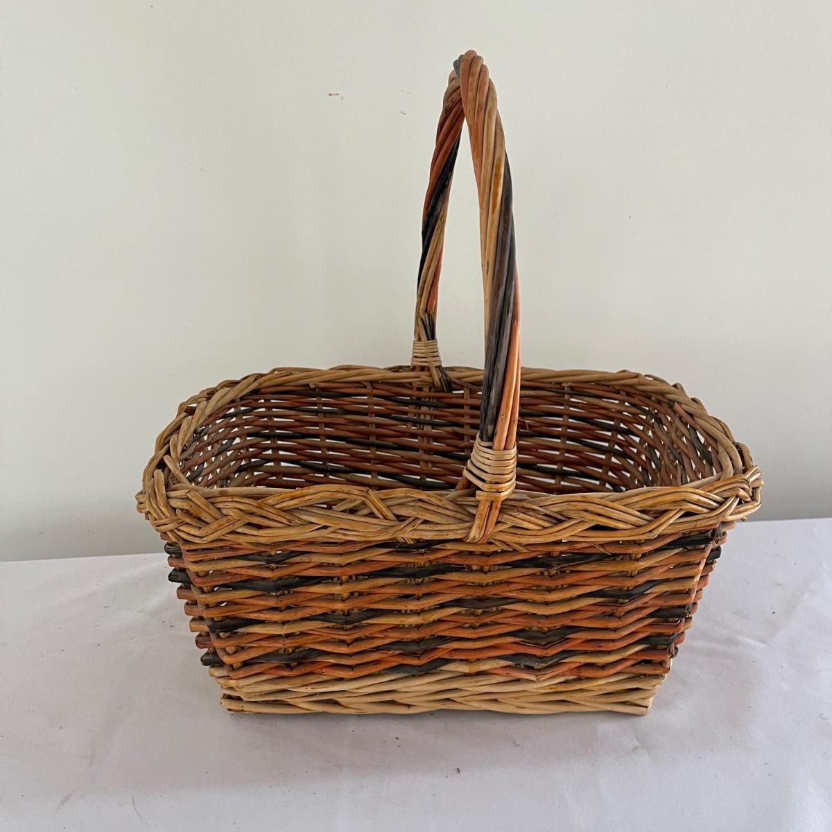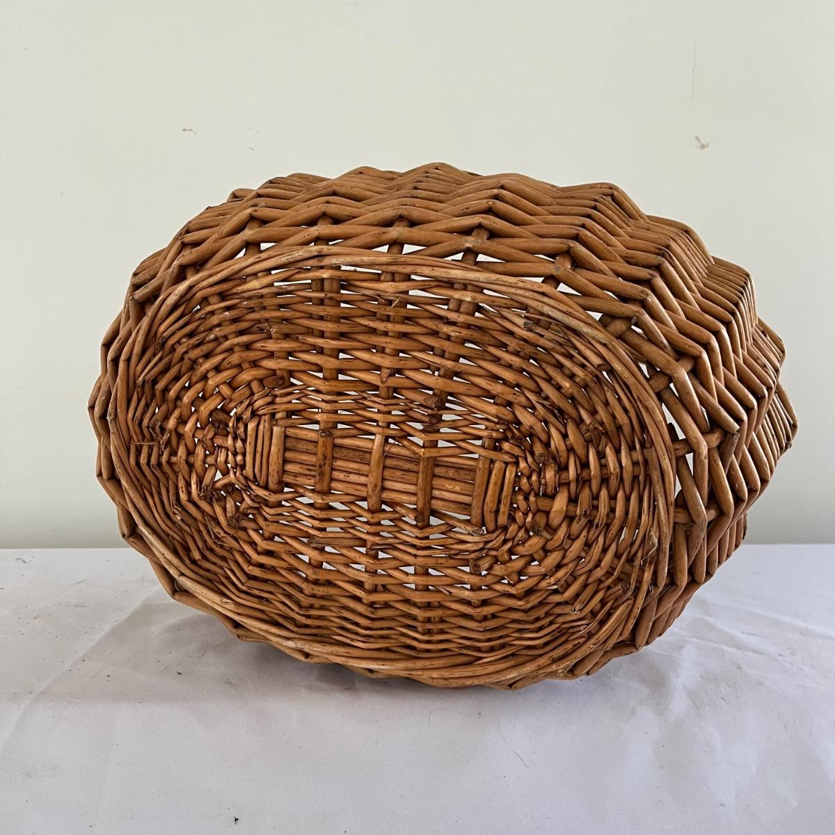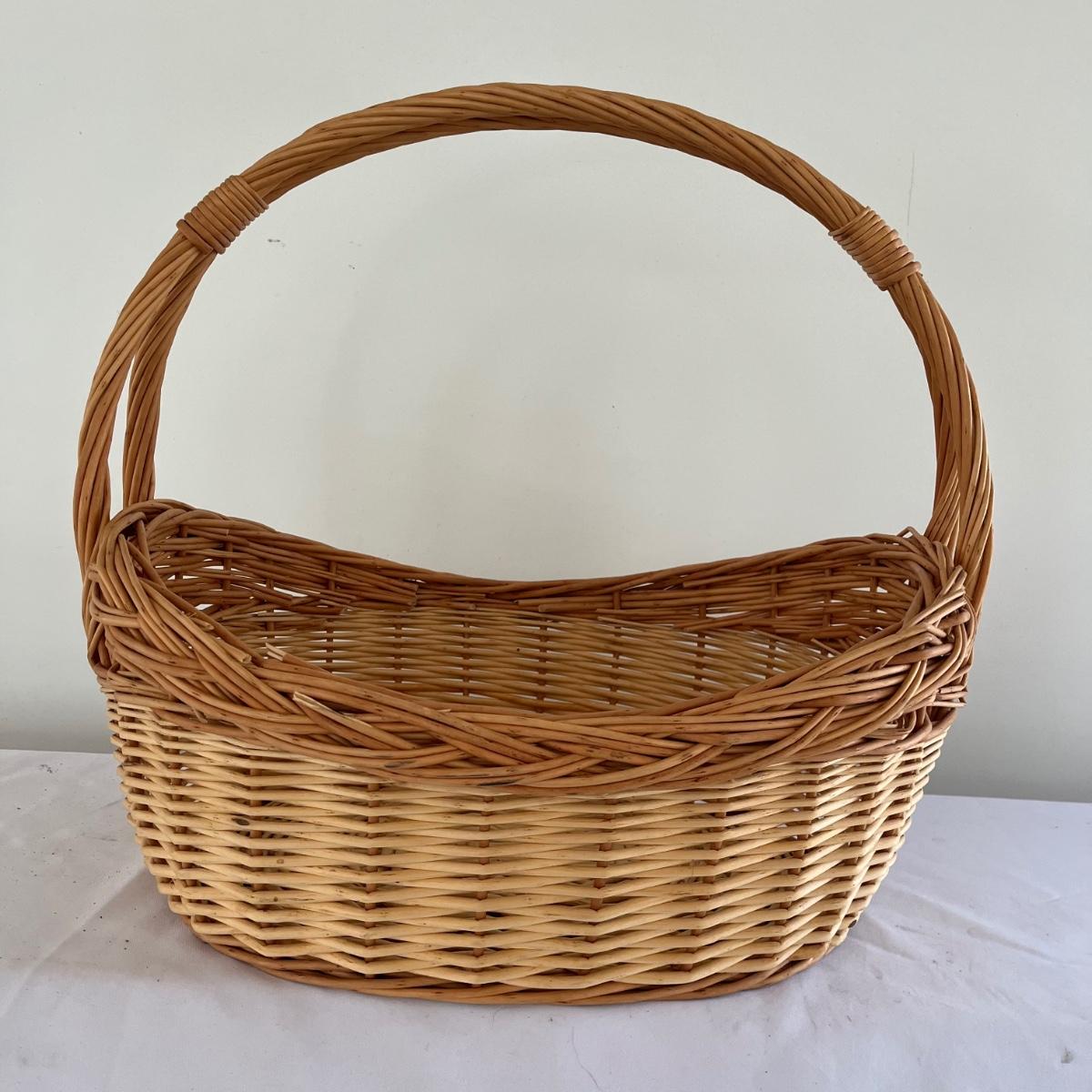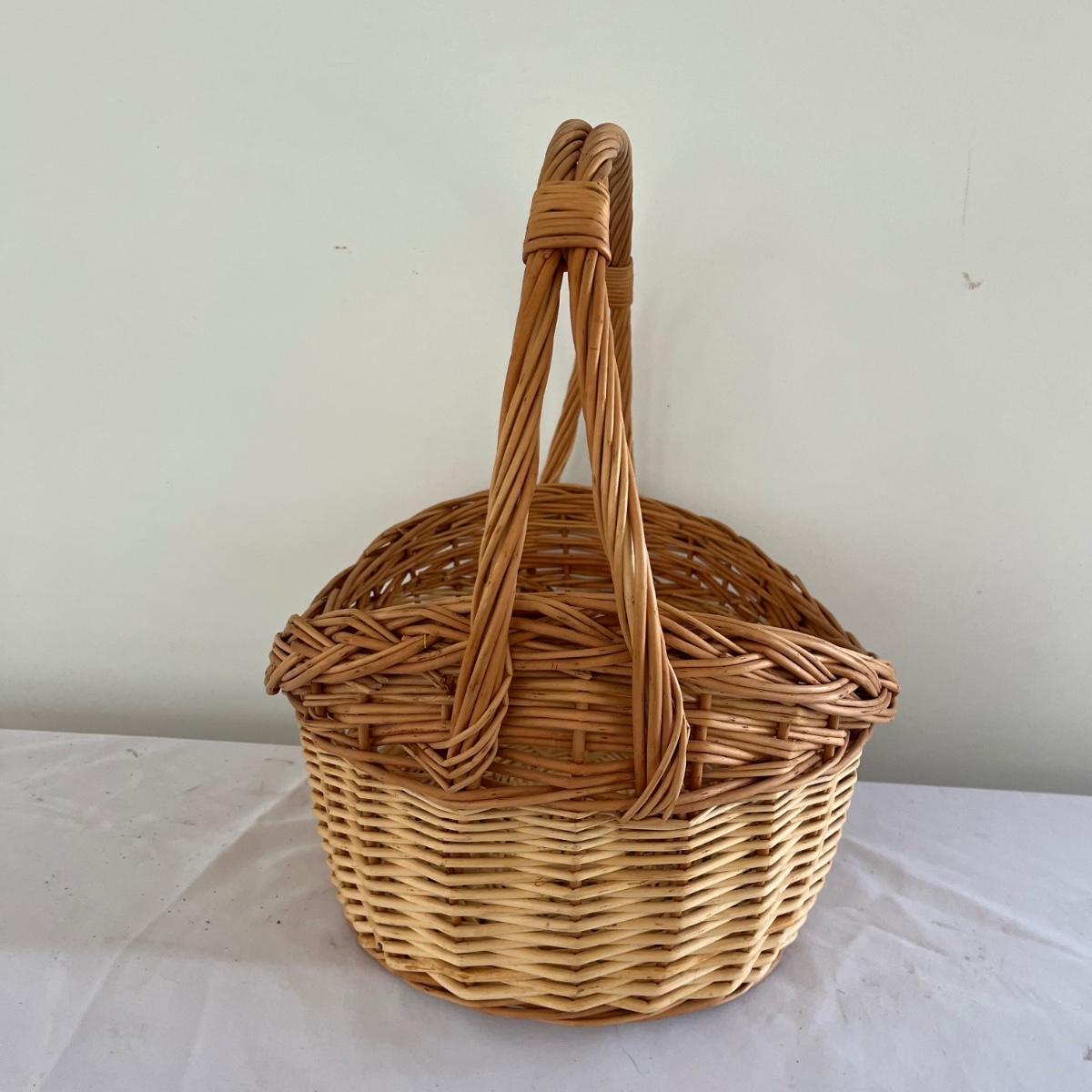 Lot includes includes five woven baskets with handles in a variety of sizes, styles and shapes. Largest basket measures 22”D x 24.5” tall.