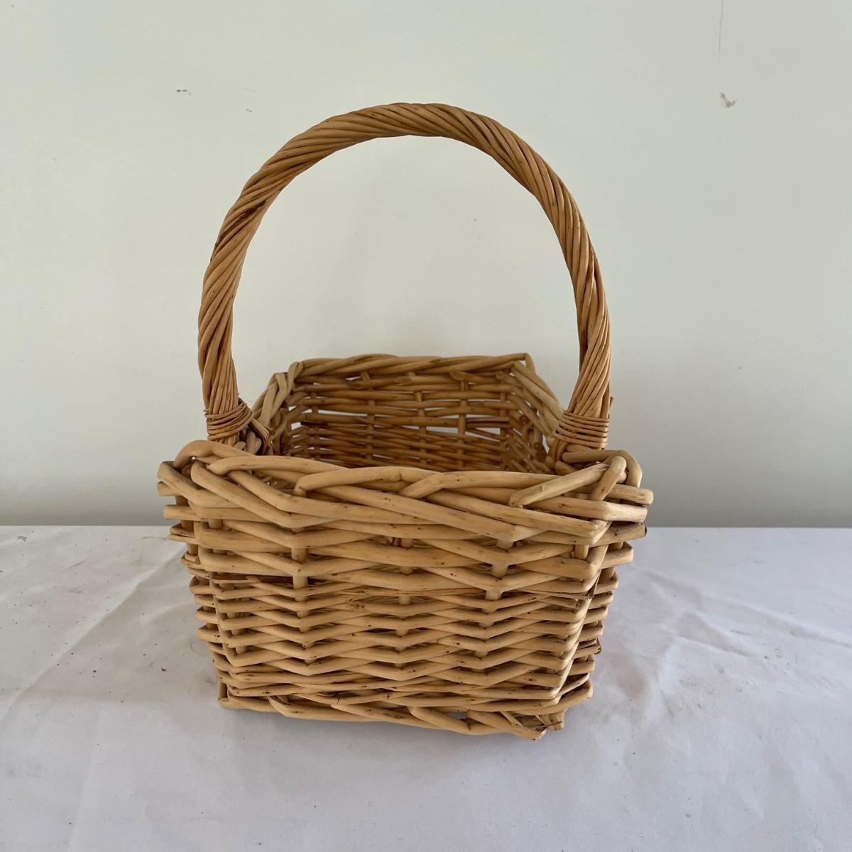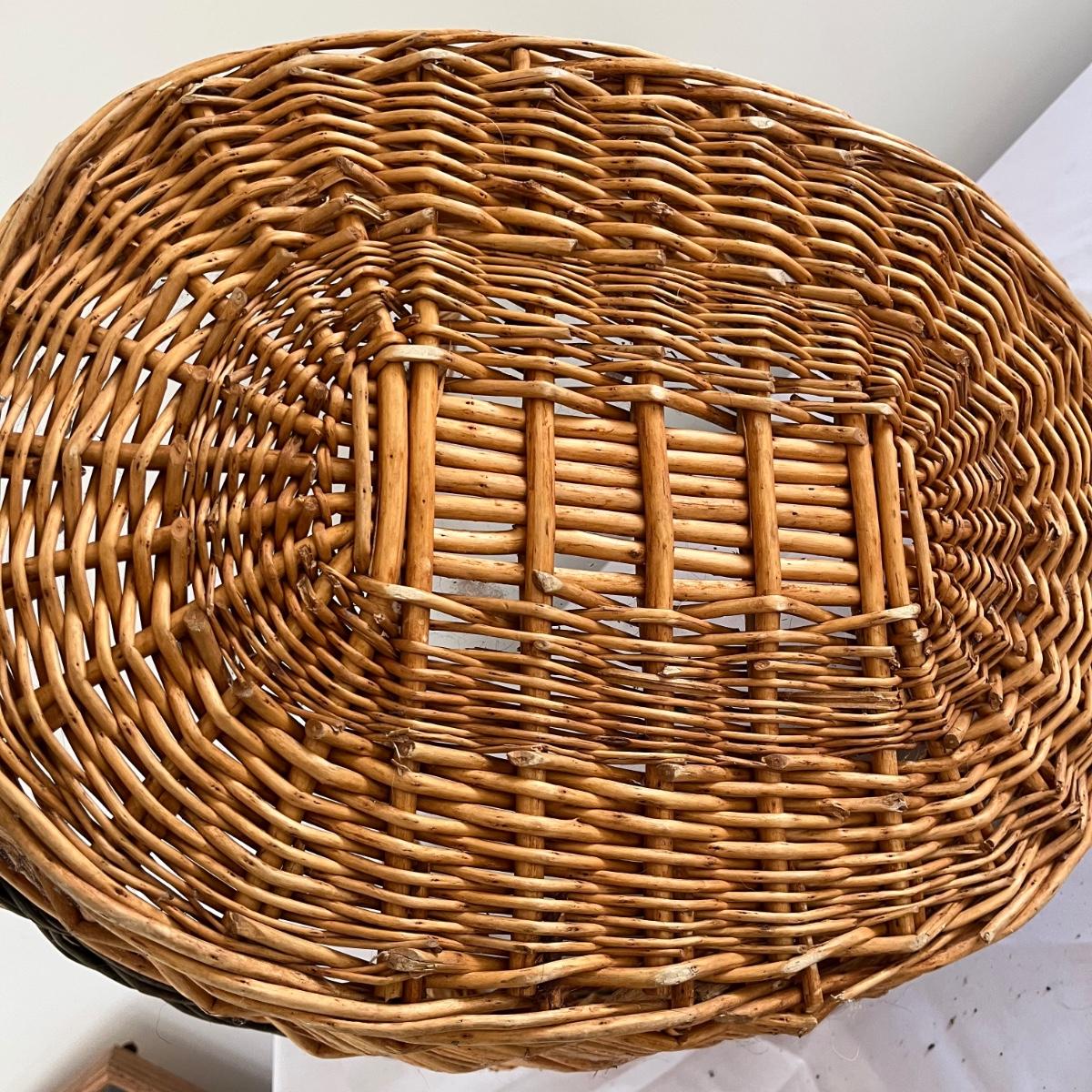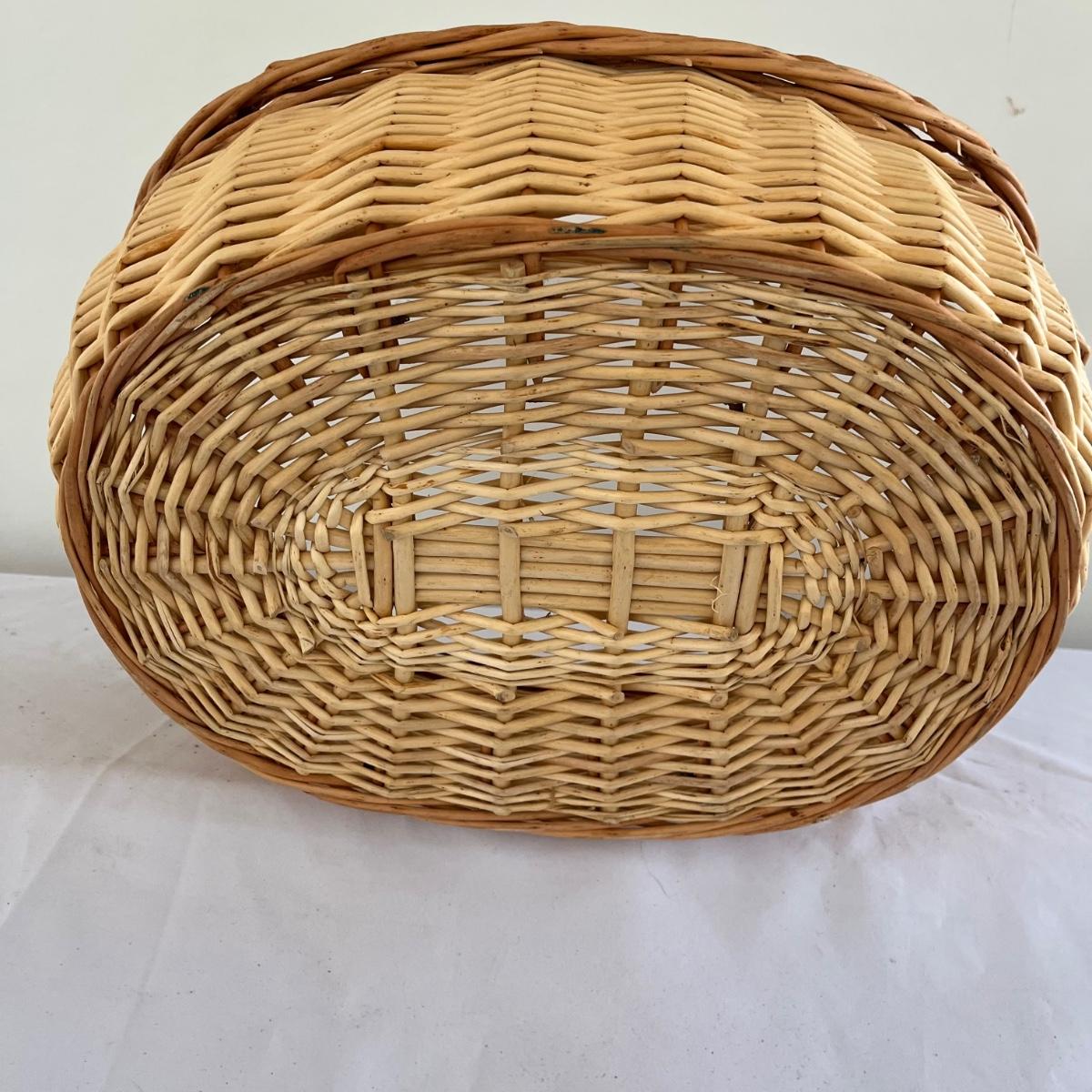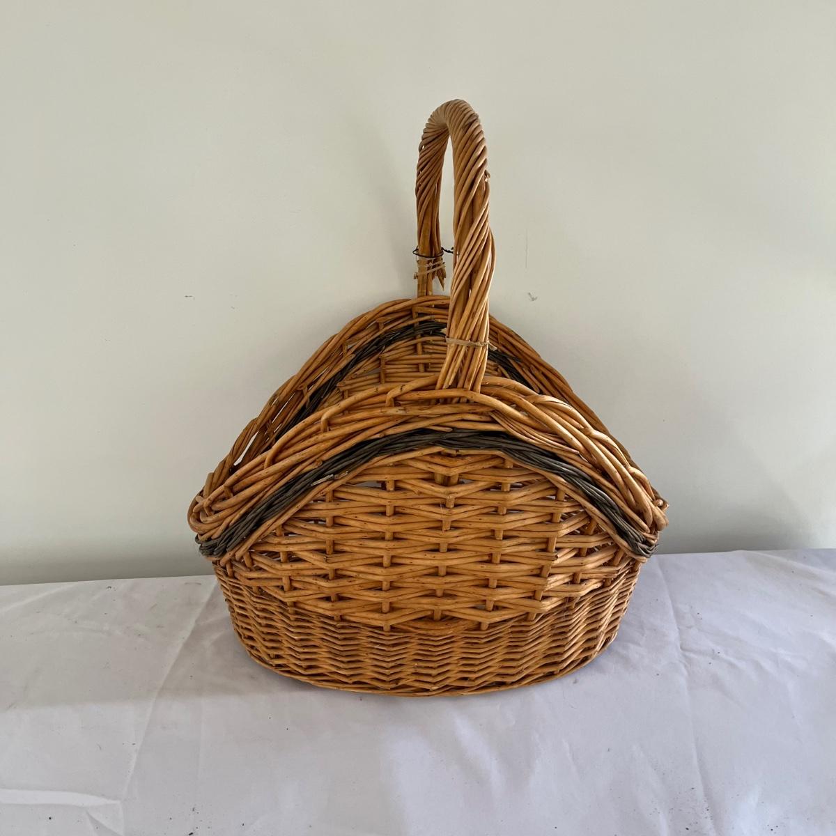 Lot includes includes five woven baskets with handles in a variety of sizes, styles and shapes. Largest basket measures 22”D x 24.5” tall.