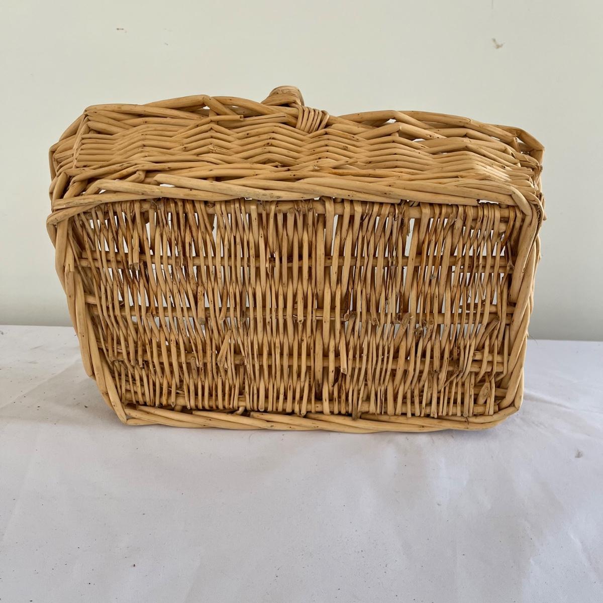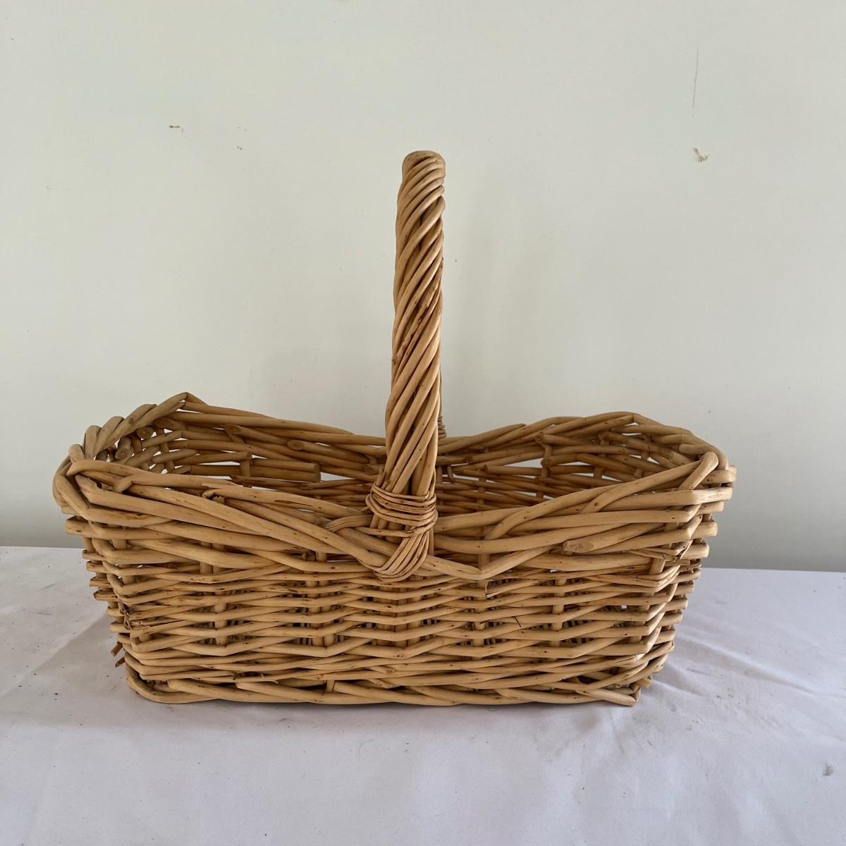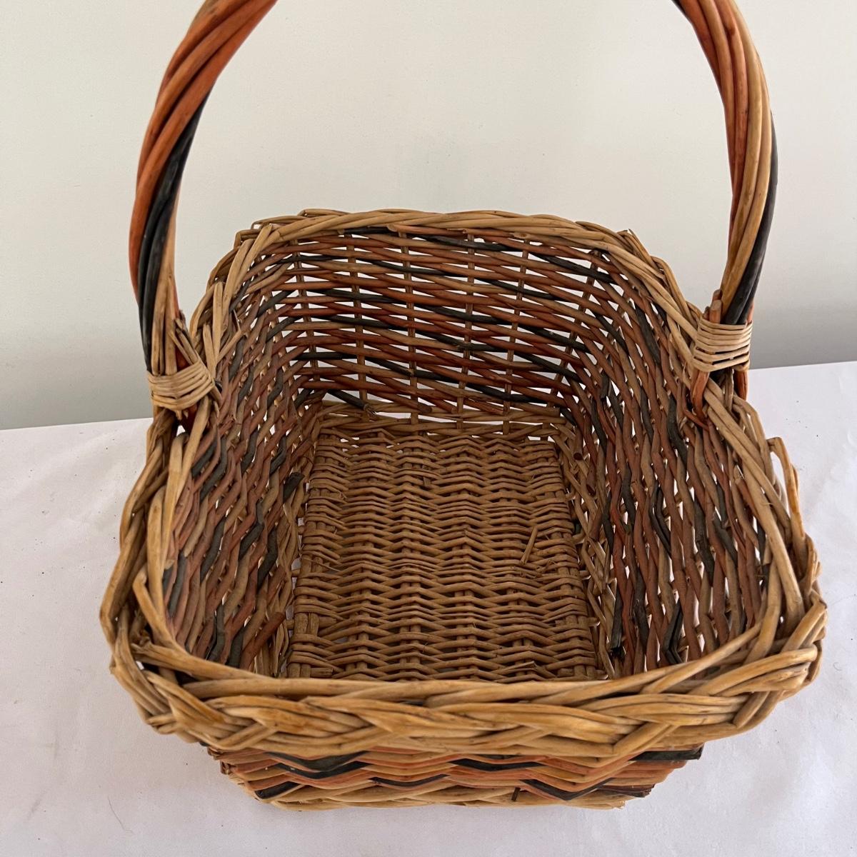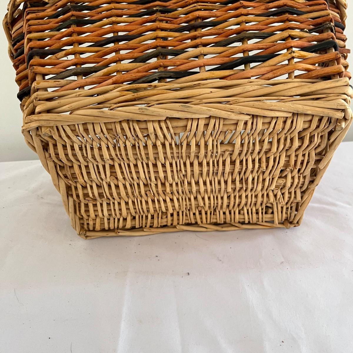 Lot includes includes five woven baskets with handles in a variety of sizes, styles and shapes. Largest basket measures 22”D x 24.5” tall.