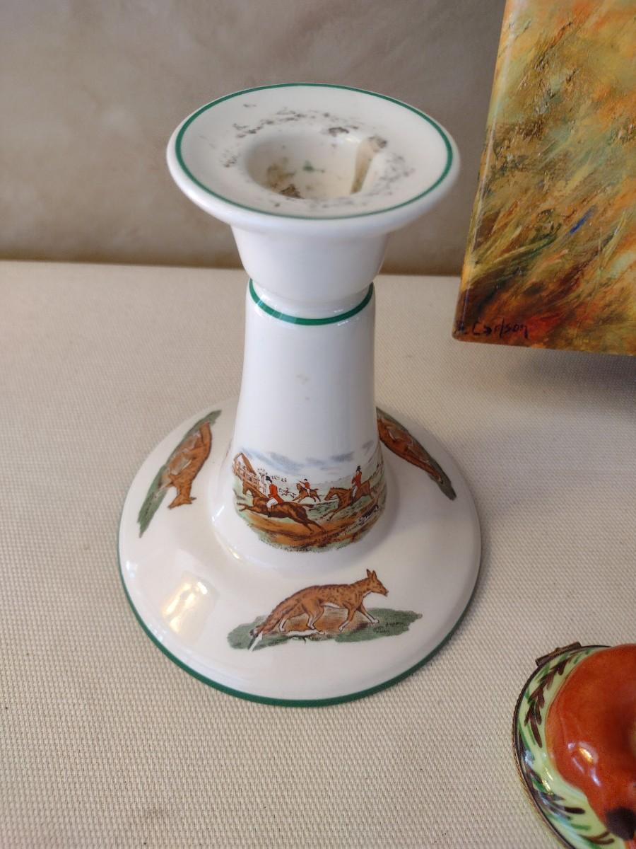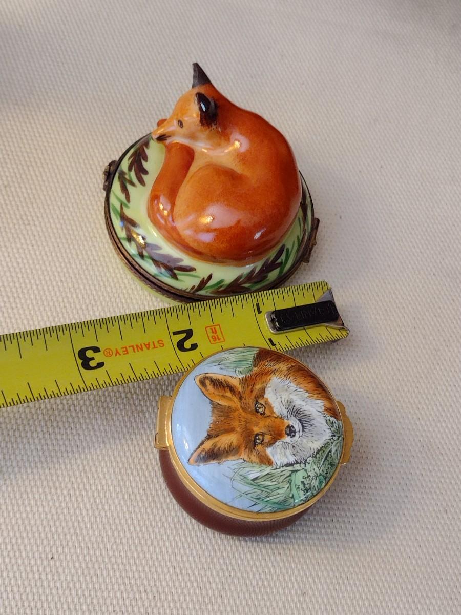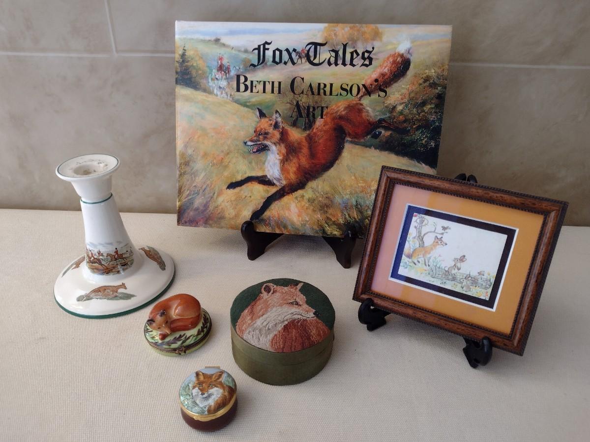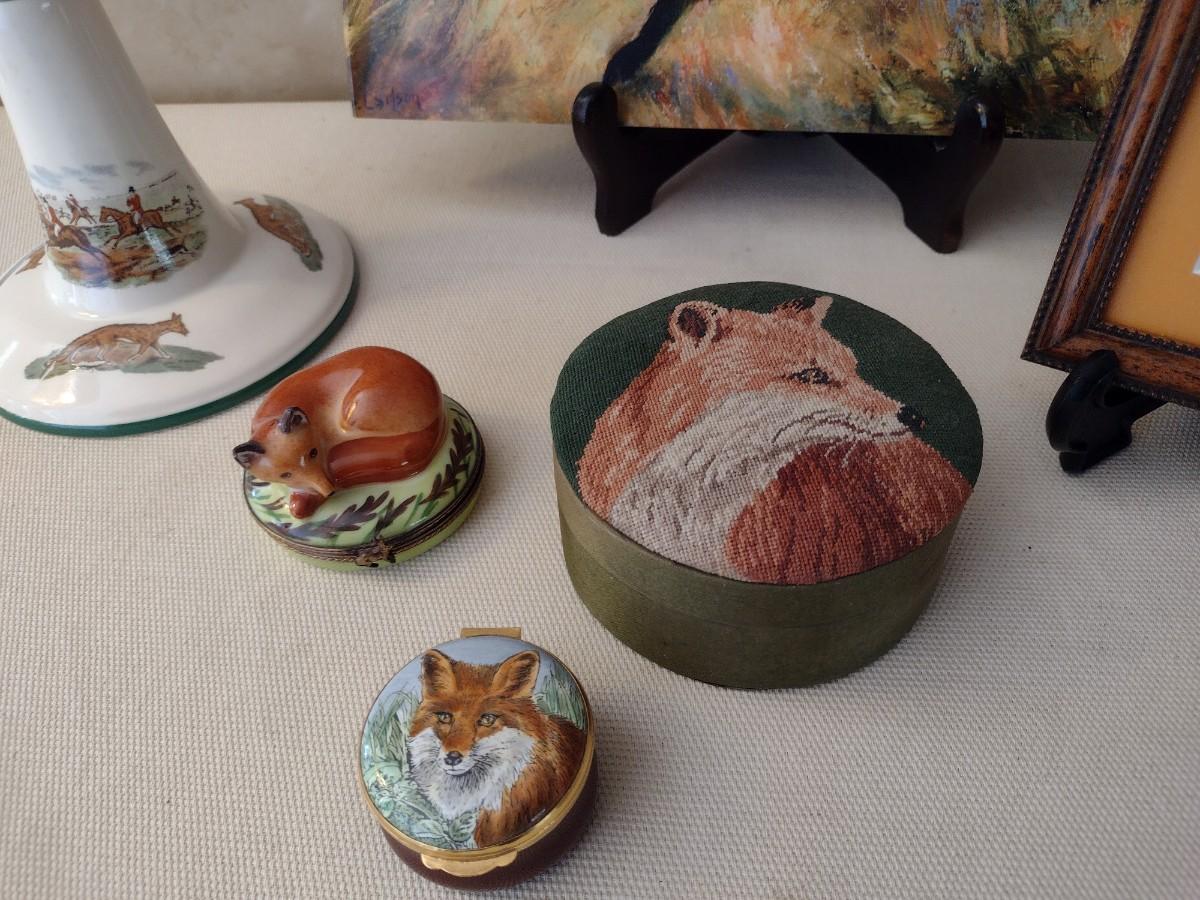 Collection of Fox Themed Collector Items including Limoges Trinket Boxes, Spode Candle Holder, and Other