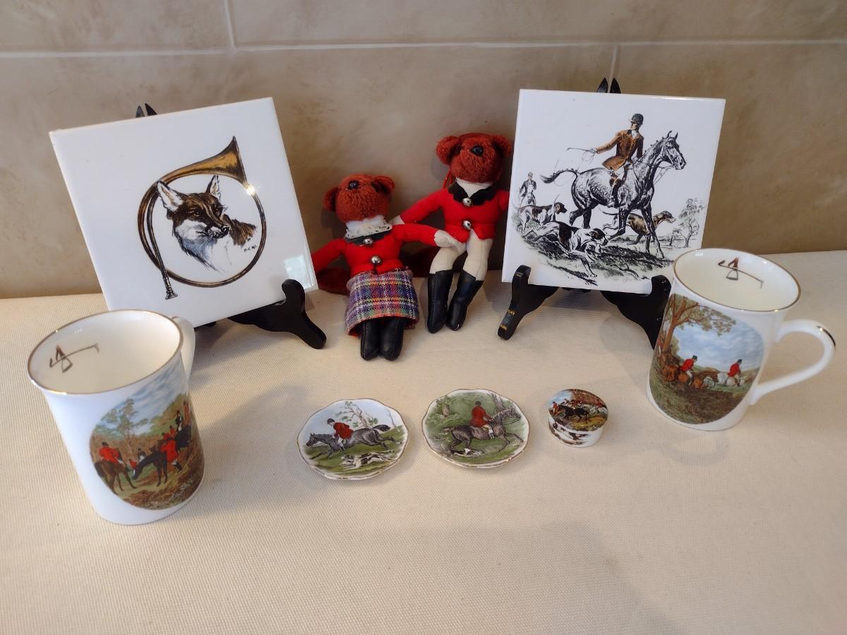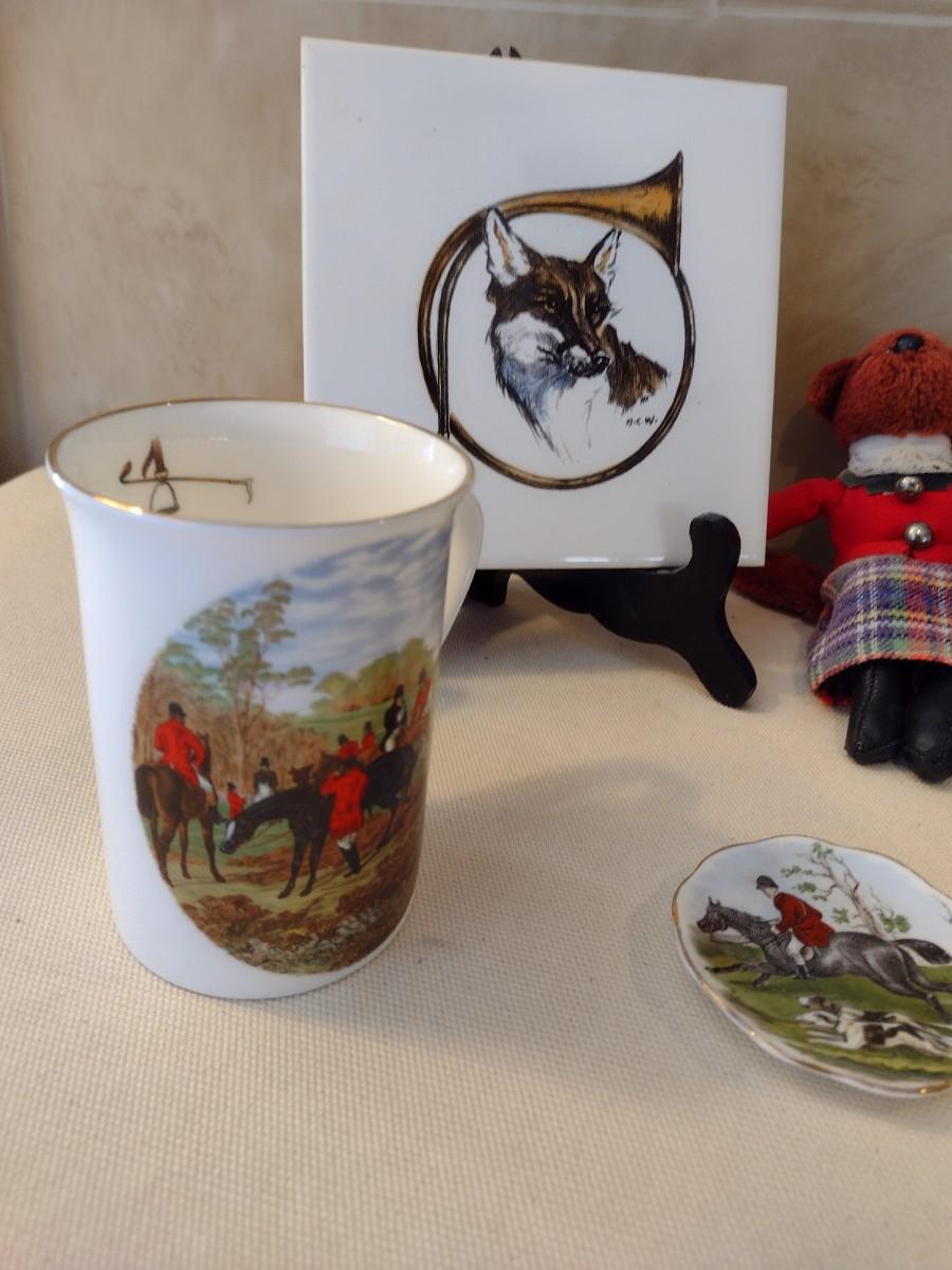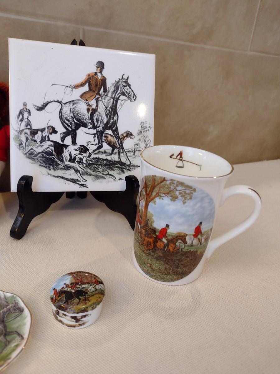 Collection of Hunter Themed Items includes Painted Tiles, Crown Victorian Mugs, and Fine China Plates