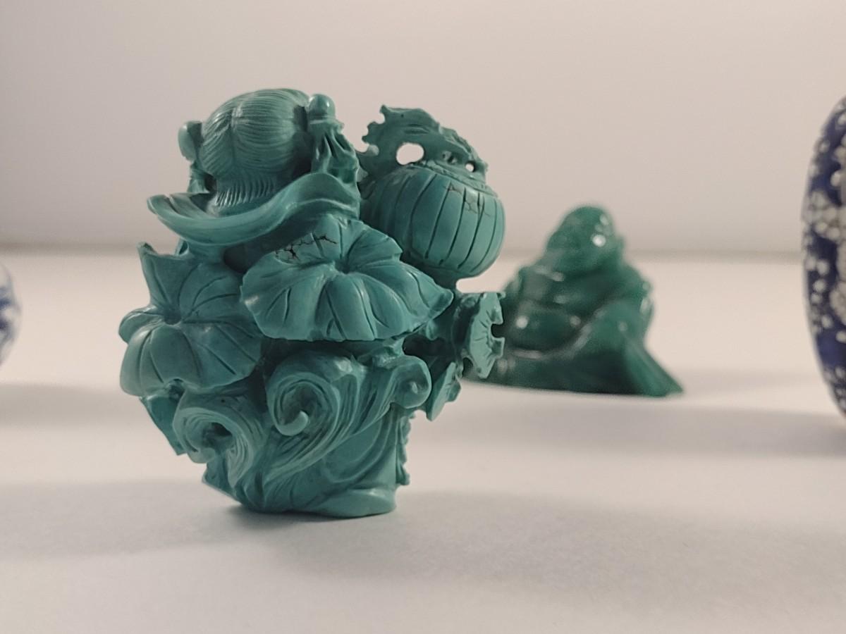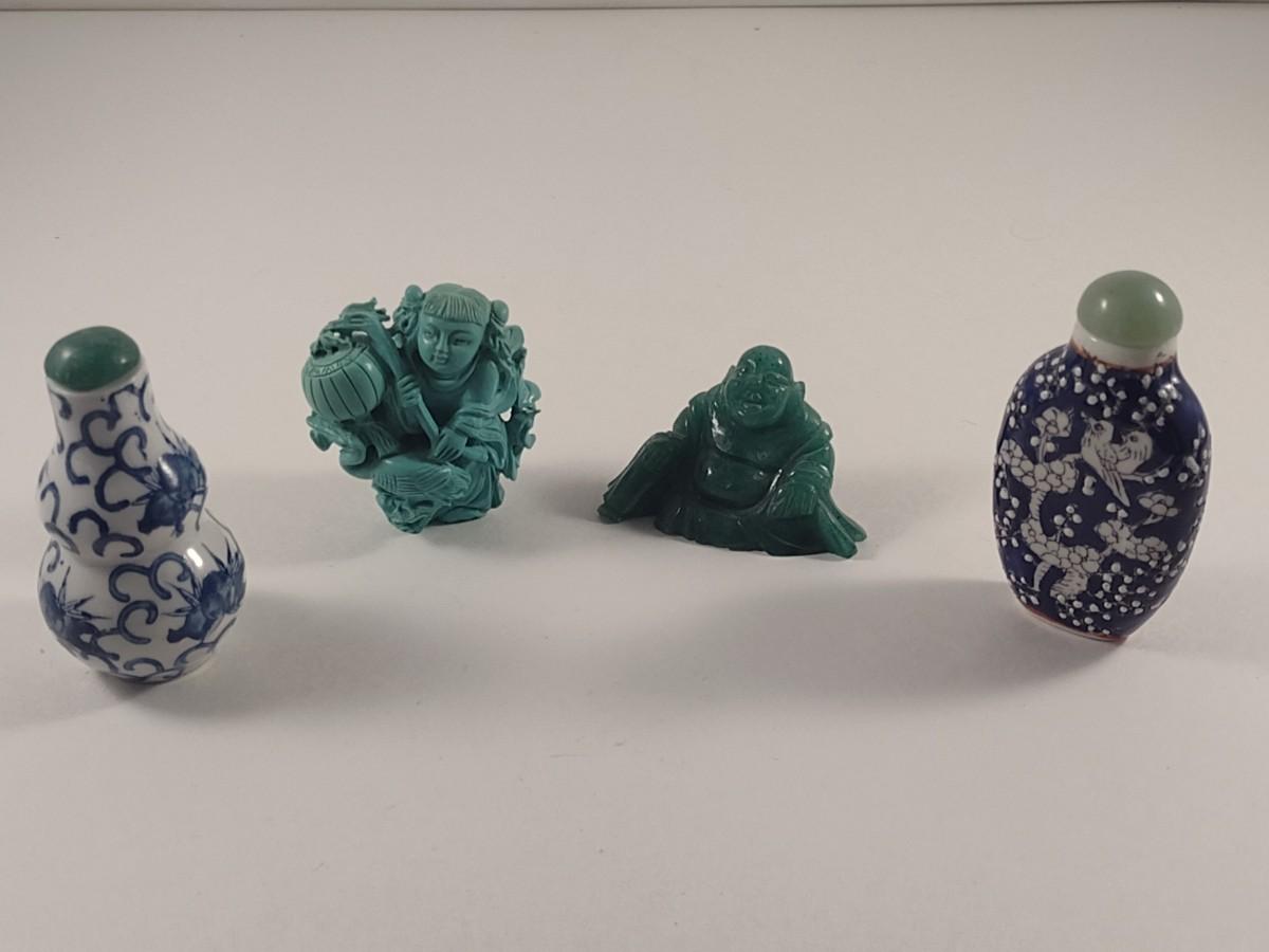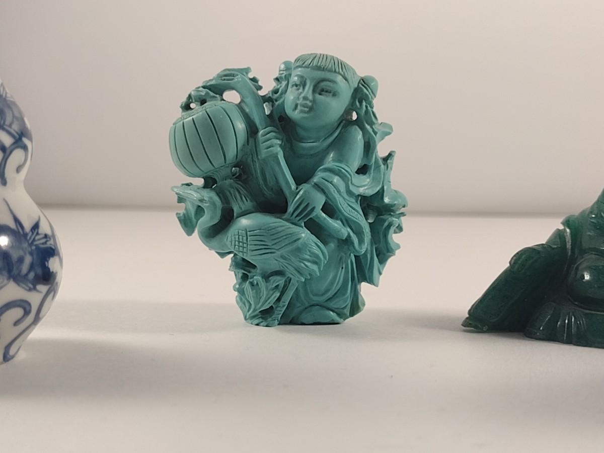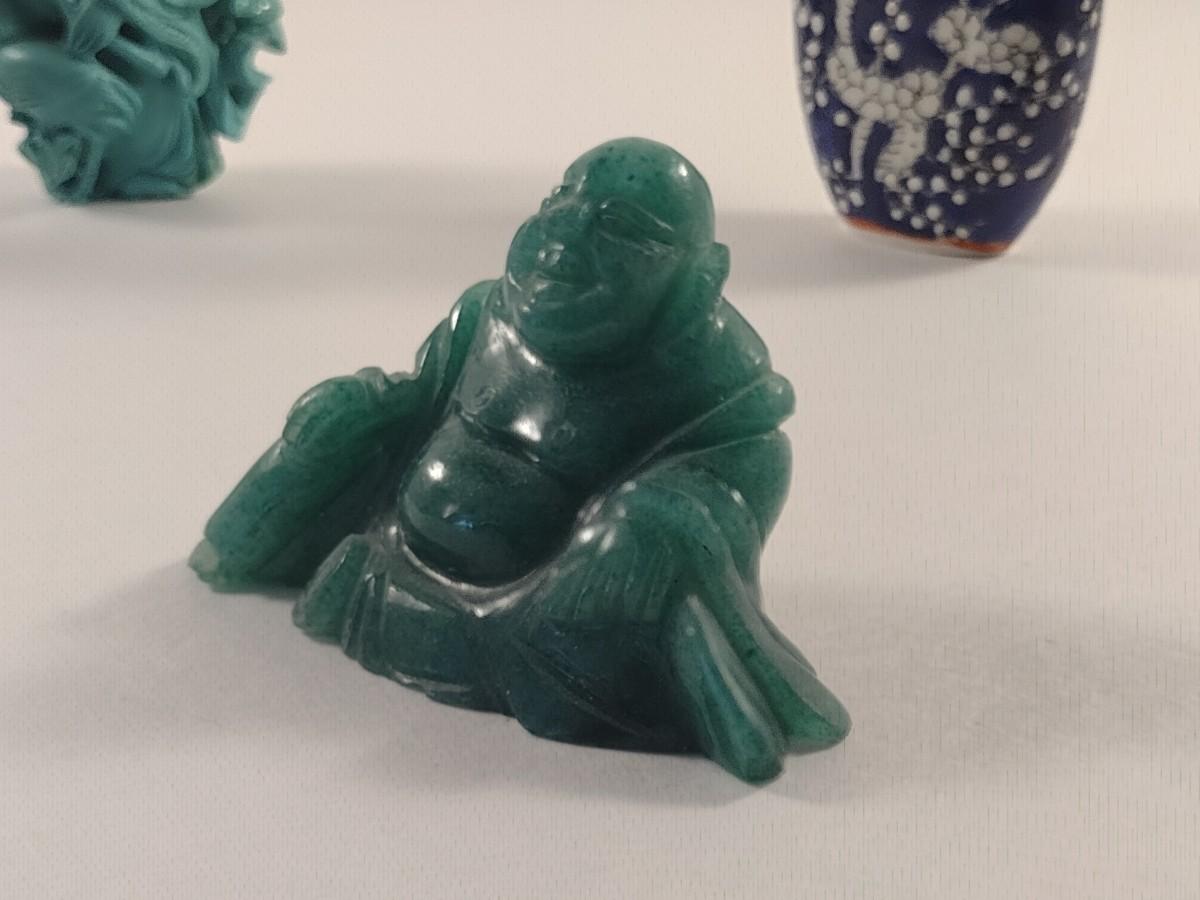 Collection of Asian Themed Items include Jade Buddha, Carved Netsuke, and Two Porcelain Snuff Bottles