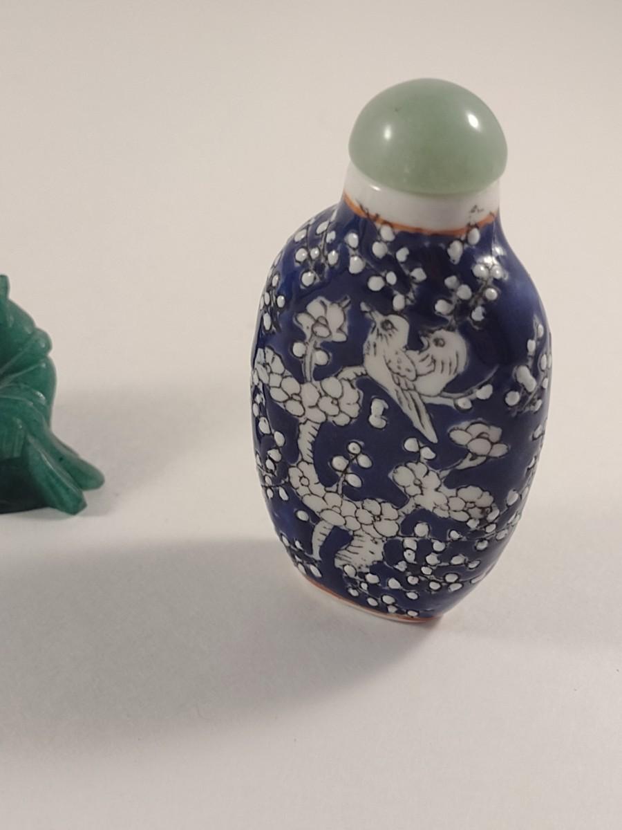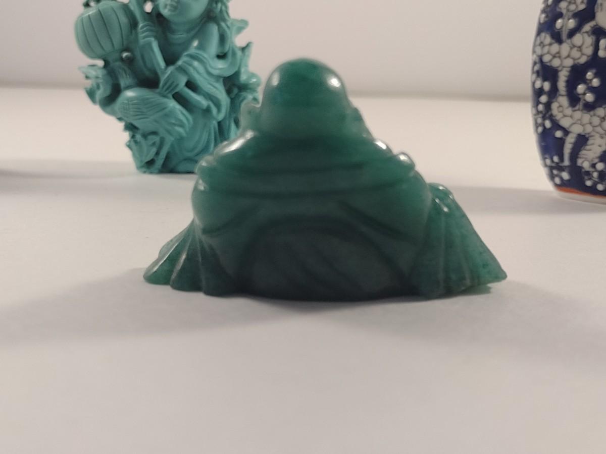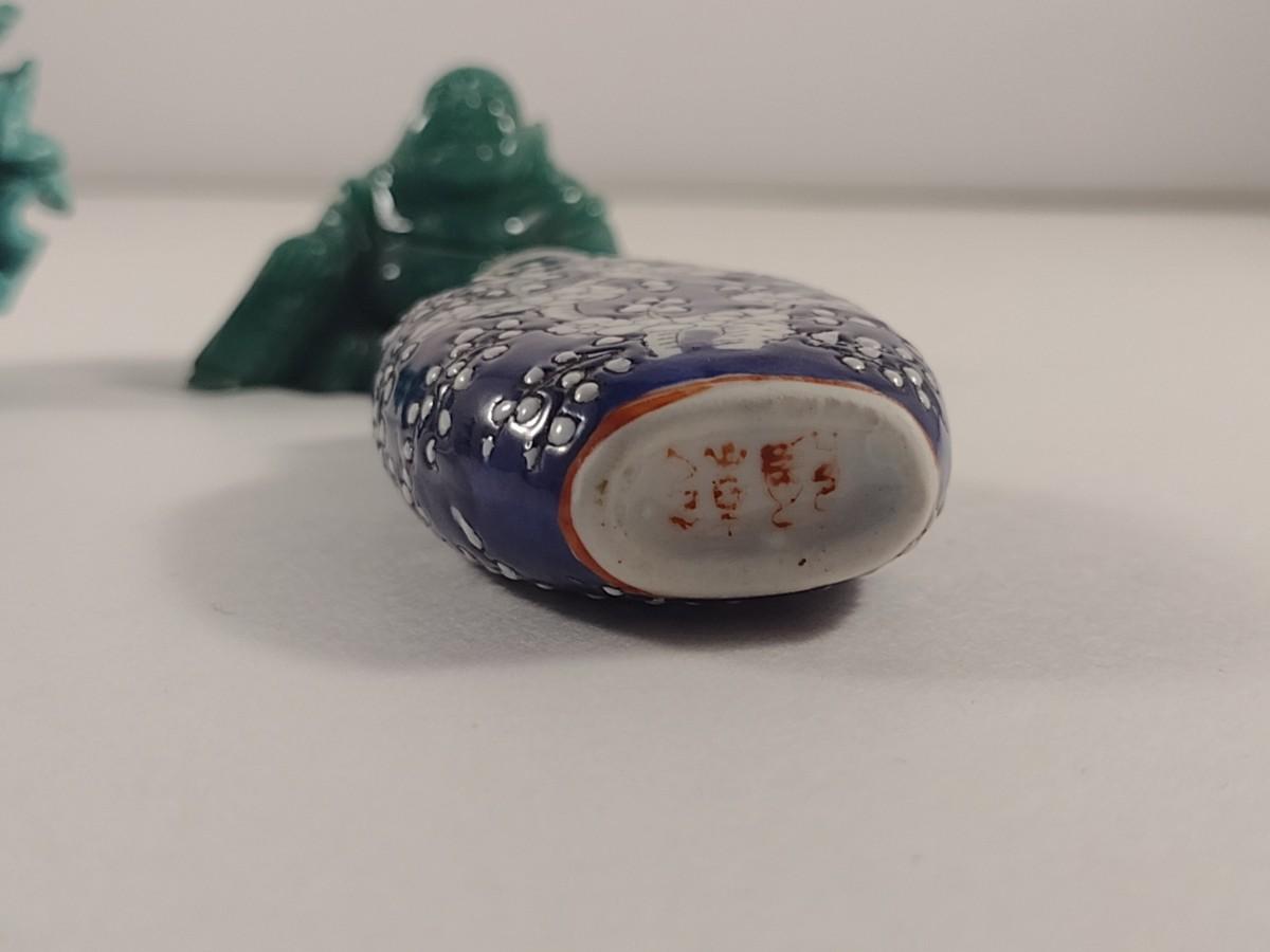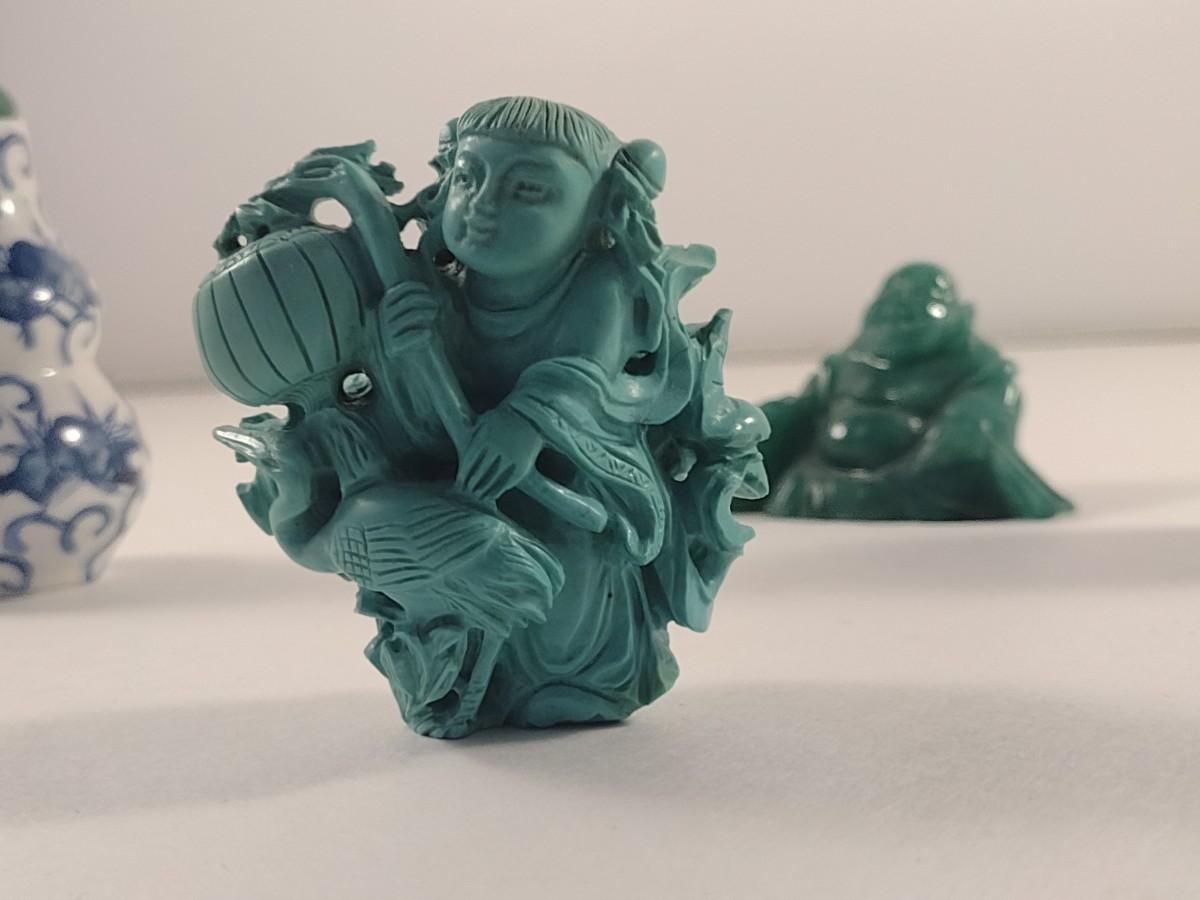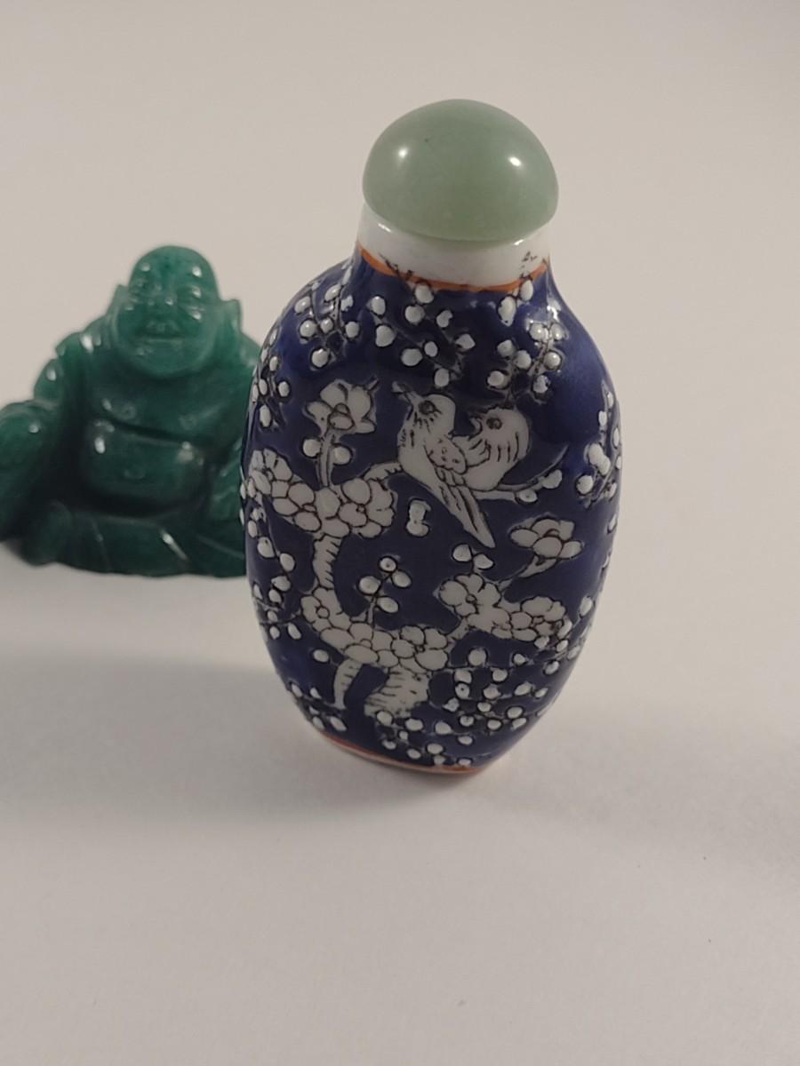 Collection of Asian Themed Items include Jade Buddha, Carved Netsuke, and Two Porcelain Snuff Bottles