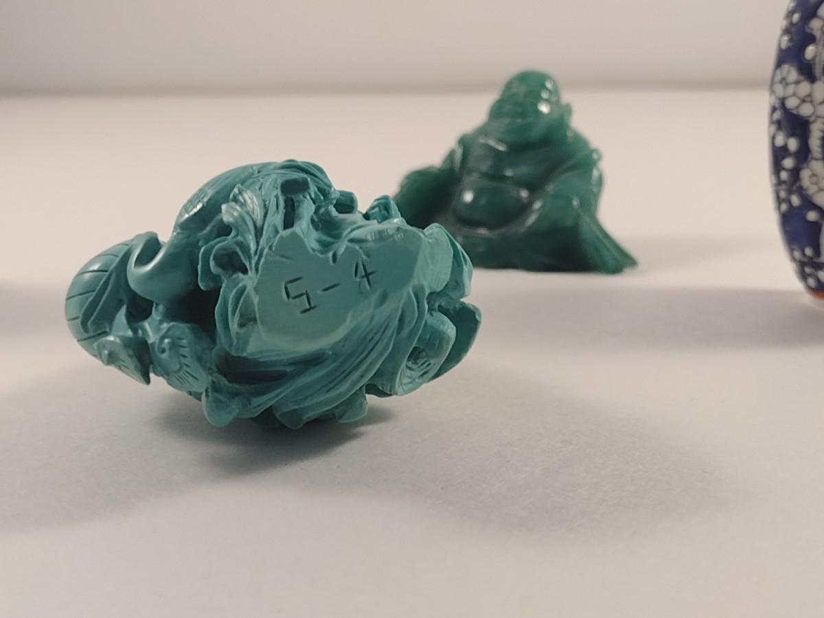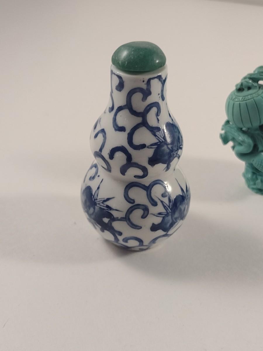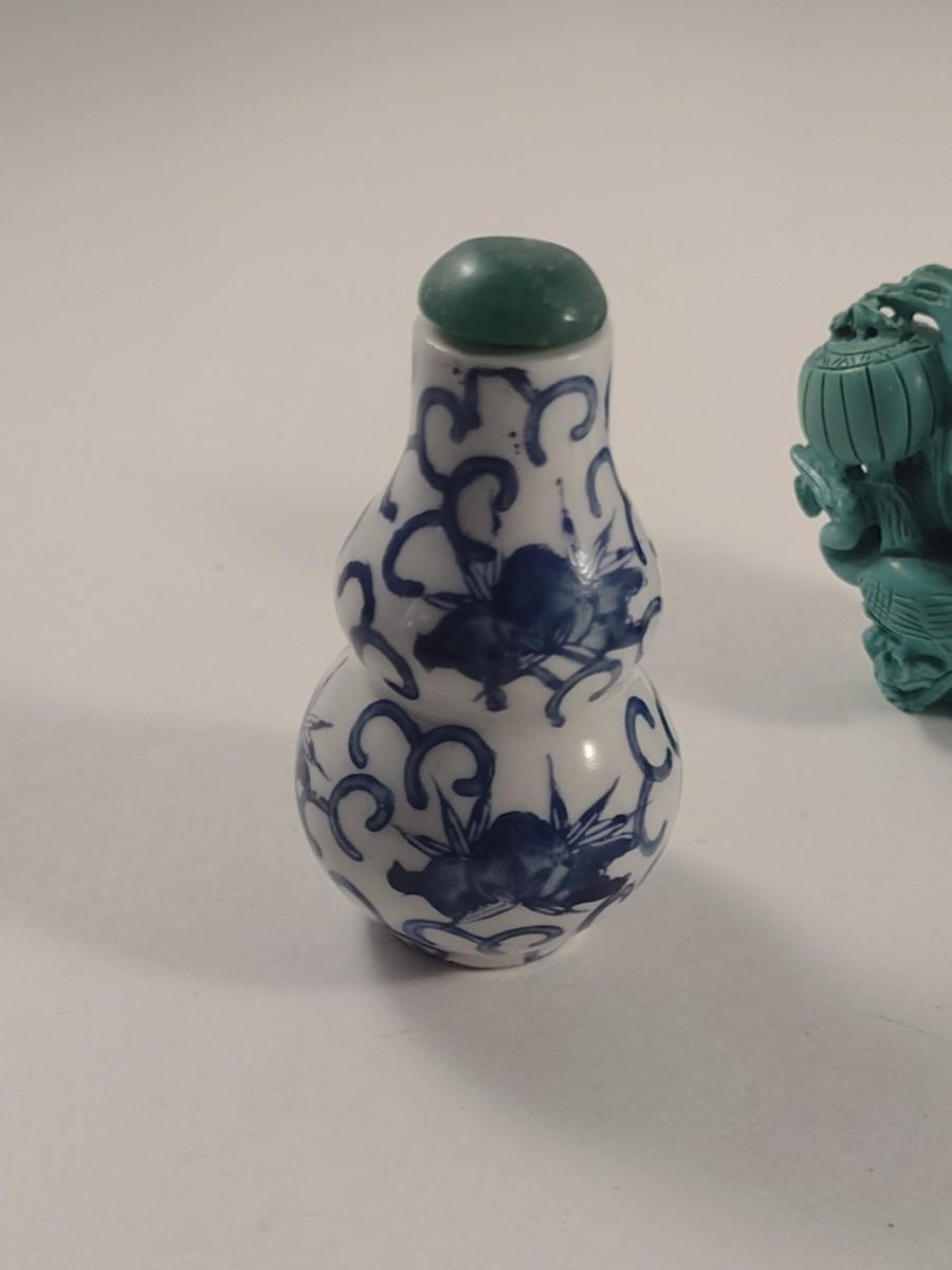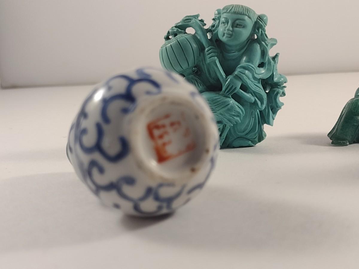 Collection of Asian Themed Items include Jade Buddha, Carved Netsuke, and Two Porcelain Snuff Bottles