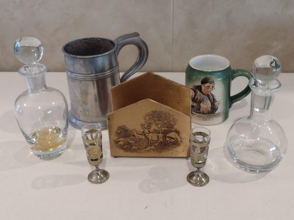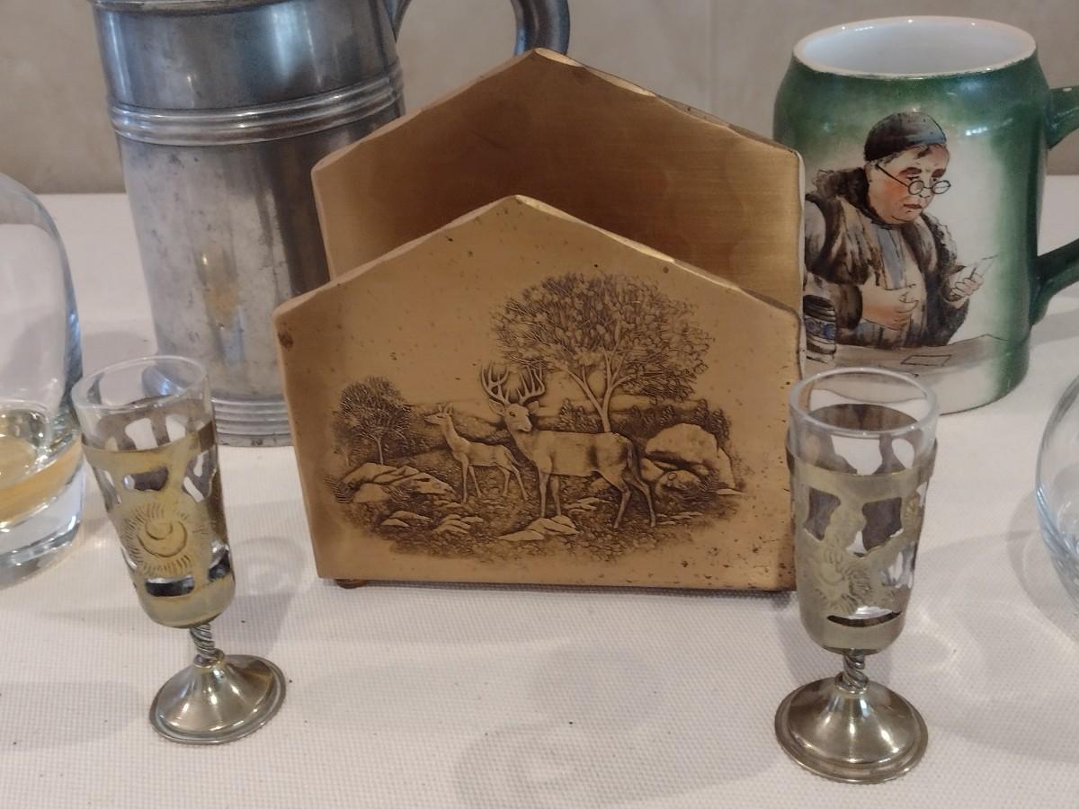 Collection of Vintage Bar Ware includes Solid Bronze Napkin Holder by Wendell August Forge