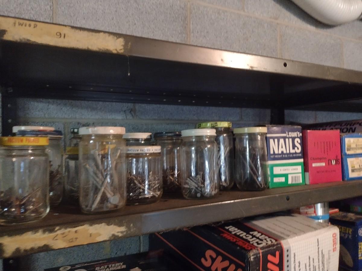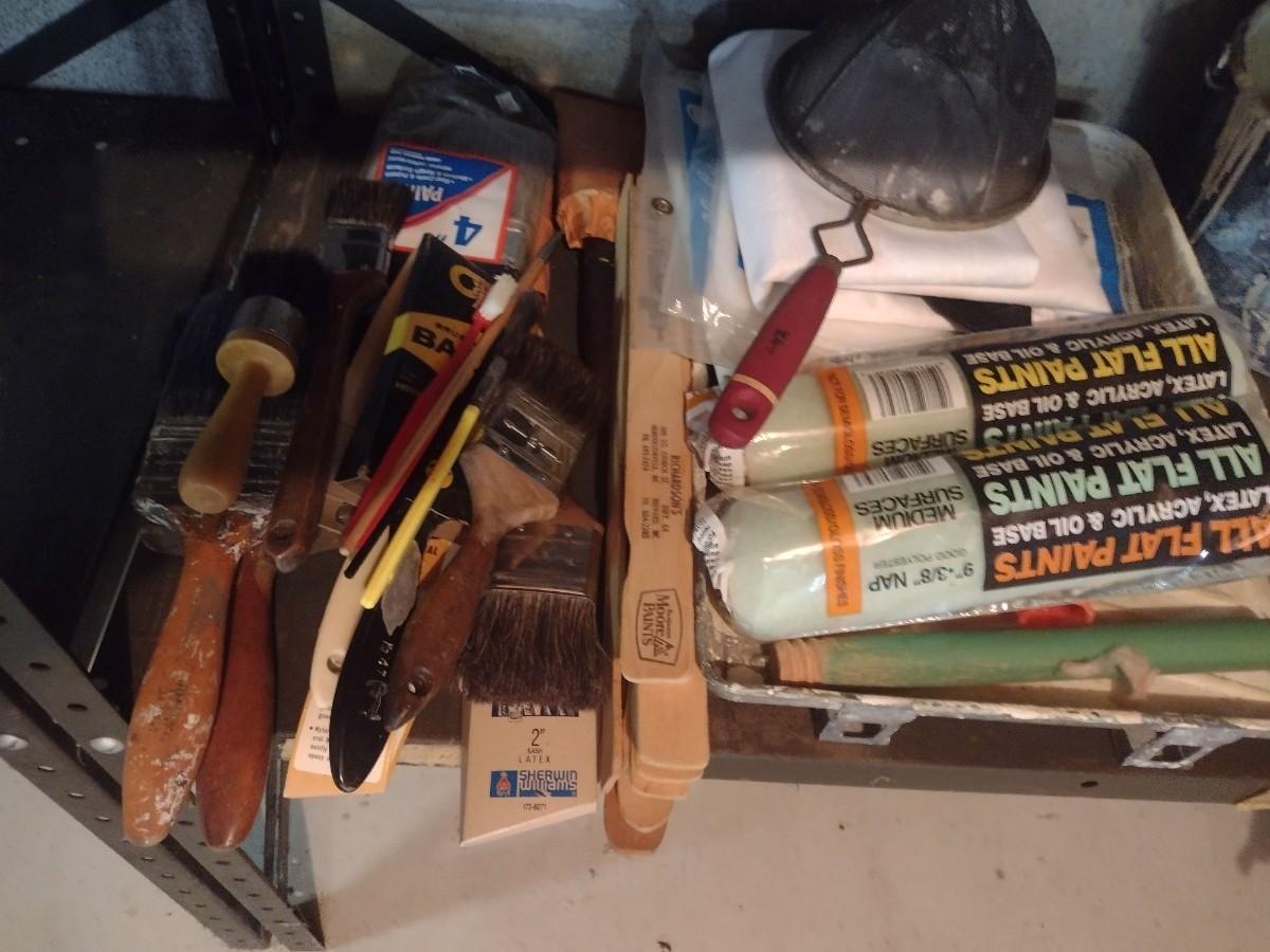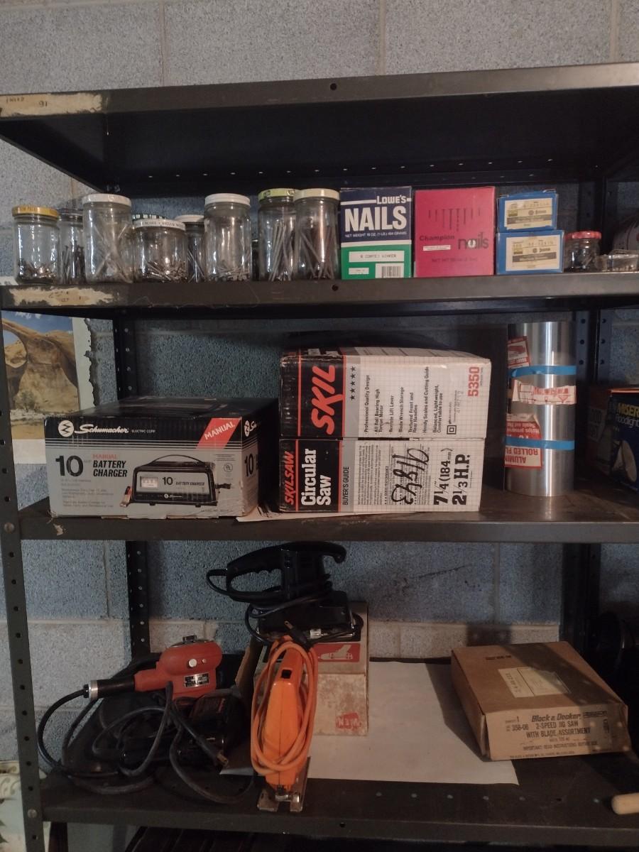 Collection of Power Tools, Fasteners, and Paint Related Items (See all Pictiures) shelves not included.