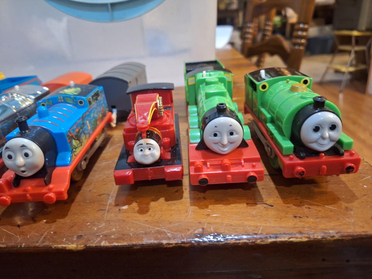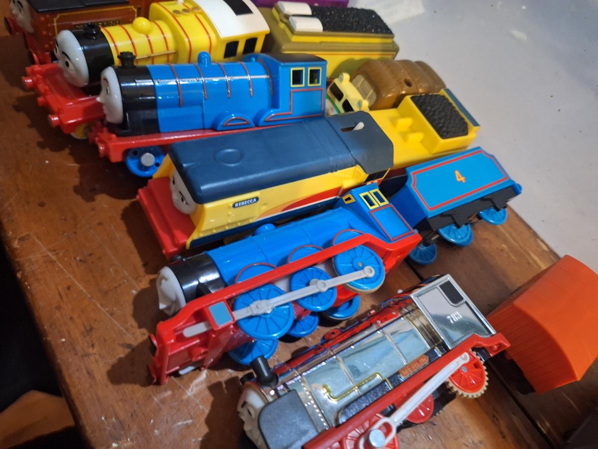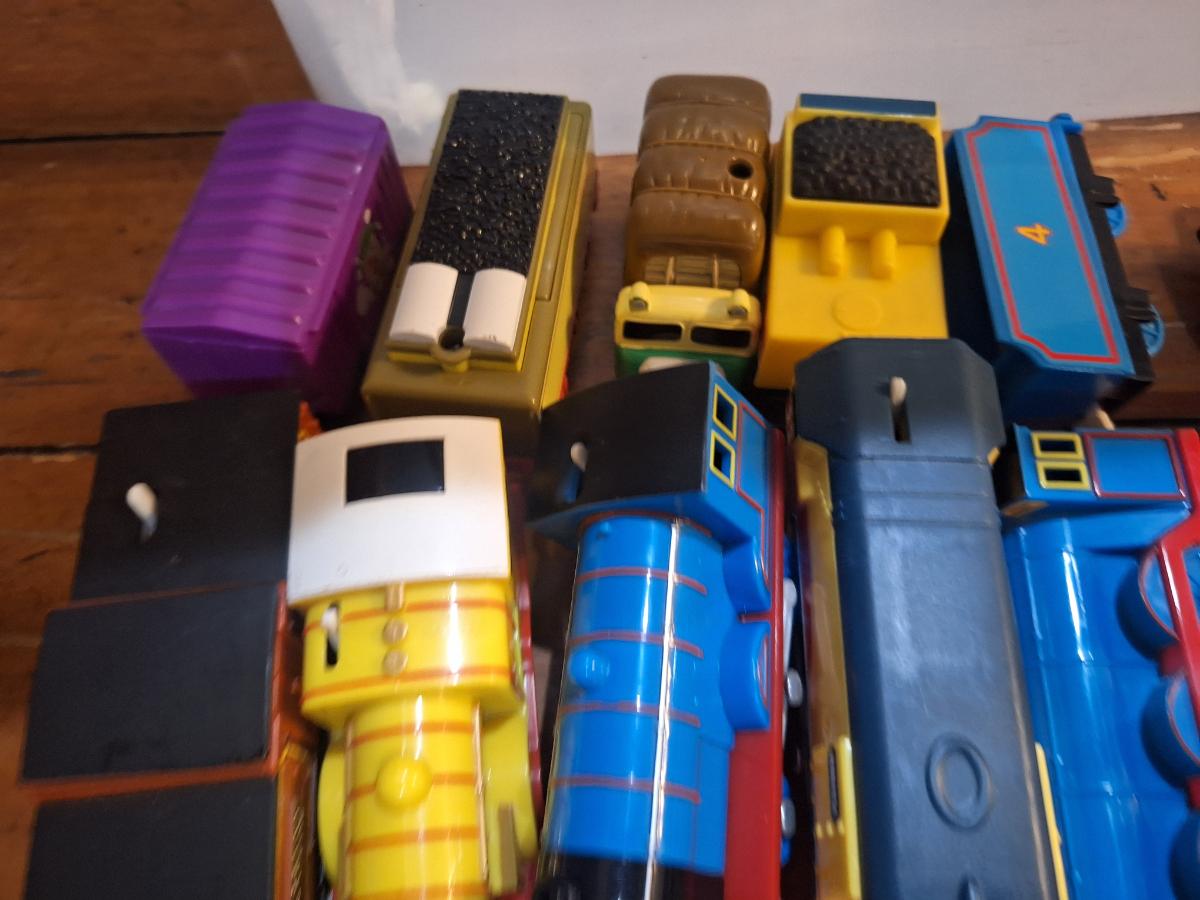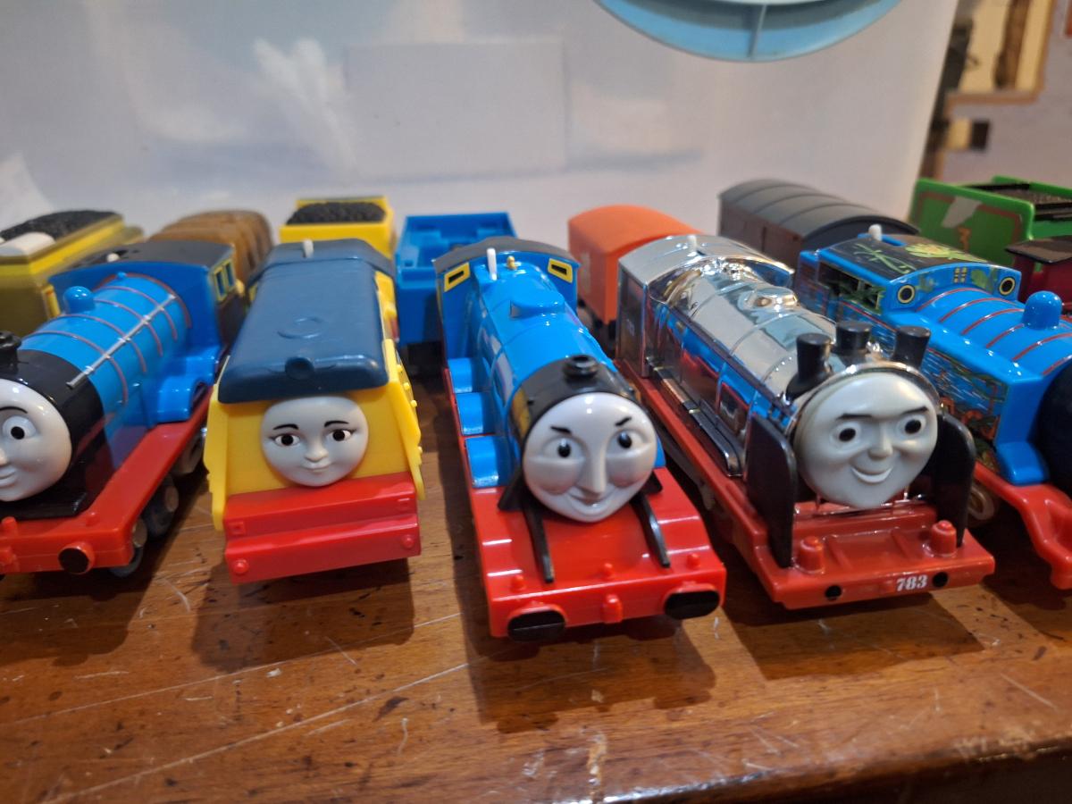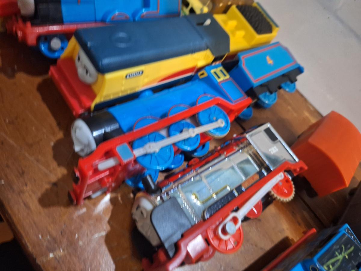 collection fo Thomas and friends toy trains from tomy or trackmaster lines most of these require batteries