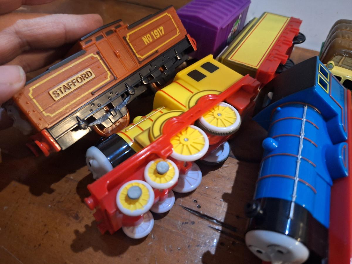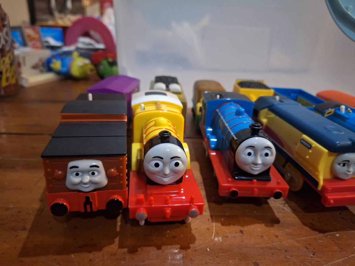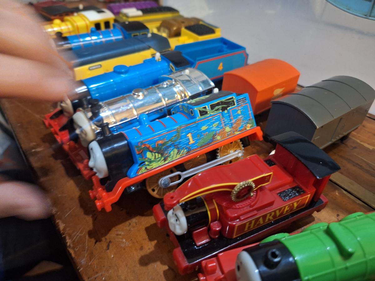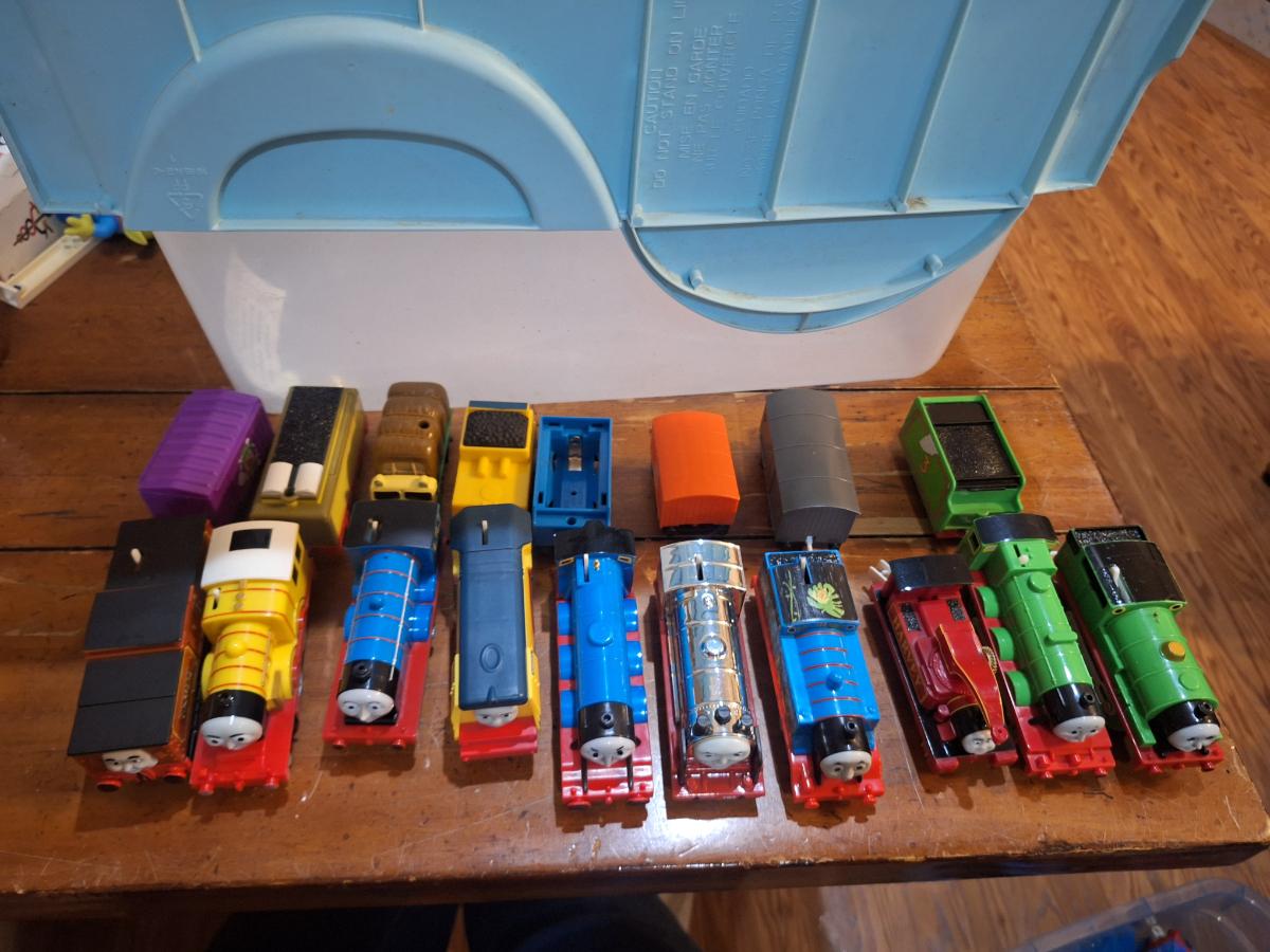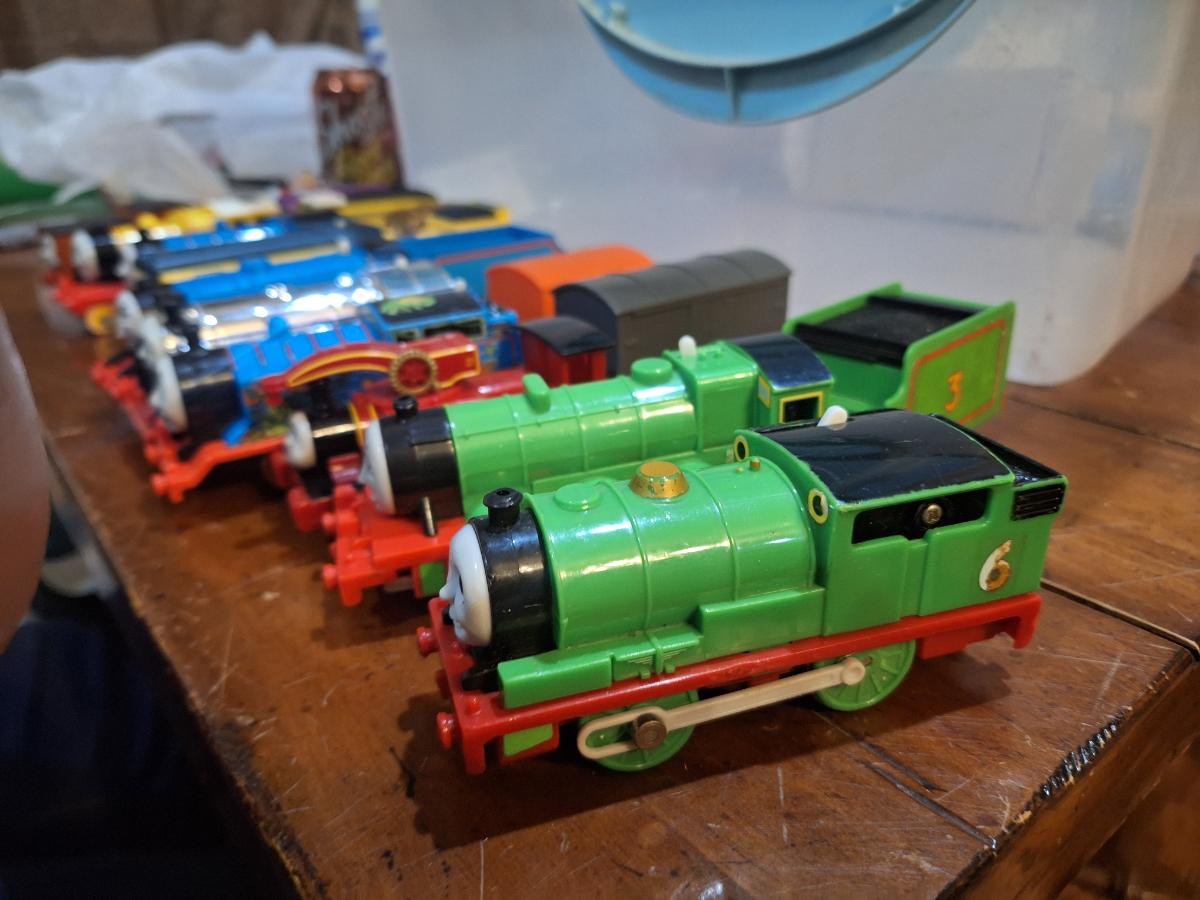collection fo Thomas and friends toy trains from tomy or trackmaster lines most of these require batteries