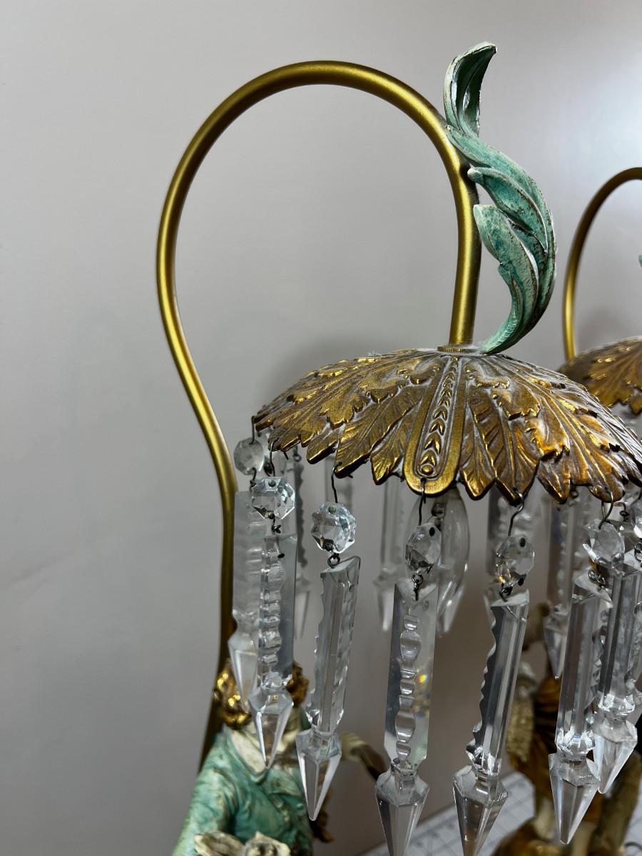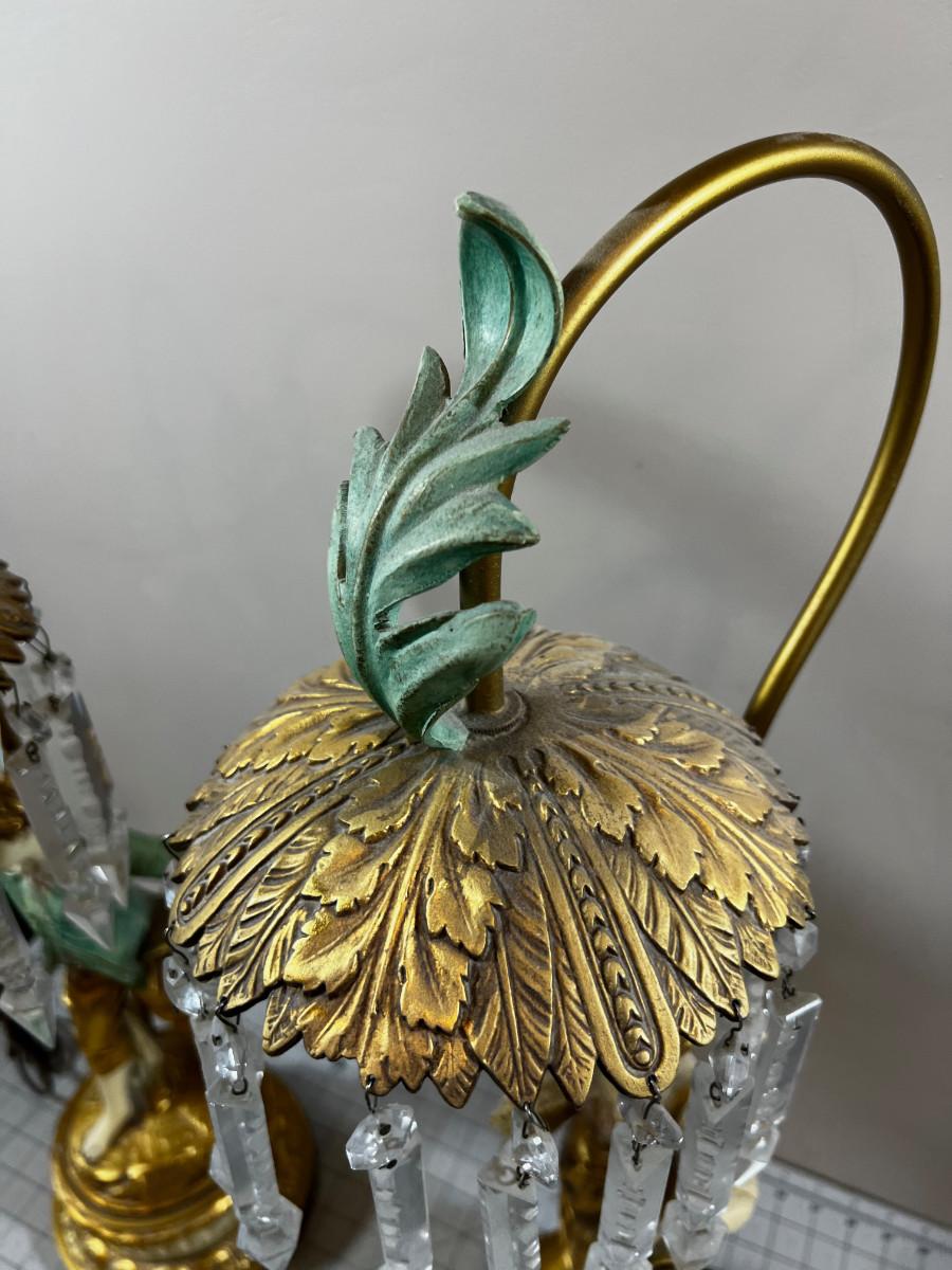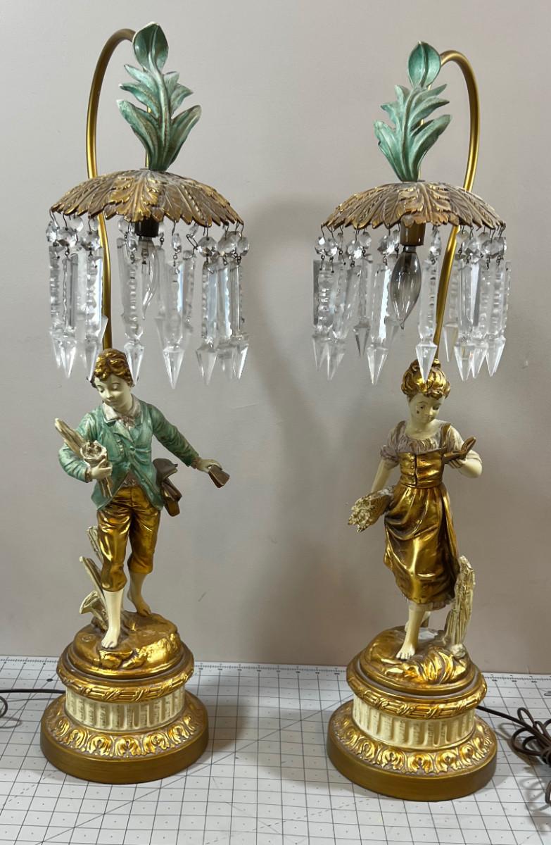 Collection Franchise, Gilded Metal Pair of Lamps, Boy & Girl, Circa 1960's with Dandle Crystals