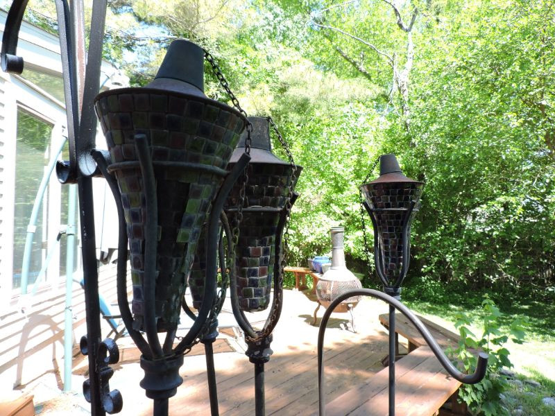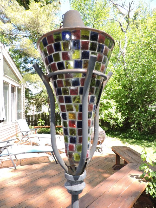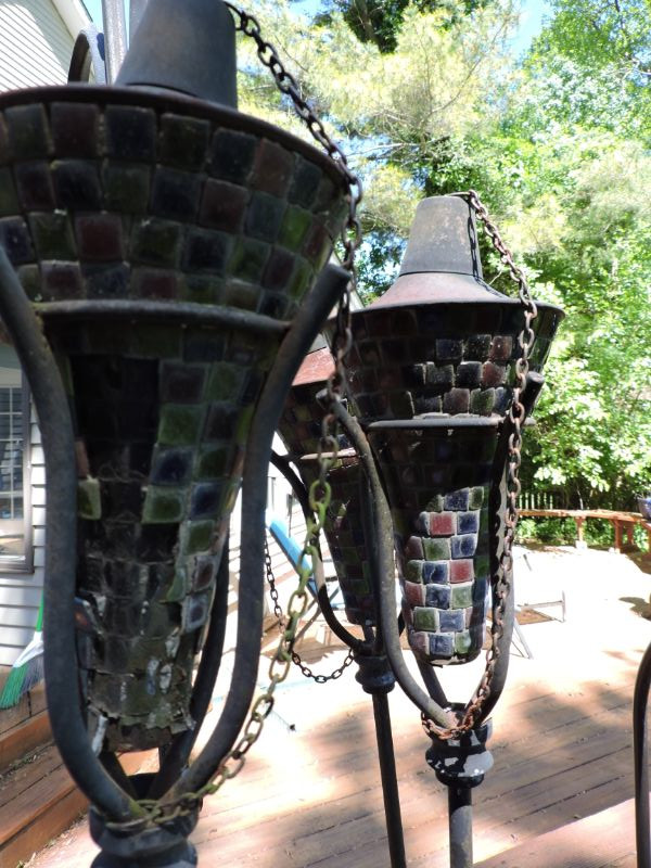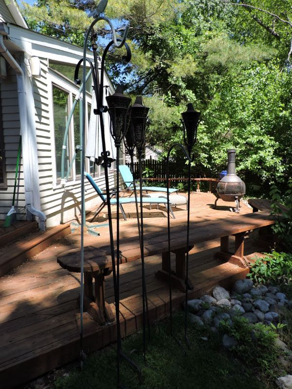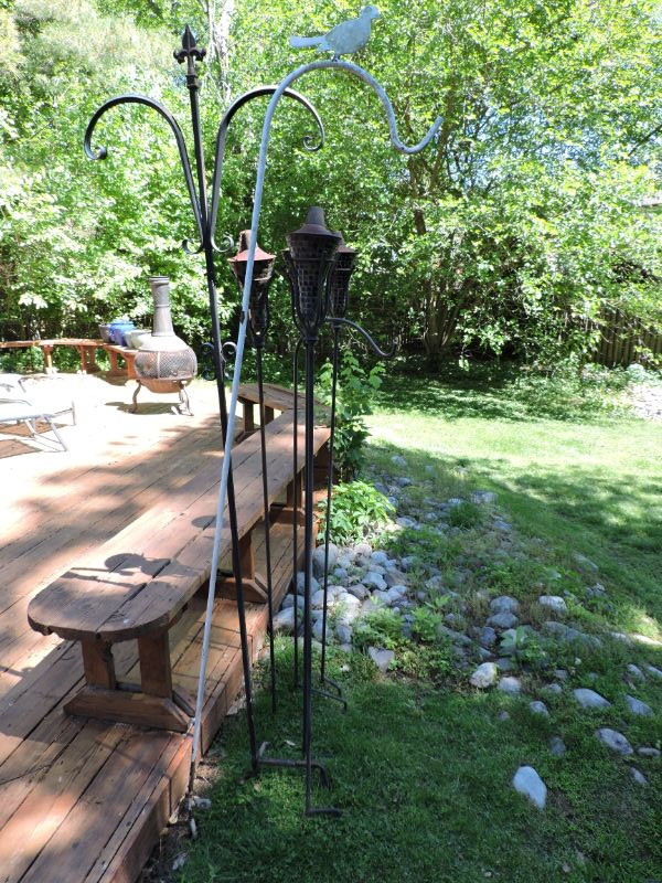 Collection of metal shepherds hook plant stands and 4 metal Tiki torches. Measuring up to 78”.