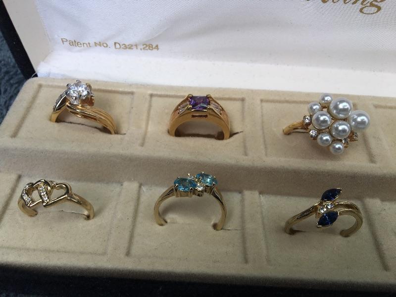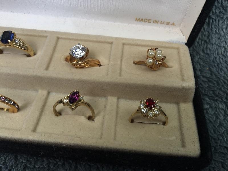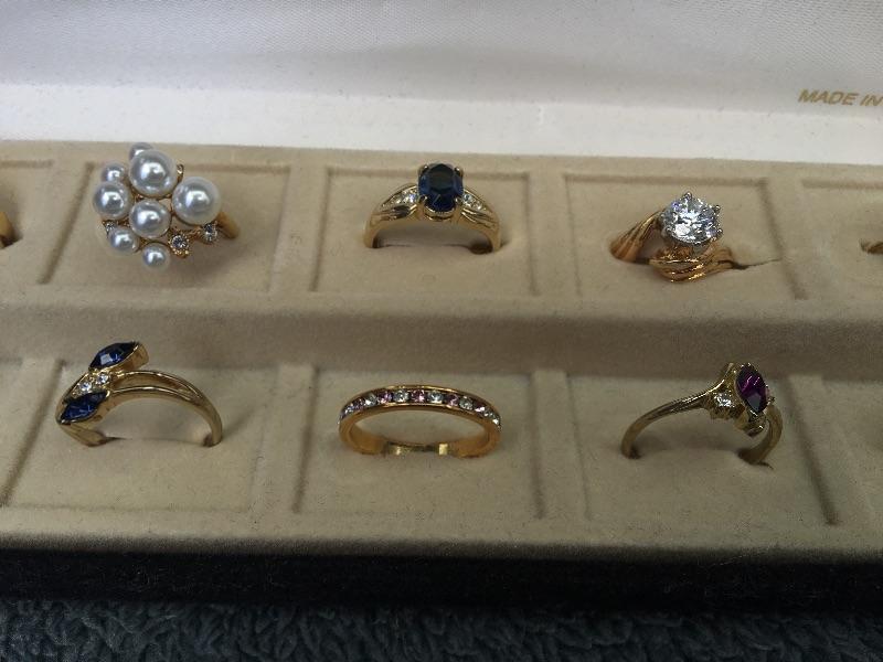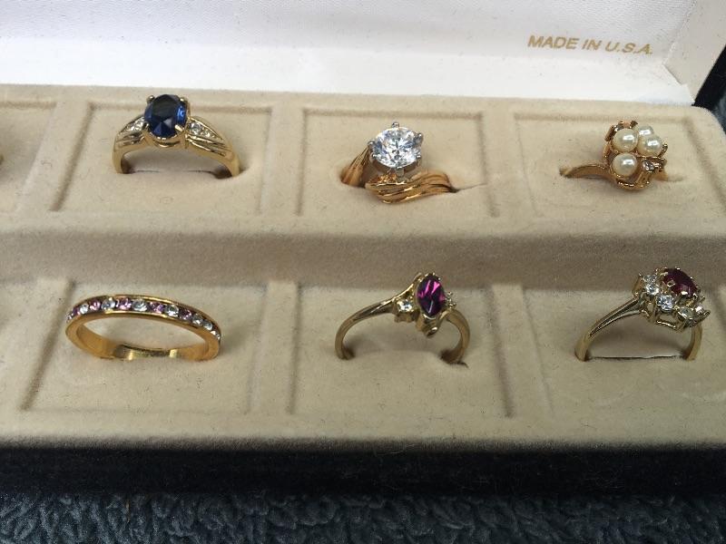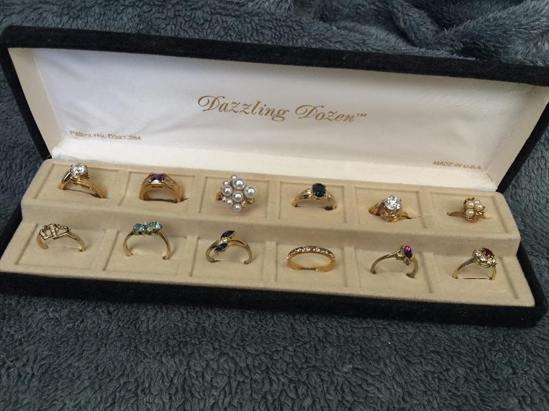 Fresh out of a local estate. Twelve different gold rings of various sizes. They look to be heavy gold plated. No markings on them. Gemstones have not been tested.
