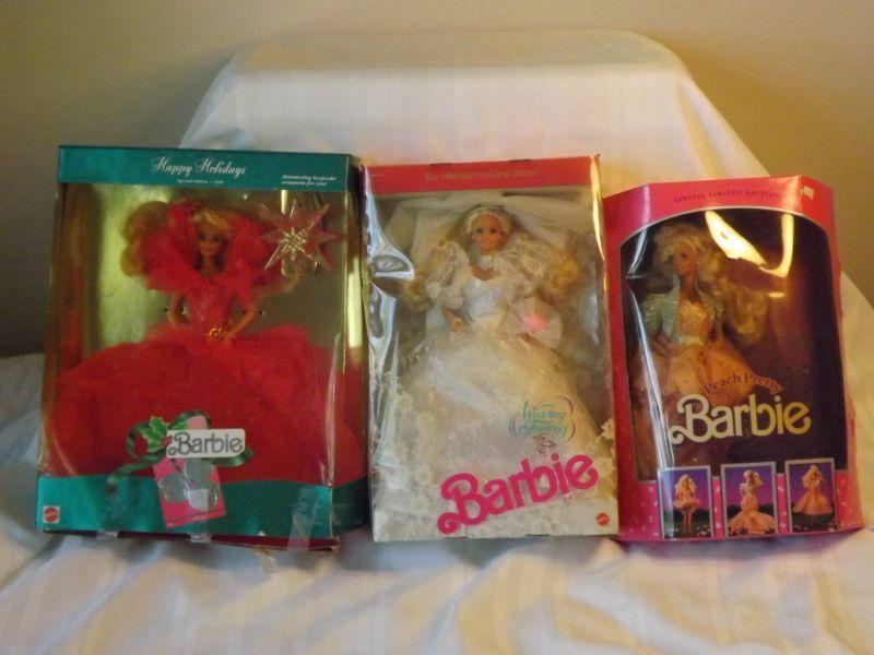 Collection of 3 Barbies from 1989-90's still in the box. 1990 Barbie Holiday, 1989 Wedding Fantasy, and Barbie Peach Pretty. **Please read Terms and Conditions before placing a bid. Pick up is Sunday, September 15, 2019 from 11am to 4pm and Tuesday, September 17 from 4pm-7pm in Sicklerville. All sales are final. All sales are as is, where is. Please review all photos. Any props included in photos are not included in listing. All measurements are approximate.