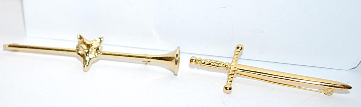 Collection of 2 BROOCHES - Trumpet with Fox Face & Marked "Trifari" Gold Colored Sword (2" to 2½") on Gold Tone Settings