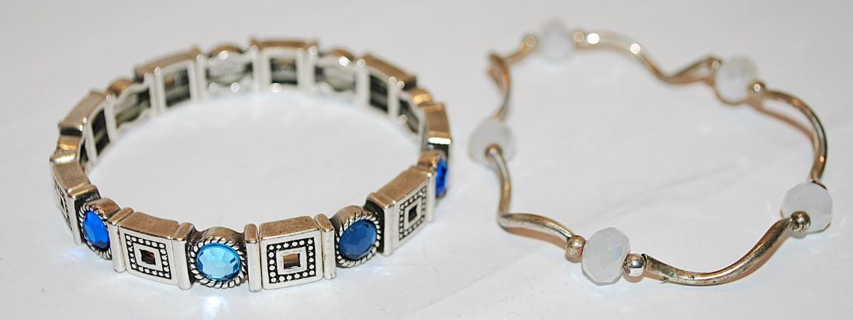 Collection of 2 Elastic BRACELETS (2" Opening) with BLUE Round Stones + Square Accent Segments and Opaque Prism Stones and Wire Curves
