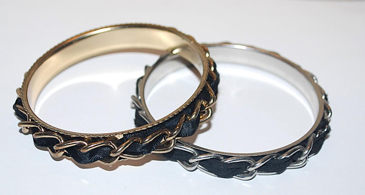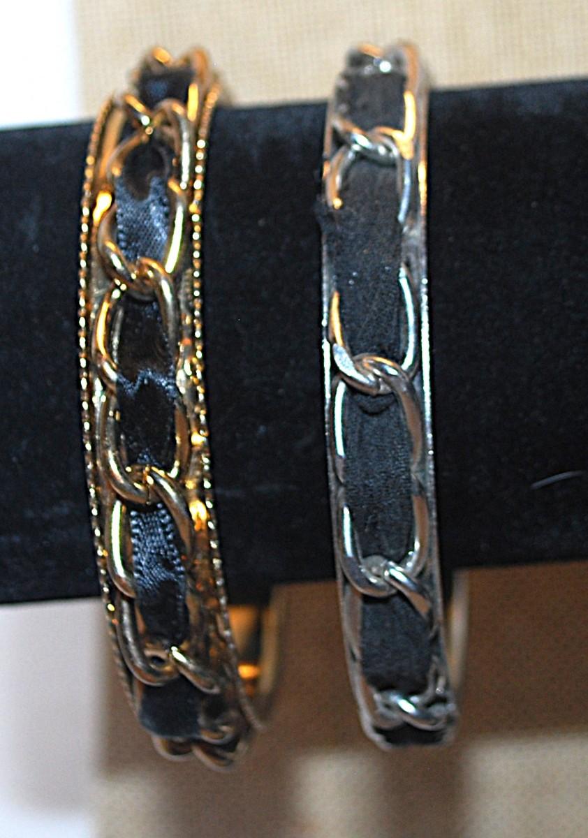 Collection of 2 Solid Black Ribbon BRACELETS (2¾" Opening) in Chain-Link Style and in Both Silver/Gold Tone