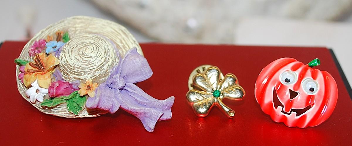 Collection of 3 Assorted TACKS - Flowered Straw Hat, Wiggle Eyes Pumpkin & "Green Stone 3-Leaf Clover"