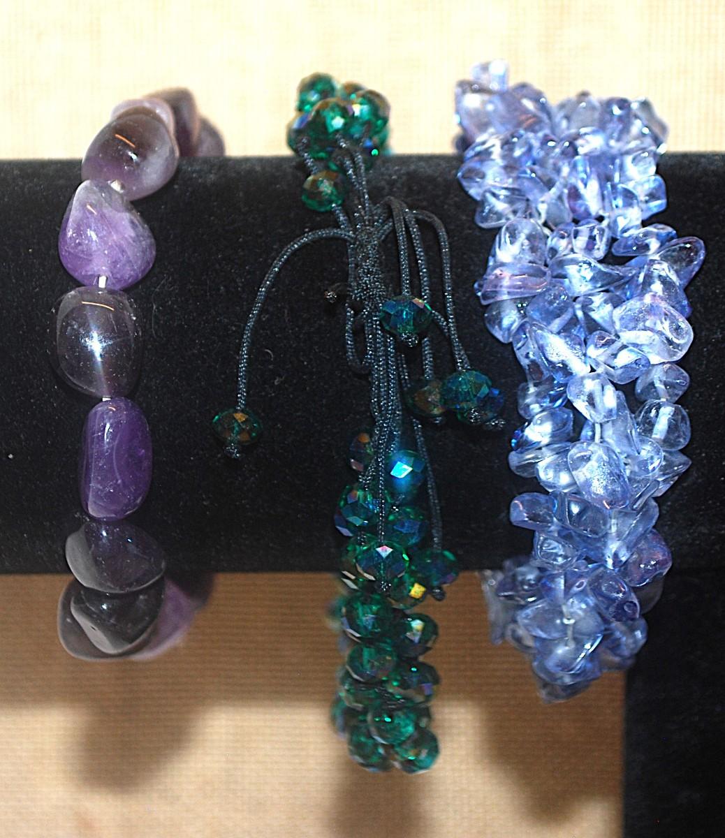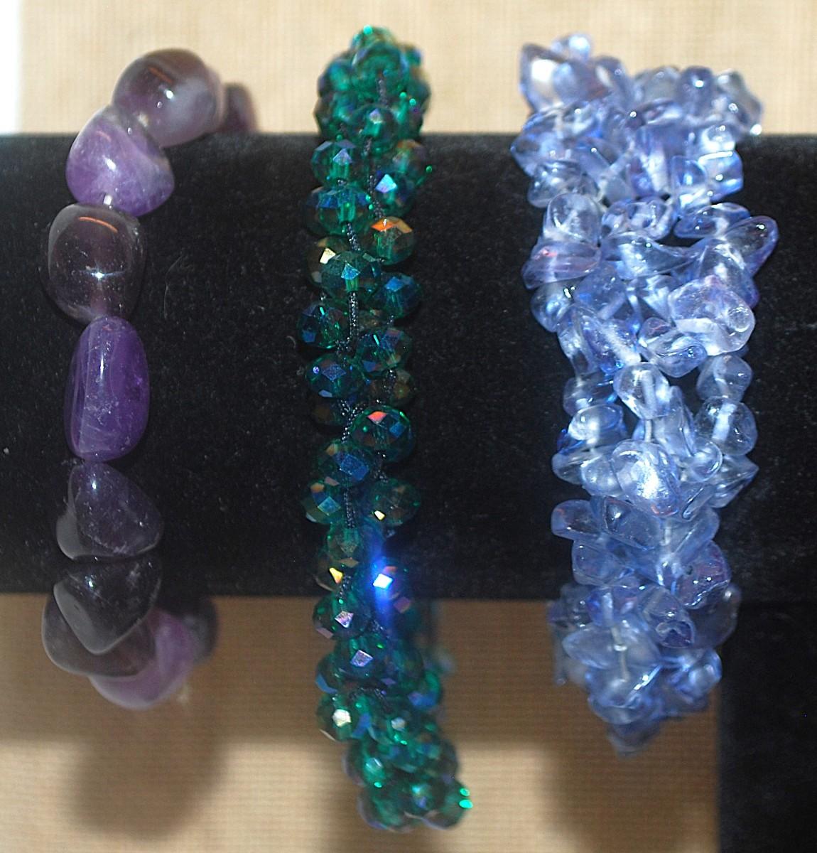 Collection of 3 Colored BRACELETS - Purple & Blue are Elastic (2") and Green is 3½" Opening