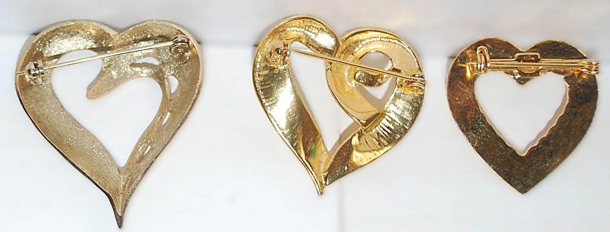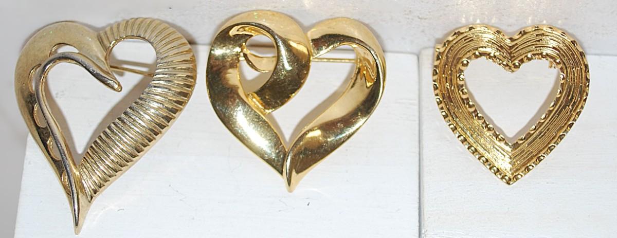 Collection of 3 "Golden" HEART BROOCHES (2" to 1¼") on Rose & Gold Tone Settings