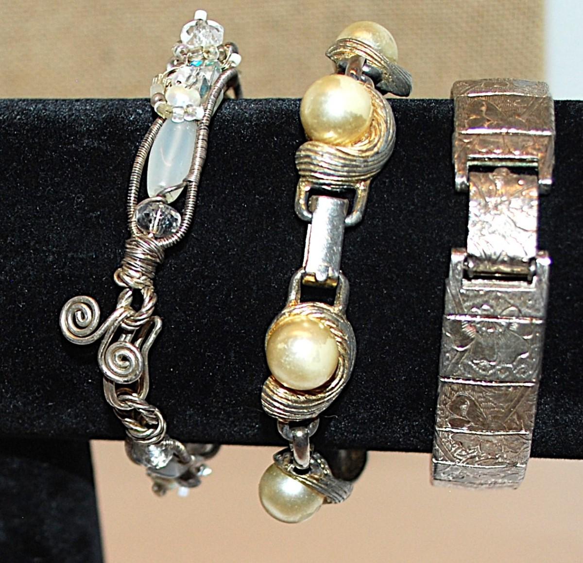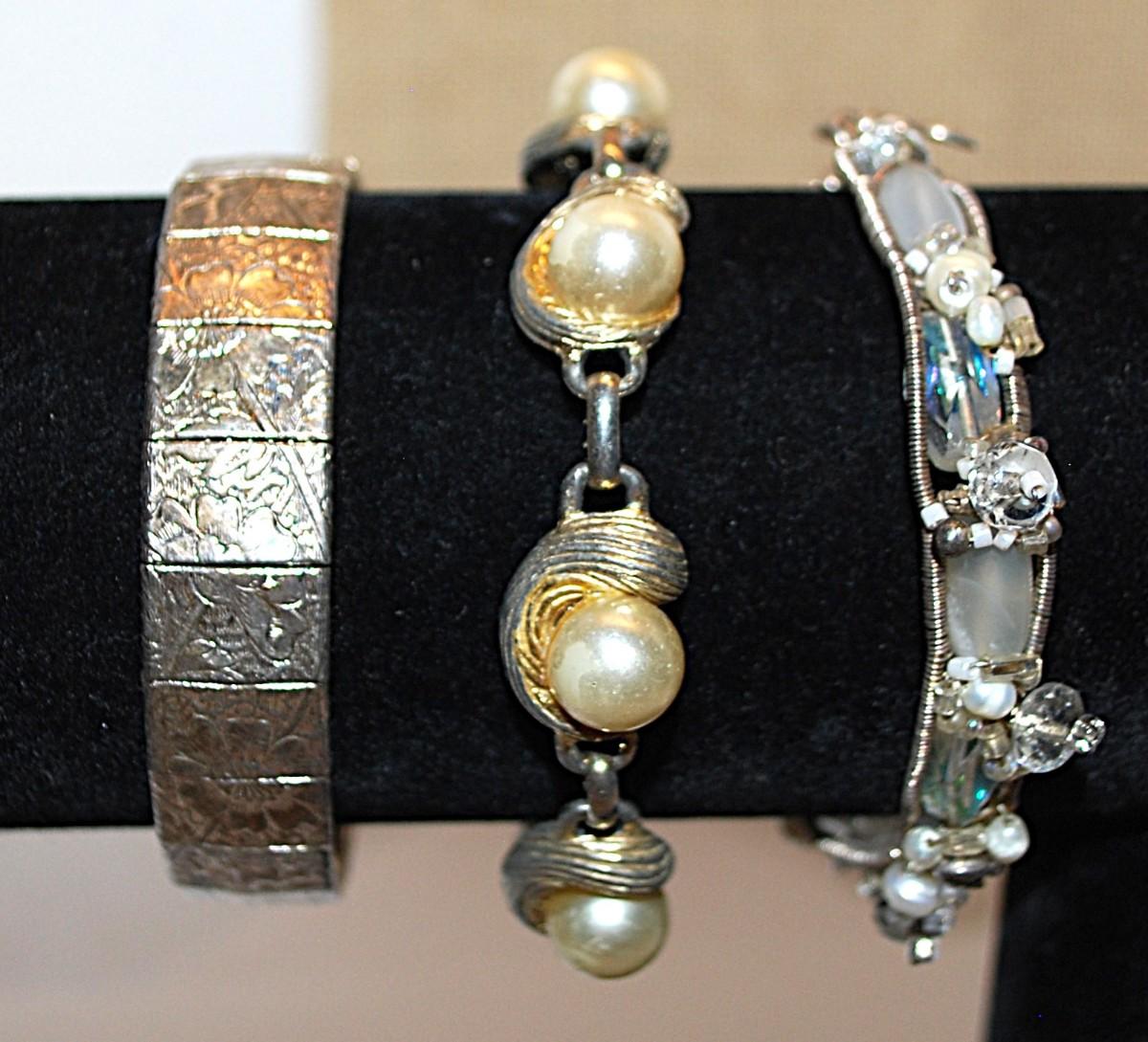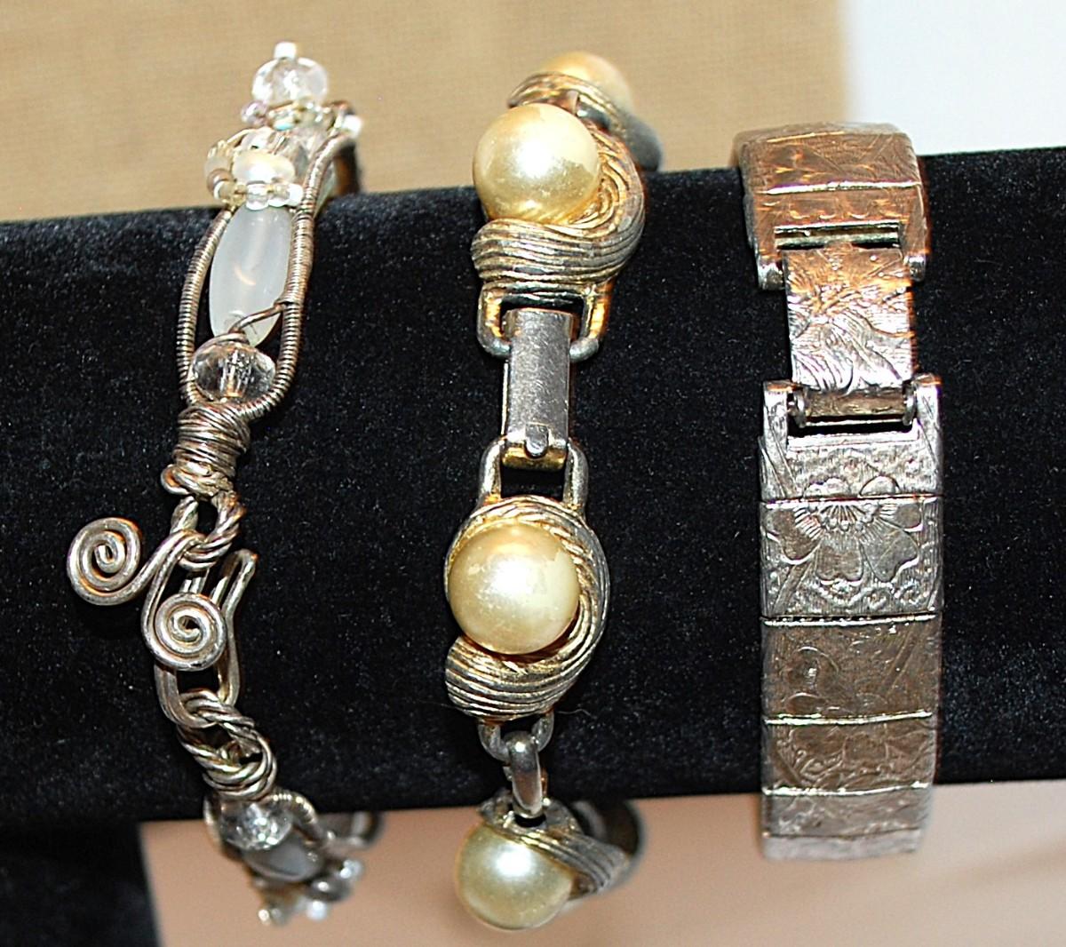 Collection of 3 Silver Tone BRACELETS (2" Opening) with Faux White Pearls, Opaque White Beads + Engraved Segments & Various Clasps