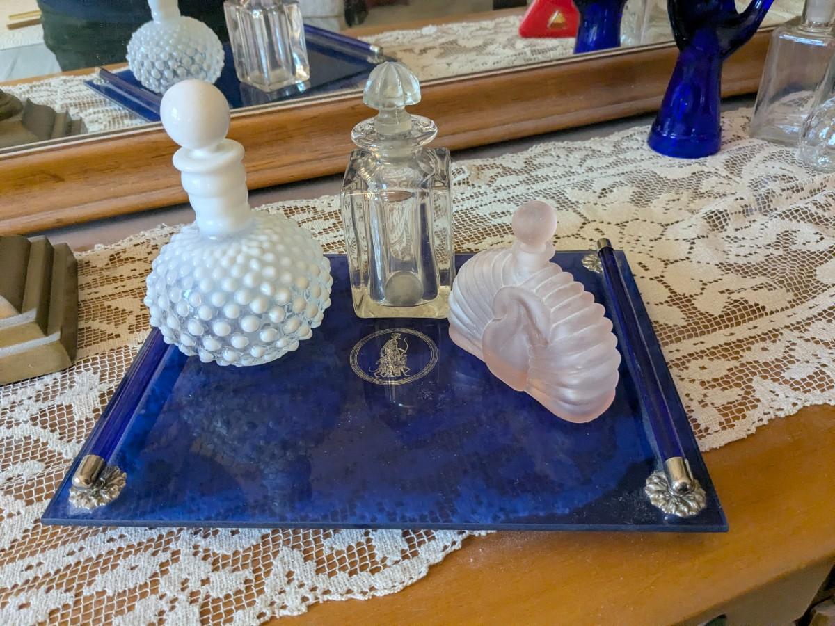 Collection of 3 Vintage Perfume Bottles and Cobalt Tray