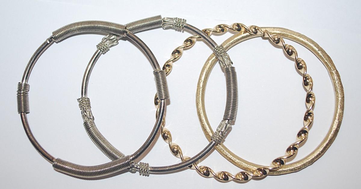 Collection of 4 BRACELETS (-2½"+ Opening) with Silver "Springs" and Brushed and Swirls Gold Tone Settings