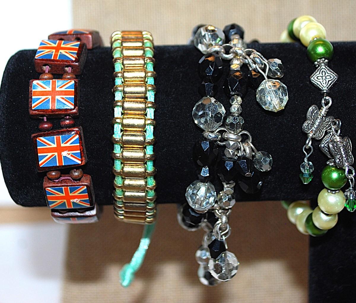 Collection of 4 BRACELETS (-2½"+ Opening) including the British Flag, Green & White Cuff, Etc.