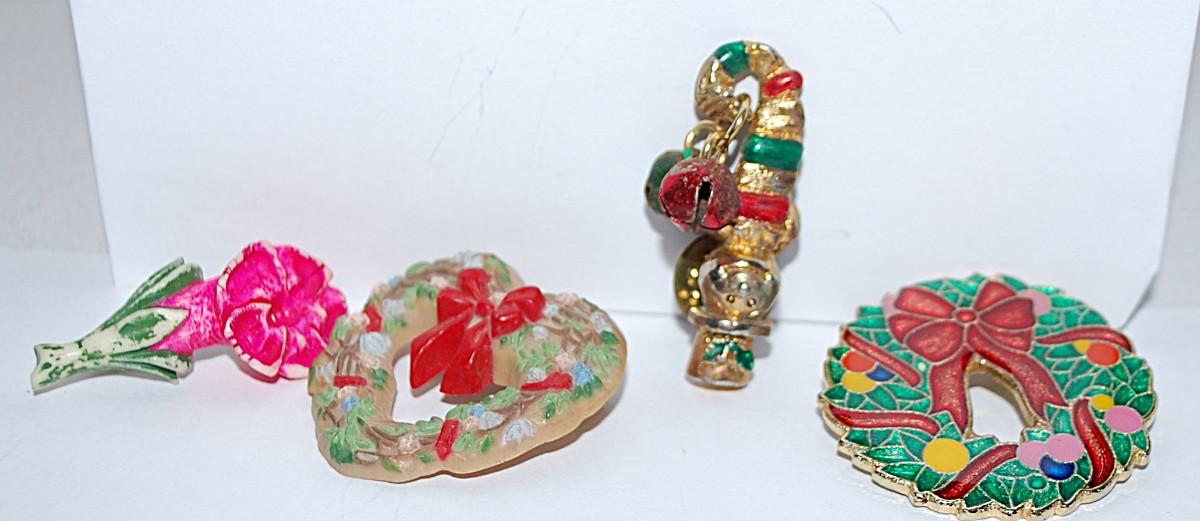 Collection of 4 BROOCHES - Wreaths, Pink Flower, and TACK Snowman