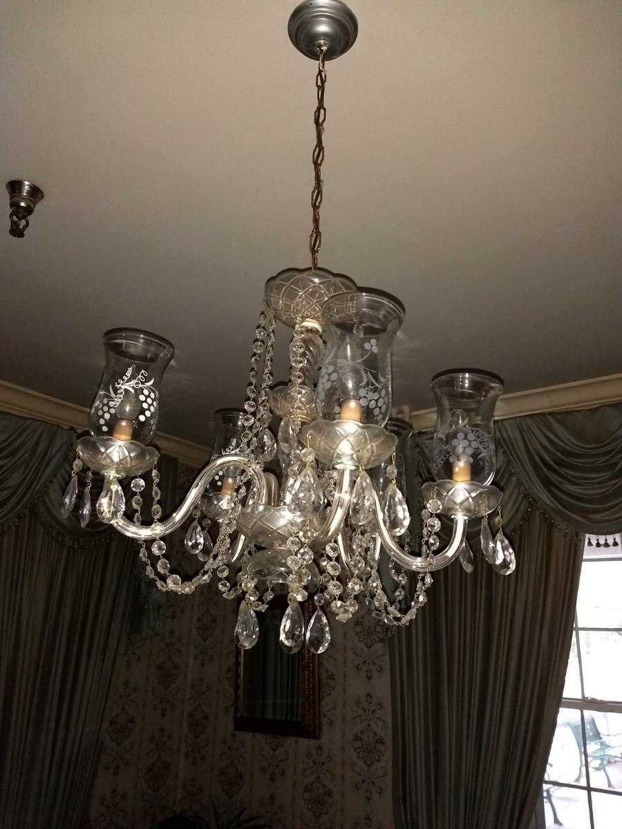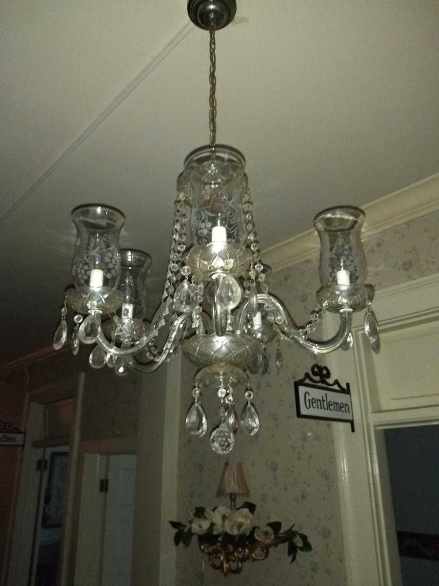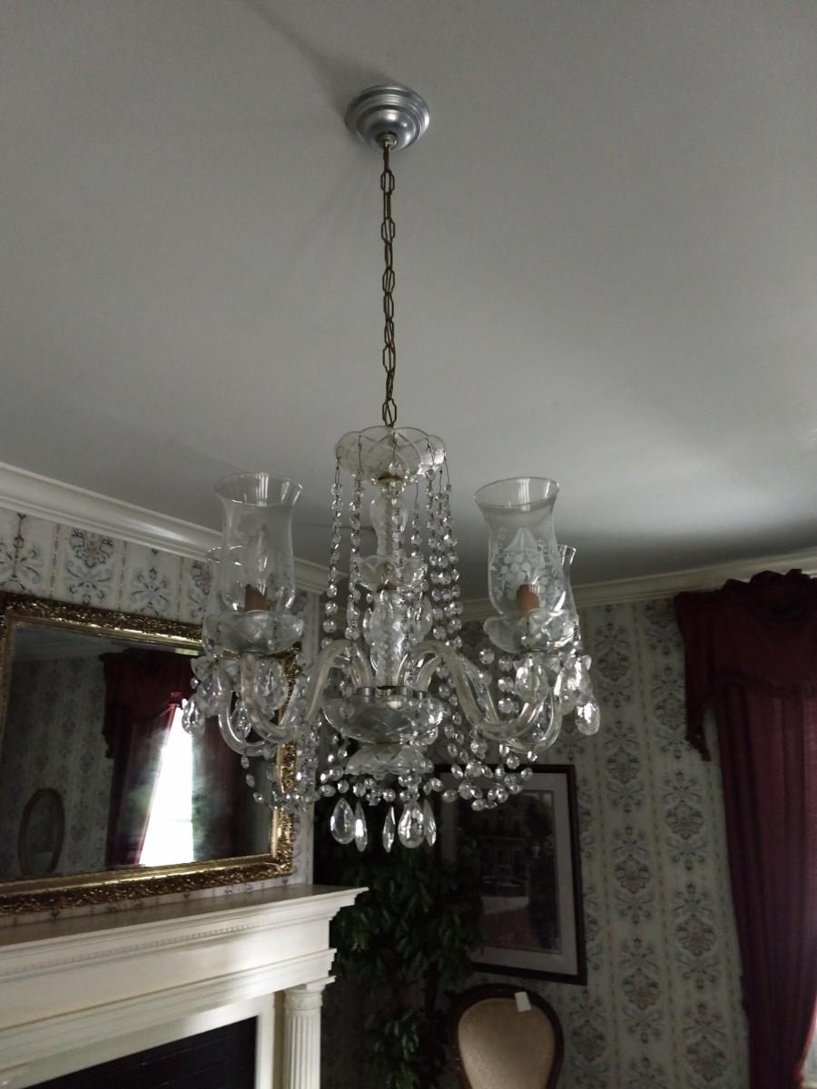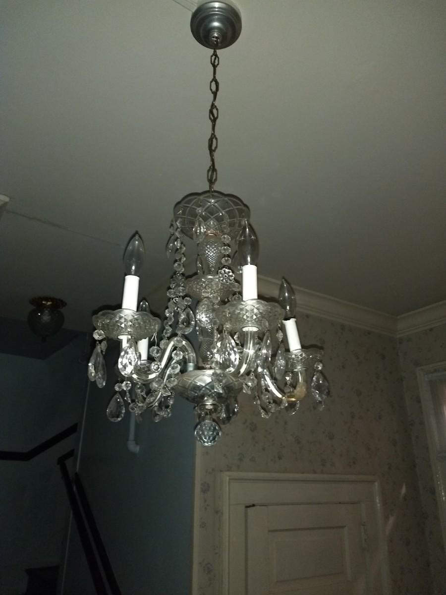 Collection of 4 Vintage Chandeliers with Twist Metal Twig Design and Prism Accents (Front of House) bring ladder and tools to remove from ceiling. Light fixtures are similar in appearance but may differ somewhat in design.