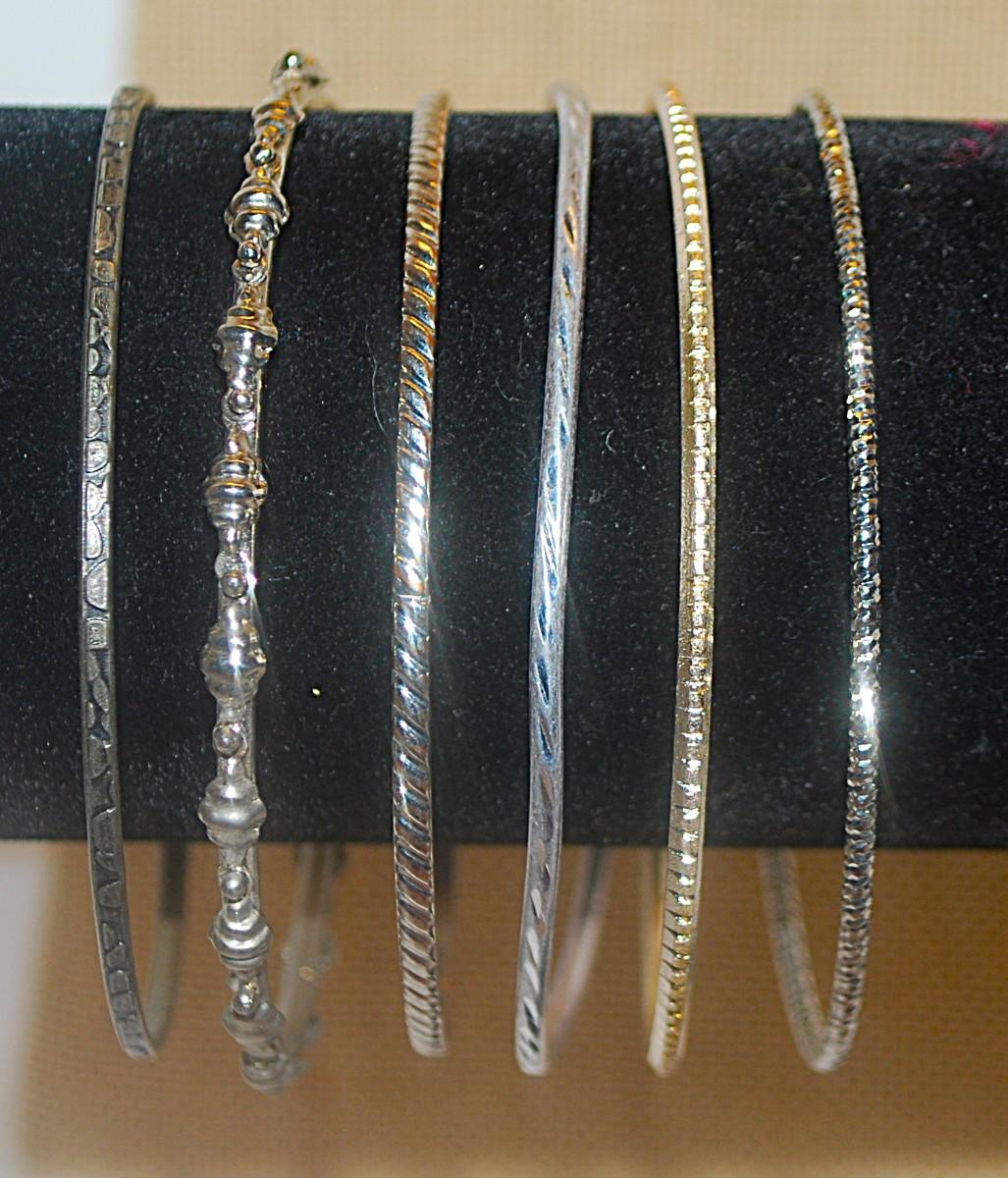 Collection of 6 BANGLE BRACELETS (2½" Opening) with an Assortment of Silver Tone Finishes & Graphics