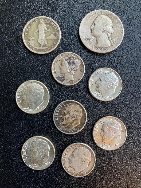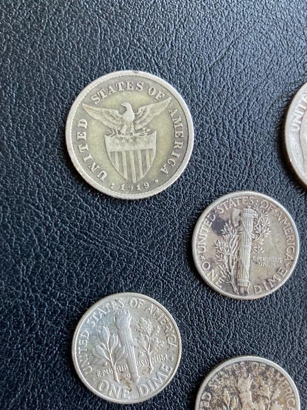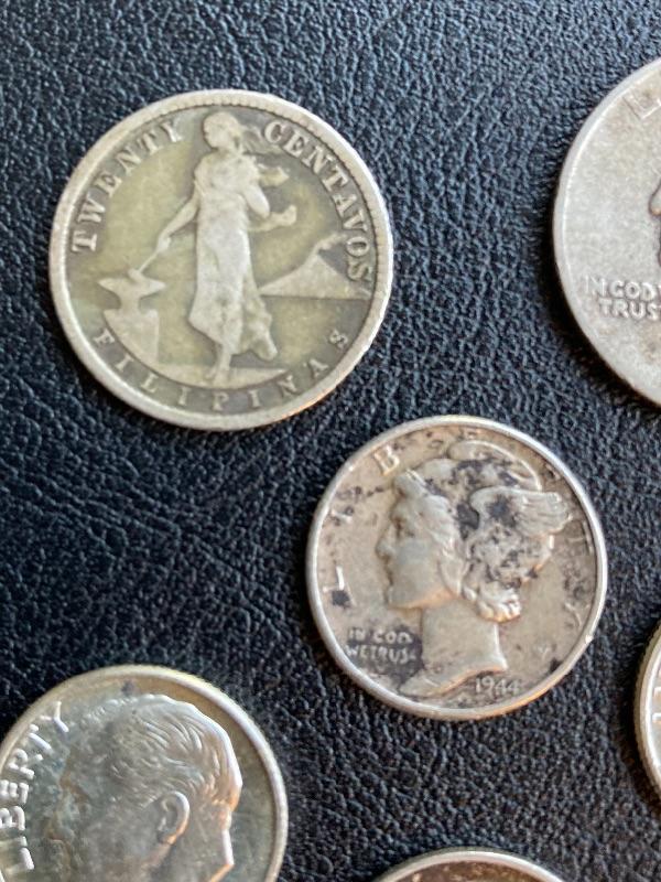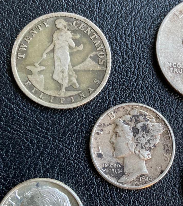 Collection of 9 Silver Coins with 1919 Filipinas 20 centavos, 1944 Mercury Dime and...
