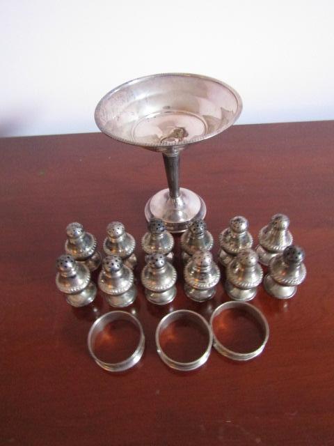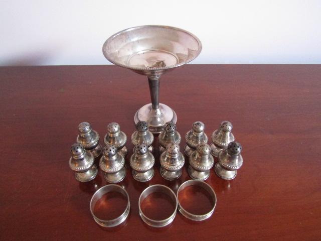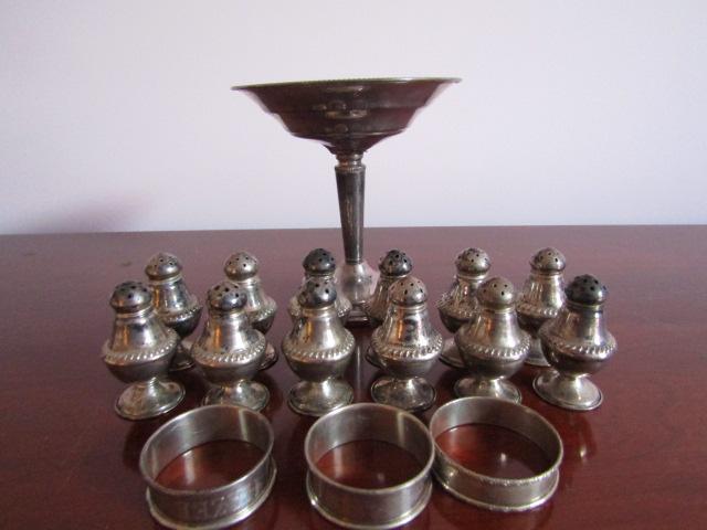 Collection of .925 and Weighted Sterling Pieces salt shakers and napkin rings are .925. sterling