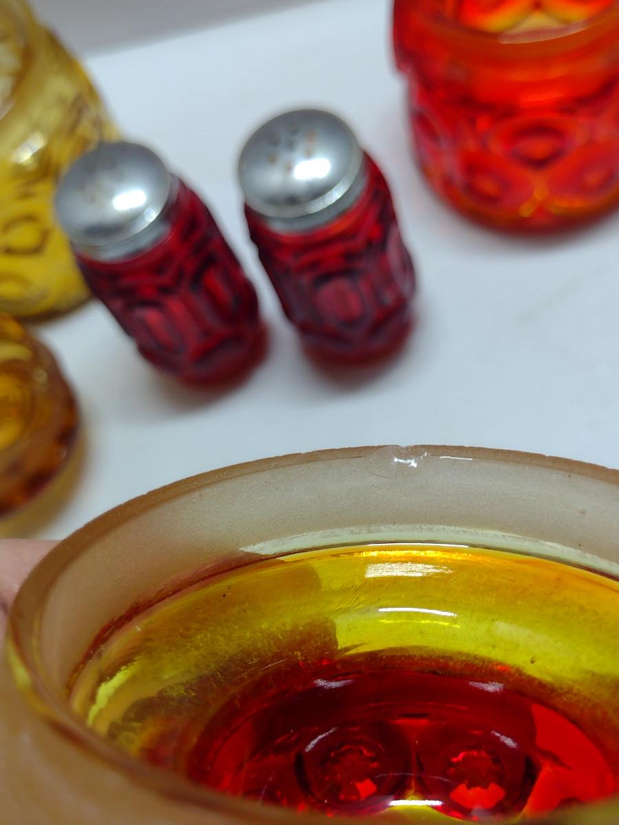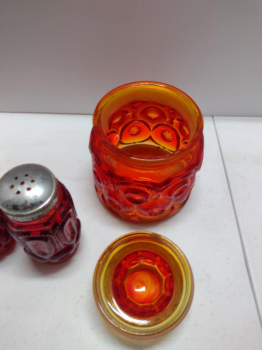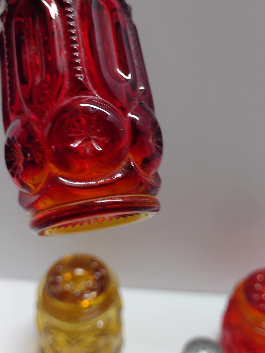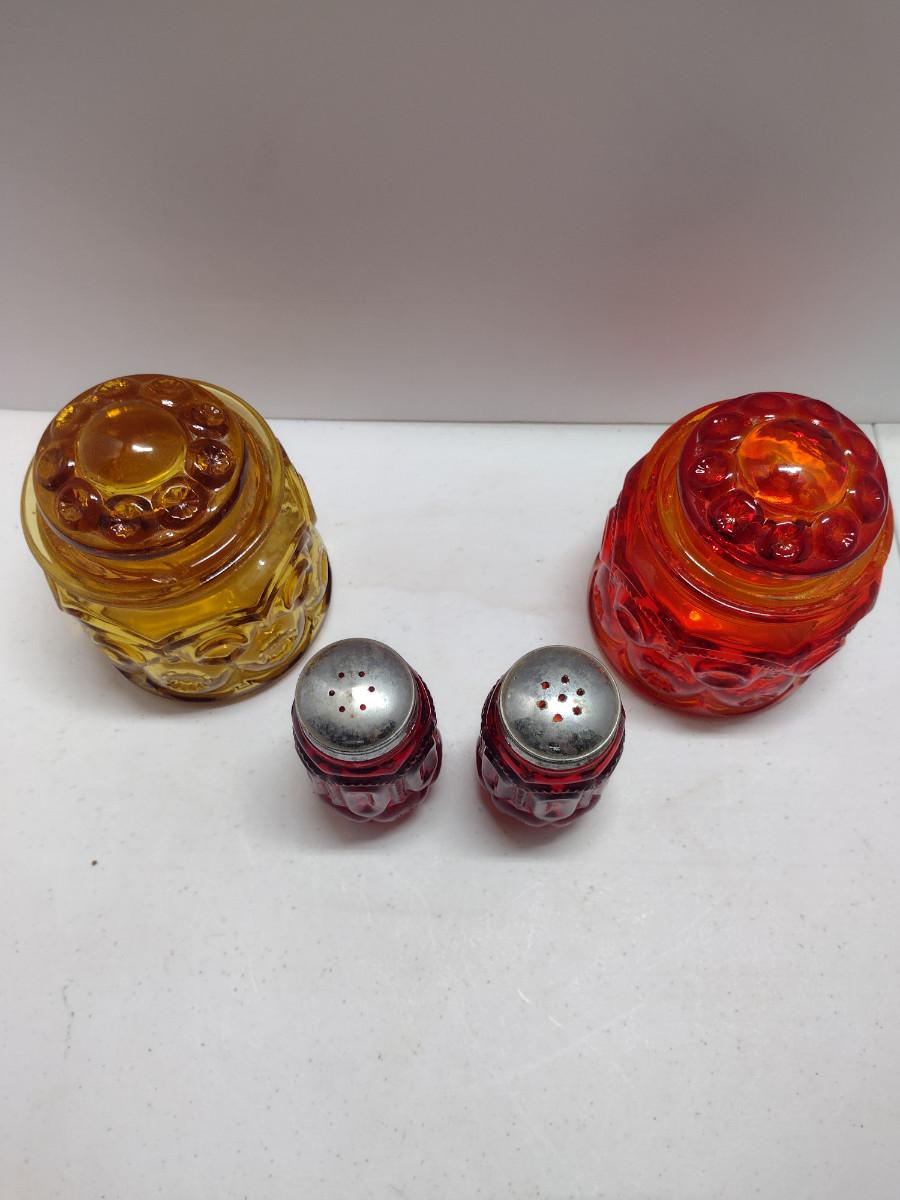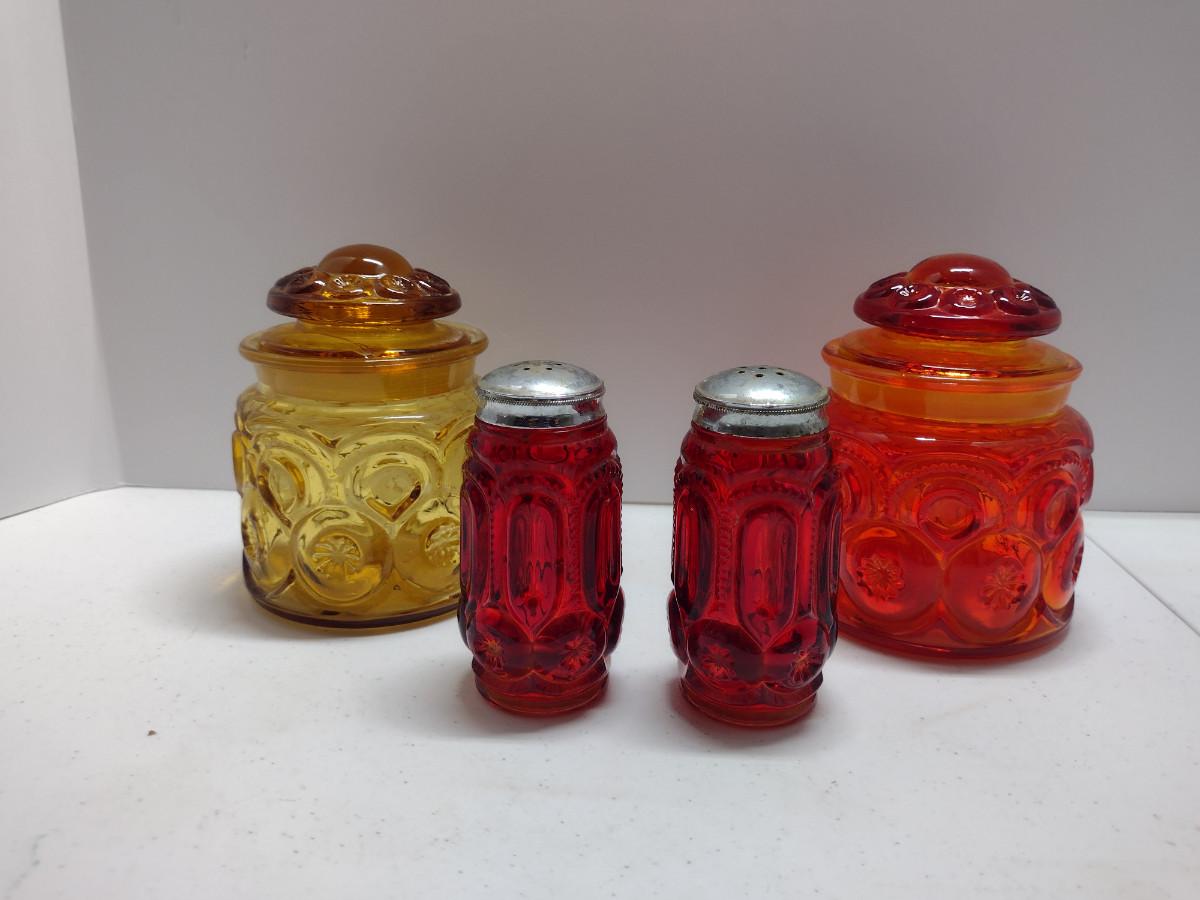 Collection of Amber and Amberina Glass- LE Smith Moon and Stars- Two Canisters and Salt & Pepper Shakers
