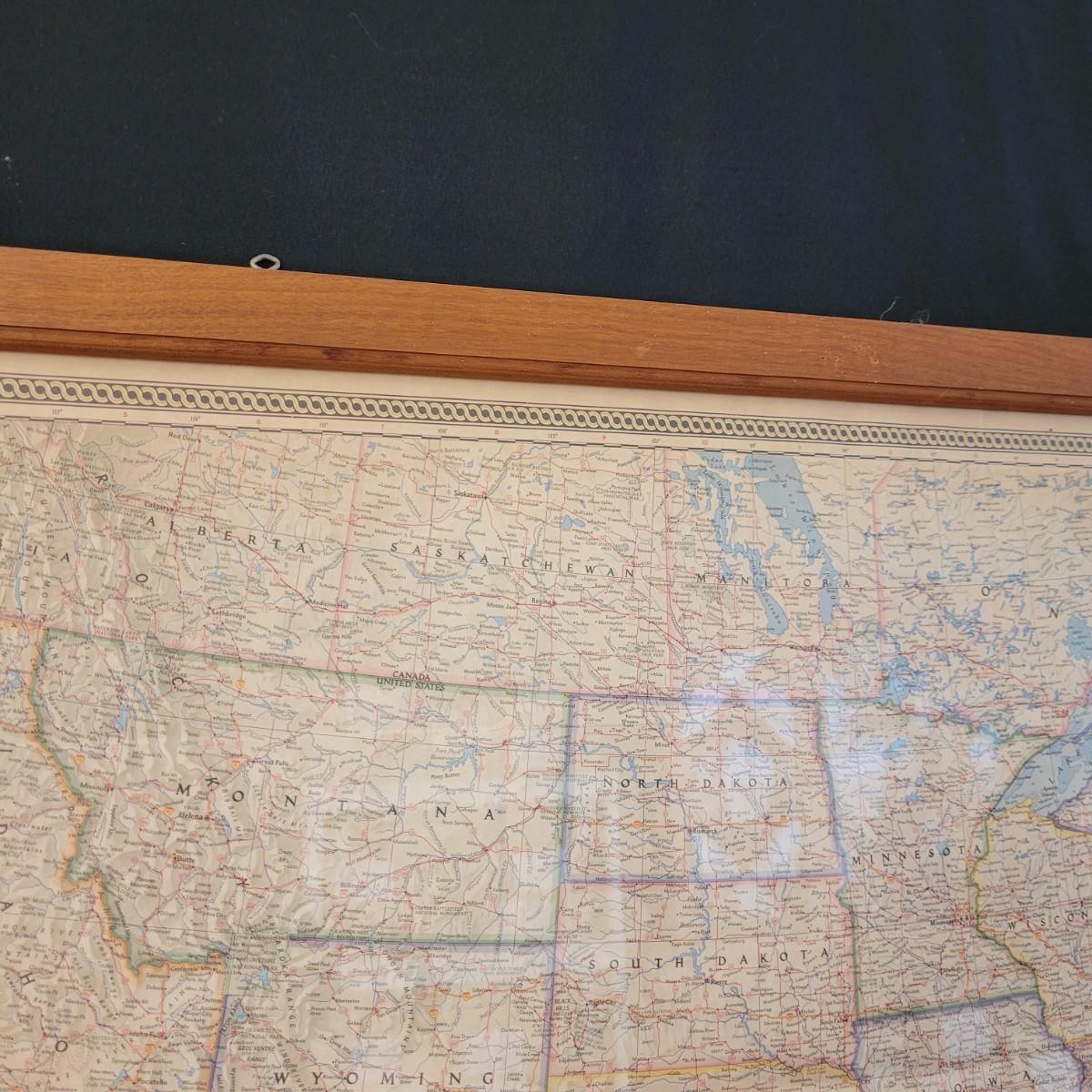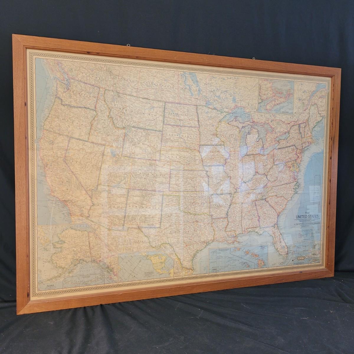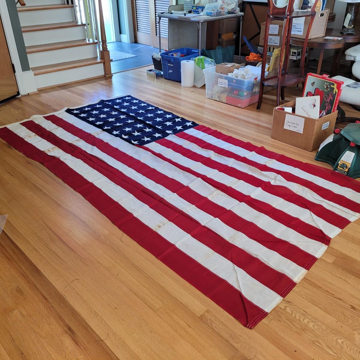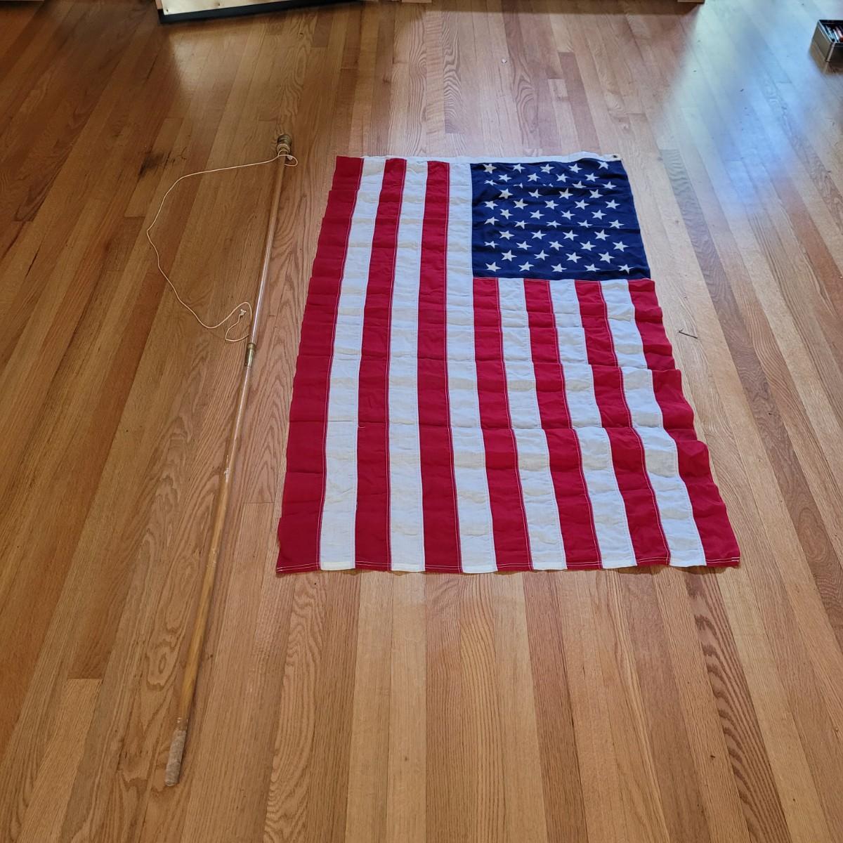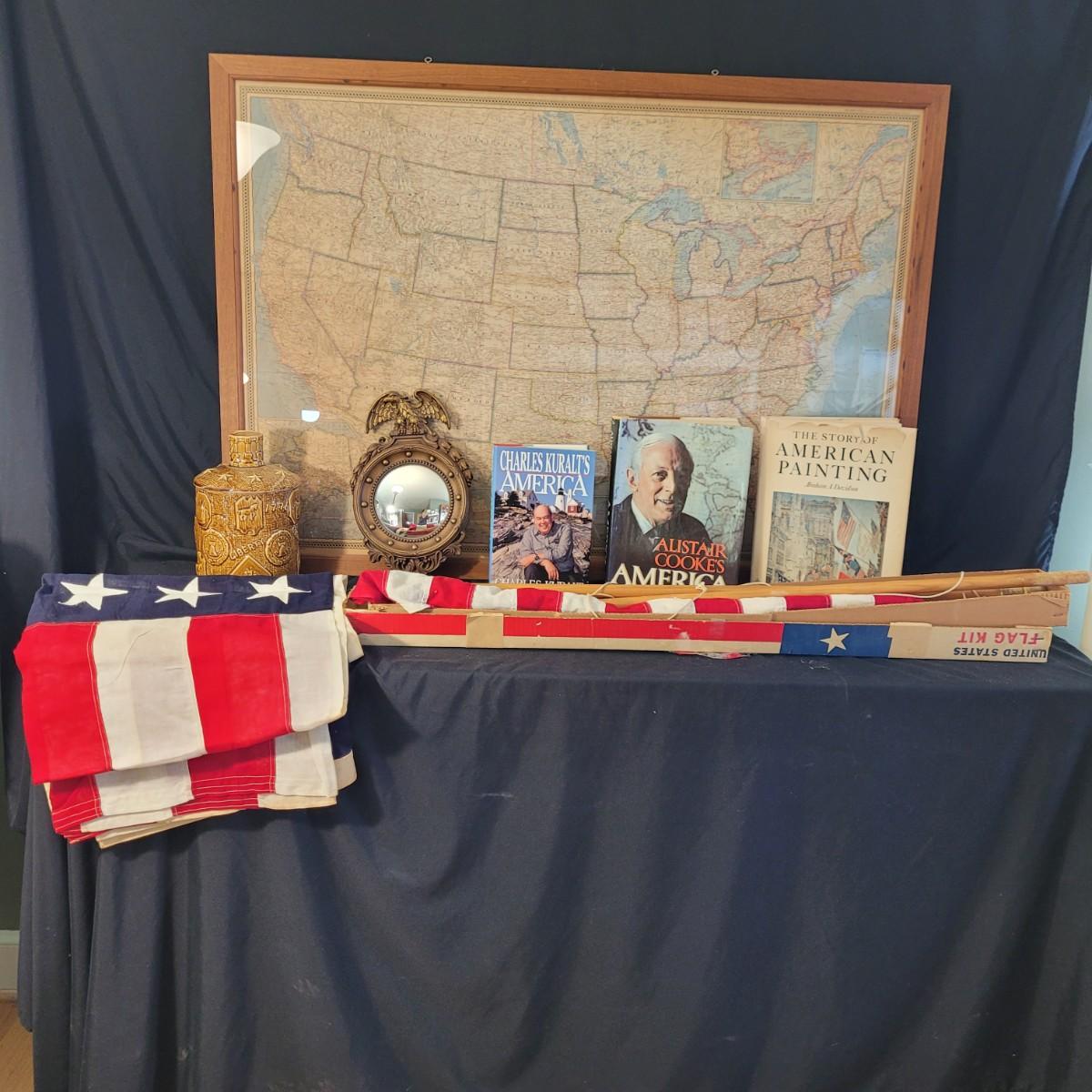 Americana collection includes a large 32"L x45"W solid wooden framed map of the U.S. Frame is heavy and has hardware attached to the top for hanging. Other items include a large 5' x9.5' flag, a flag kit with a smaller 3' x5' flag, a Revolutionary War themed jar, books and mirror with wooden eagle engraving. Jar measures approximately 6"DIA x10.5"H. The large flag is structurally in good condition, but does have some discoloration. Same with the smaller flag, but it shows much less discoloration. Local pickup only.