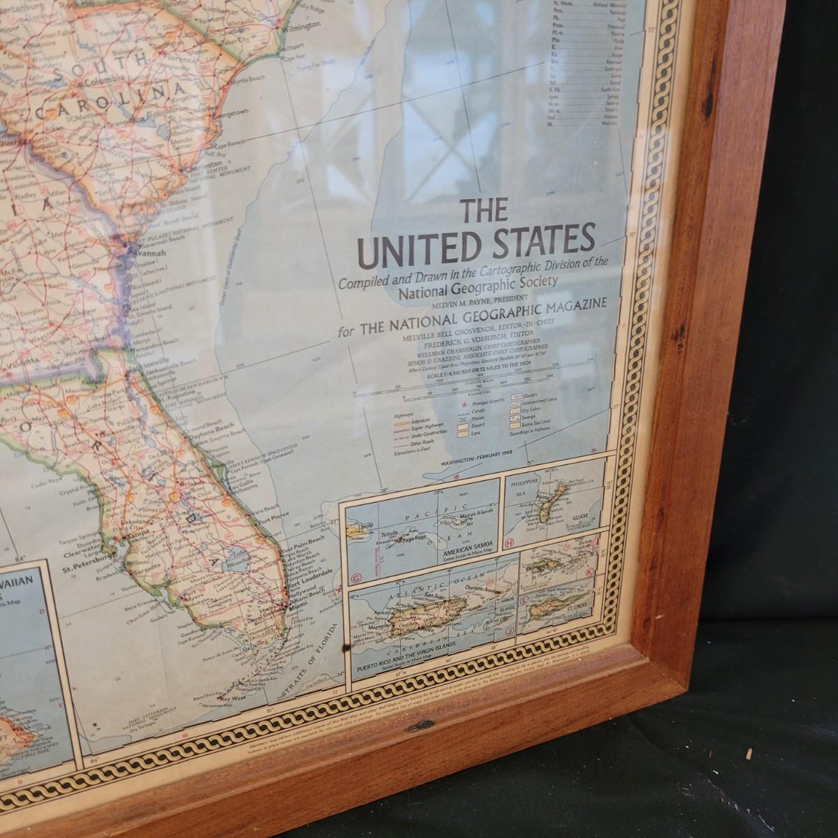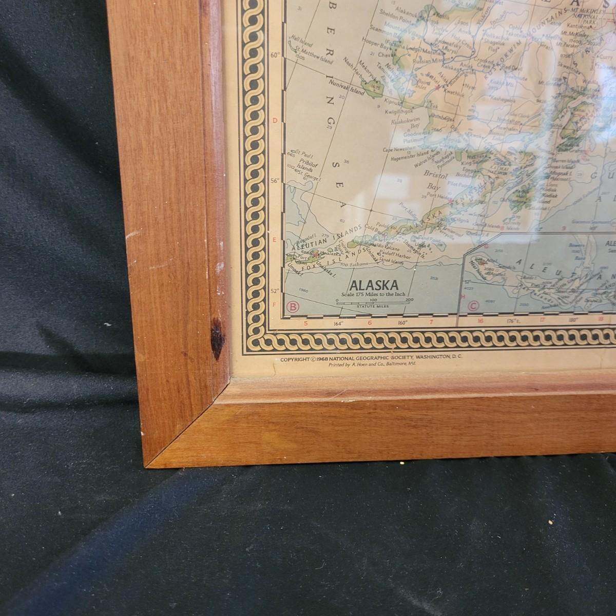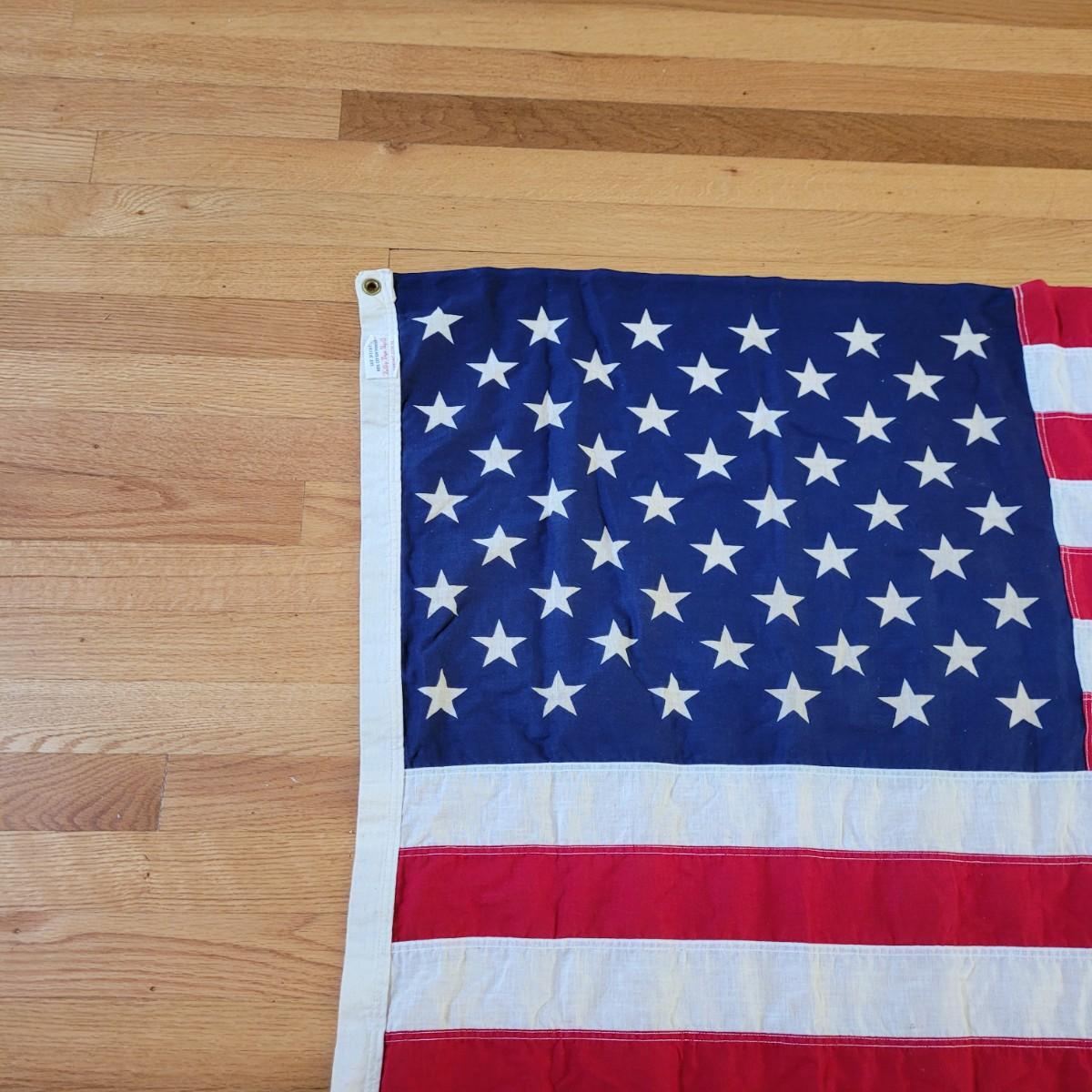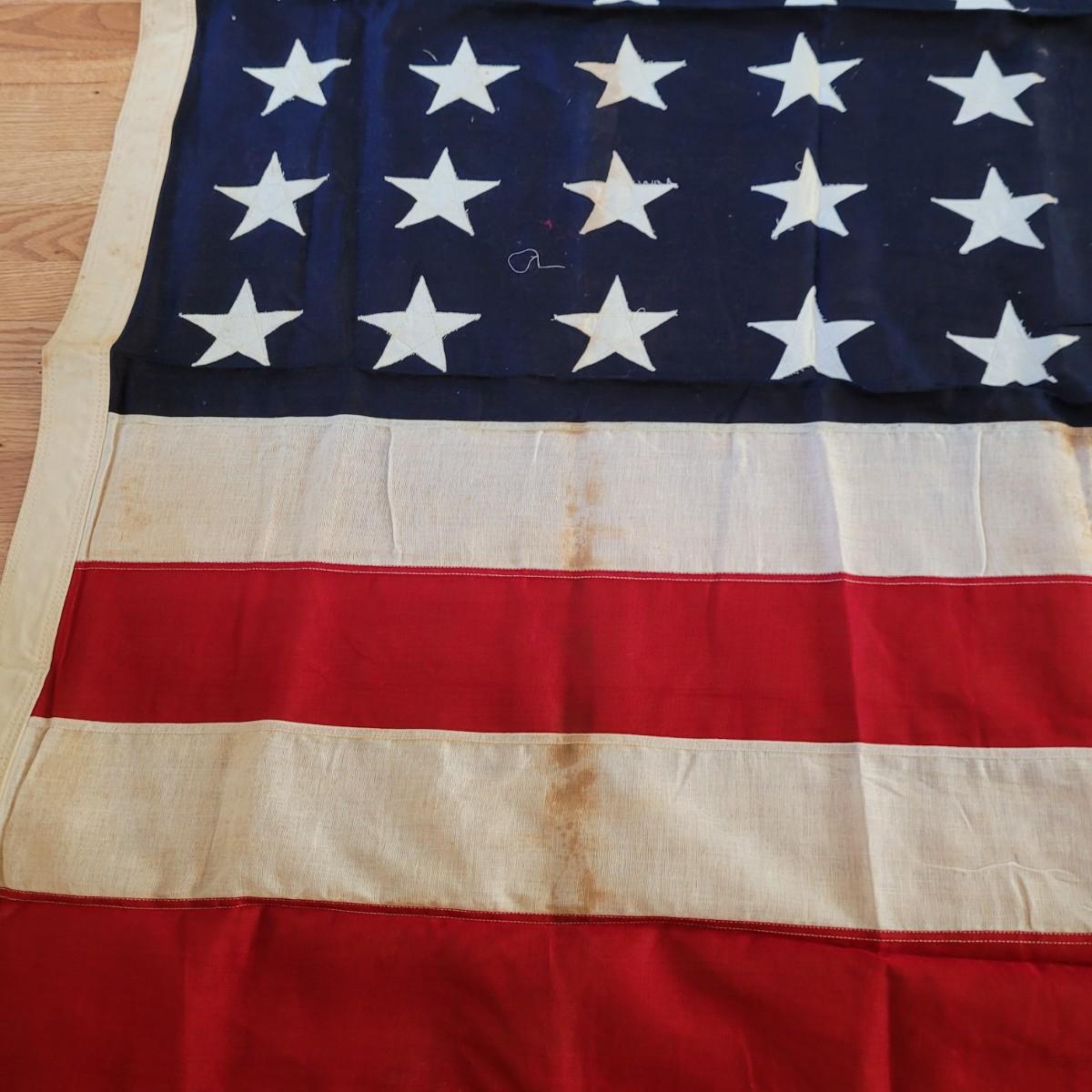 Americana collection includes a large 32"L x45"W solid wooden framed map of the U.S. Frame is heavy and has hardware attached to the top for hanging. Other items include a large 5' x9.5' flag, a flag kit with a smaller 3' x5' flag, a Revolutionary War themed jar, books and mirror with wooden eagle engraving. Jar measures approximately 6"DIA x10.5"H. The large flag is structurally in good condition, but does have some discoloration. Same with the smaller flag, but it shows much less discoloration. Local pickup only.