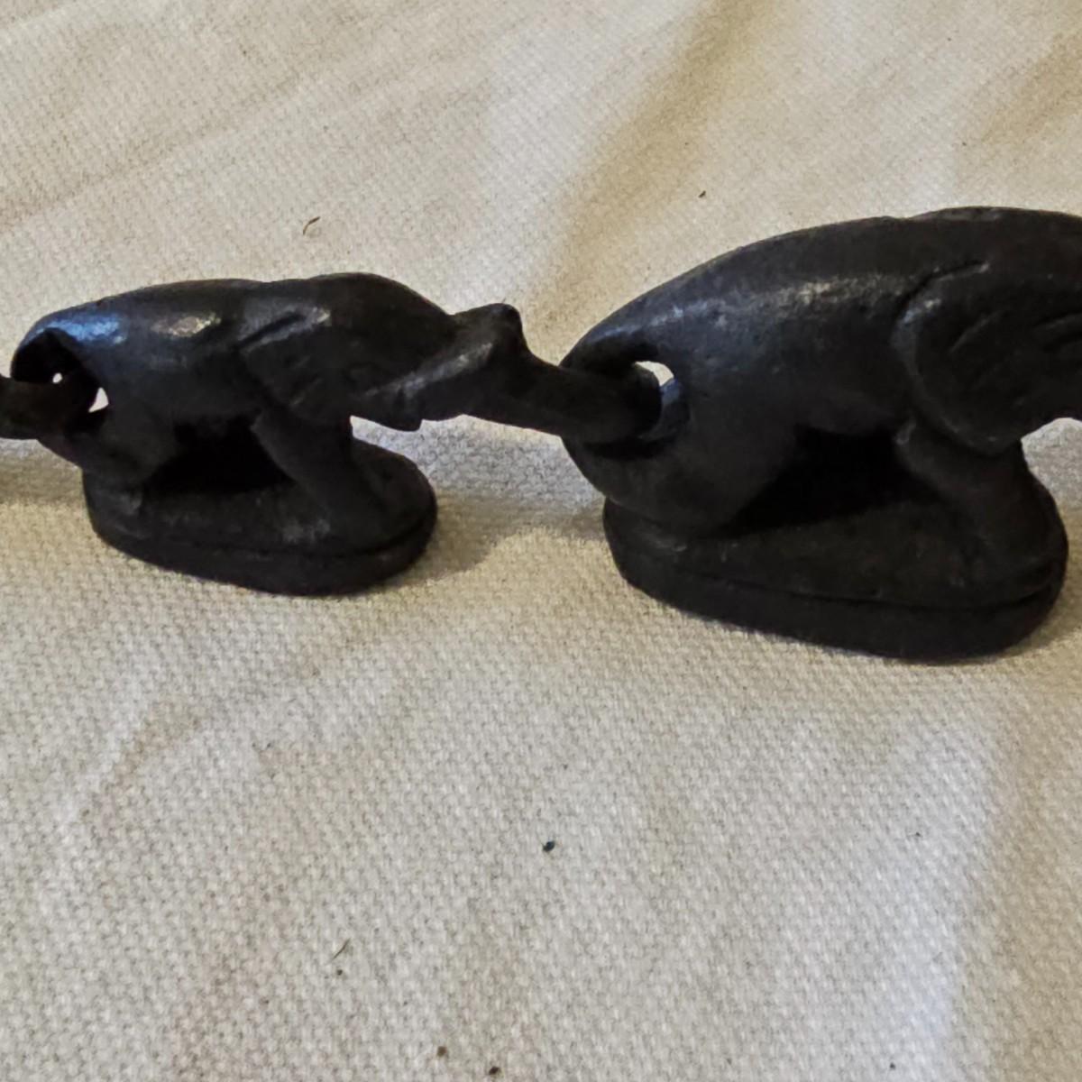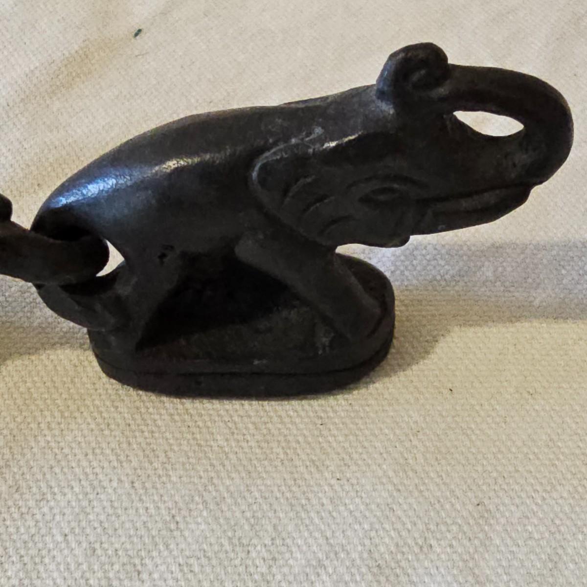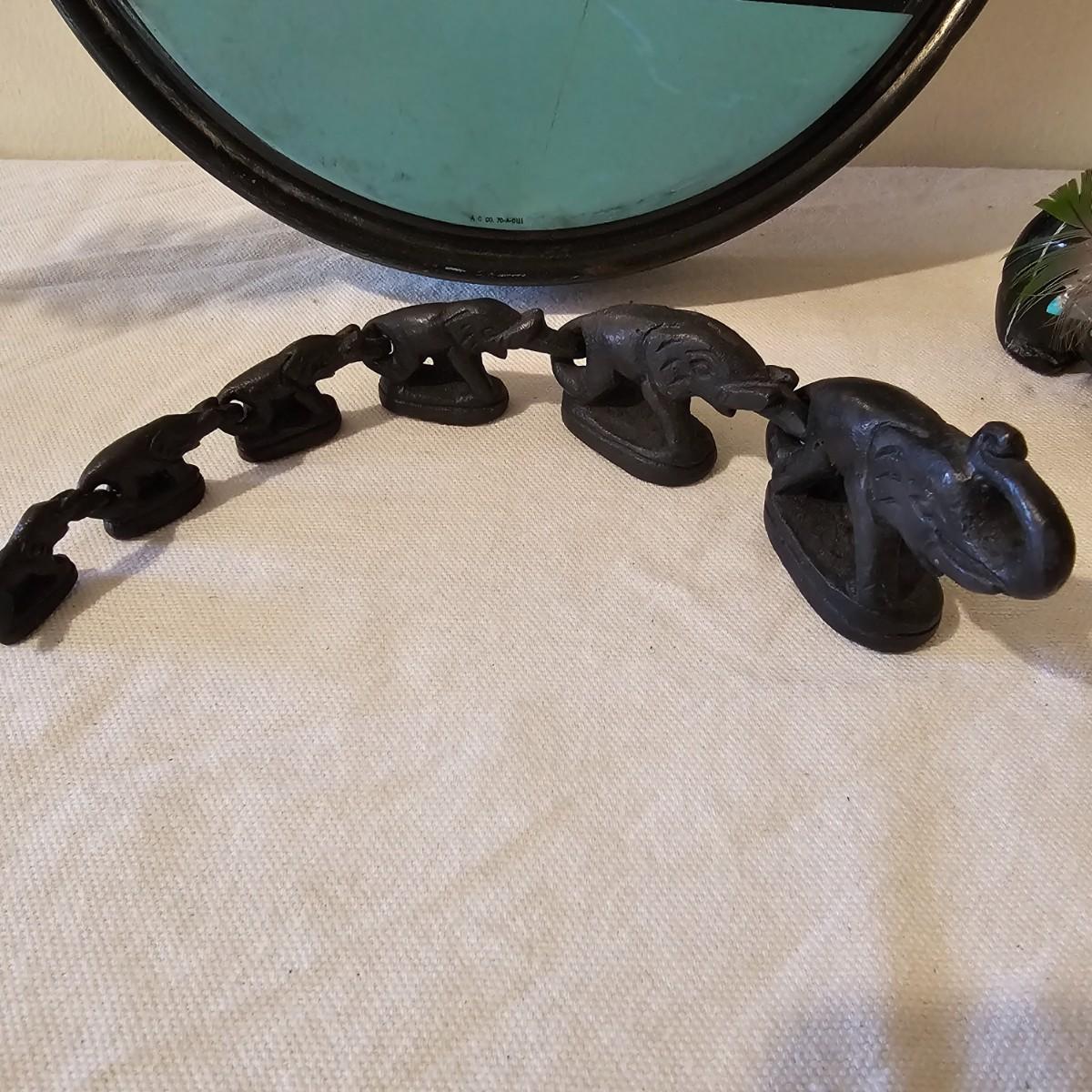 Fun assortment of metal and stone animals. Dragon candleholder is cast iron, measures 4.25" x 2.75" x 7"H. Small carved water buffalo is stone, measures 2.5" x 1.25"H. Metal tin is 8"D x 1.25"H, shows an orchestra of sprites and maiden musicians. Chain of elephants are cast iron, are 8.5" long, and link together trunk to tail. See photos for details. Shipping available.