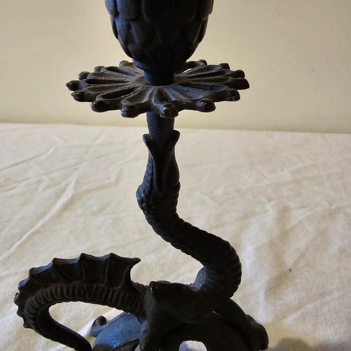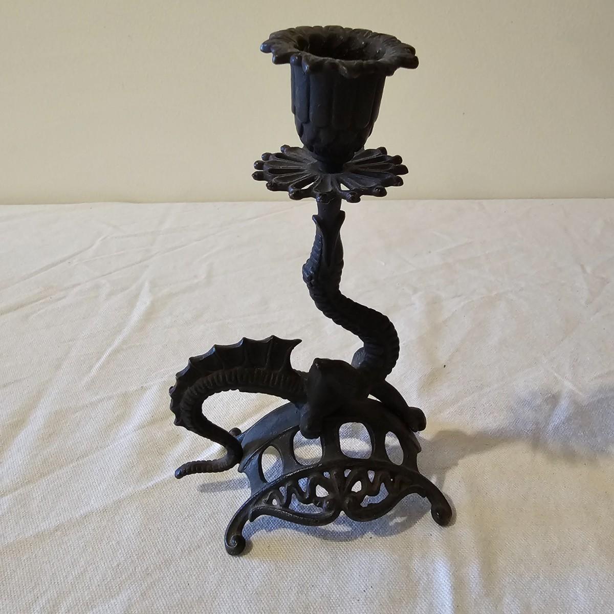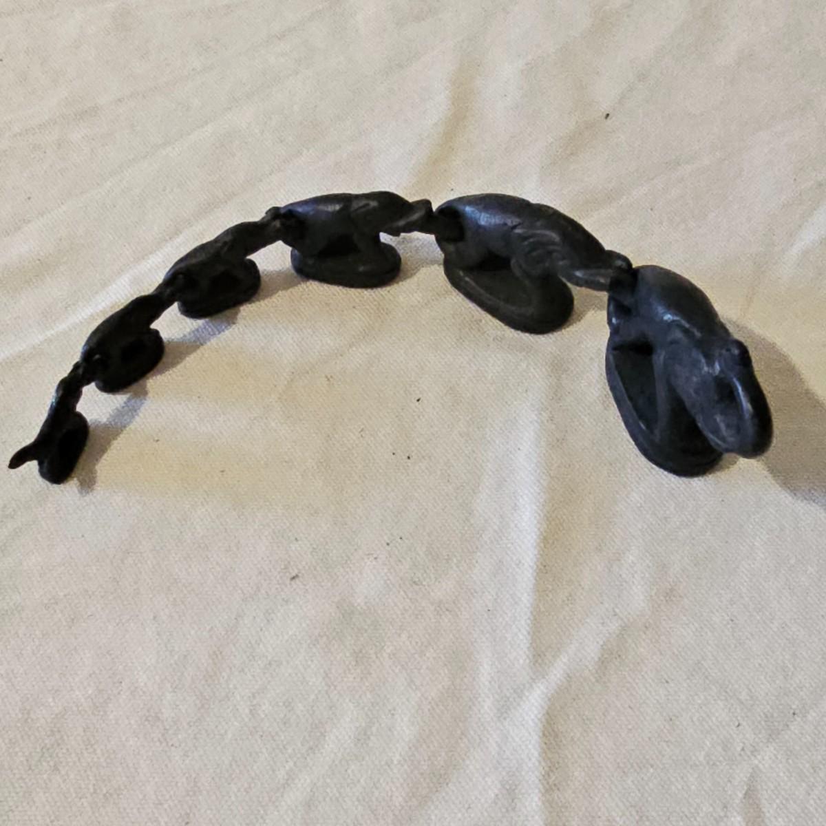 Fun assortment of metal and stone animals. Dragon candleholder is cast iron, measures 4.25" x 2.75" x 7"H. Small carved water buffalo is stone, measures 2.5" x 1.25"H. Metal tin is 8"D x 1.25"H, shows an orchestra of sprites and maiden musicians. Chain of elephants are cast iron, are 8.5" long, and link together trunk to tail. See photos for details. Shipping available.