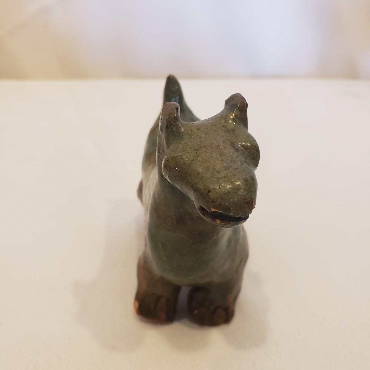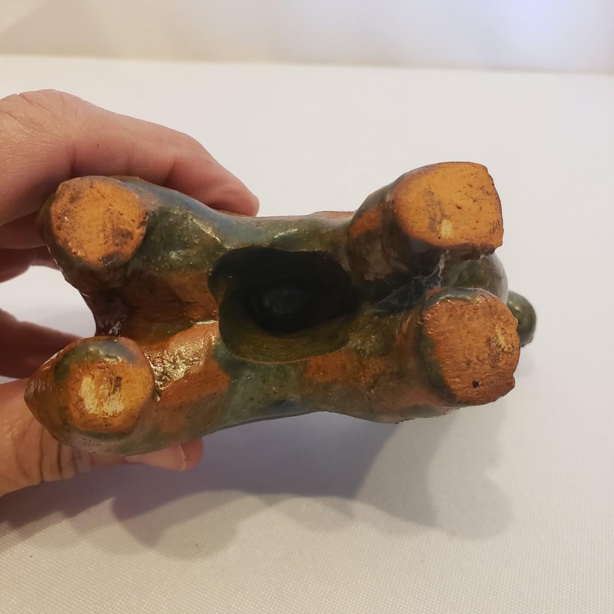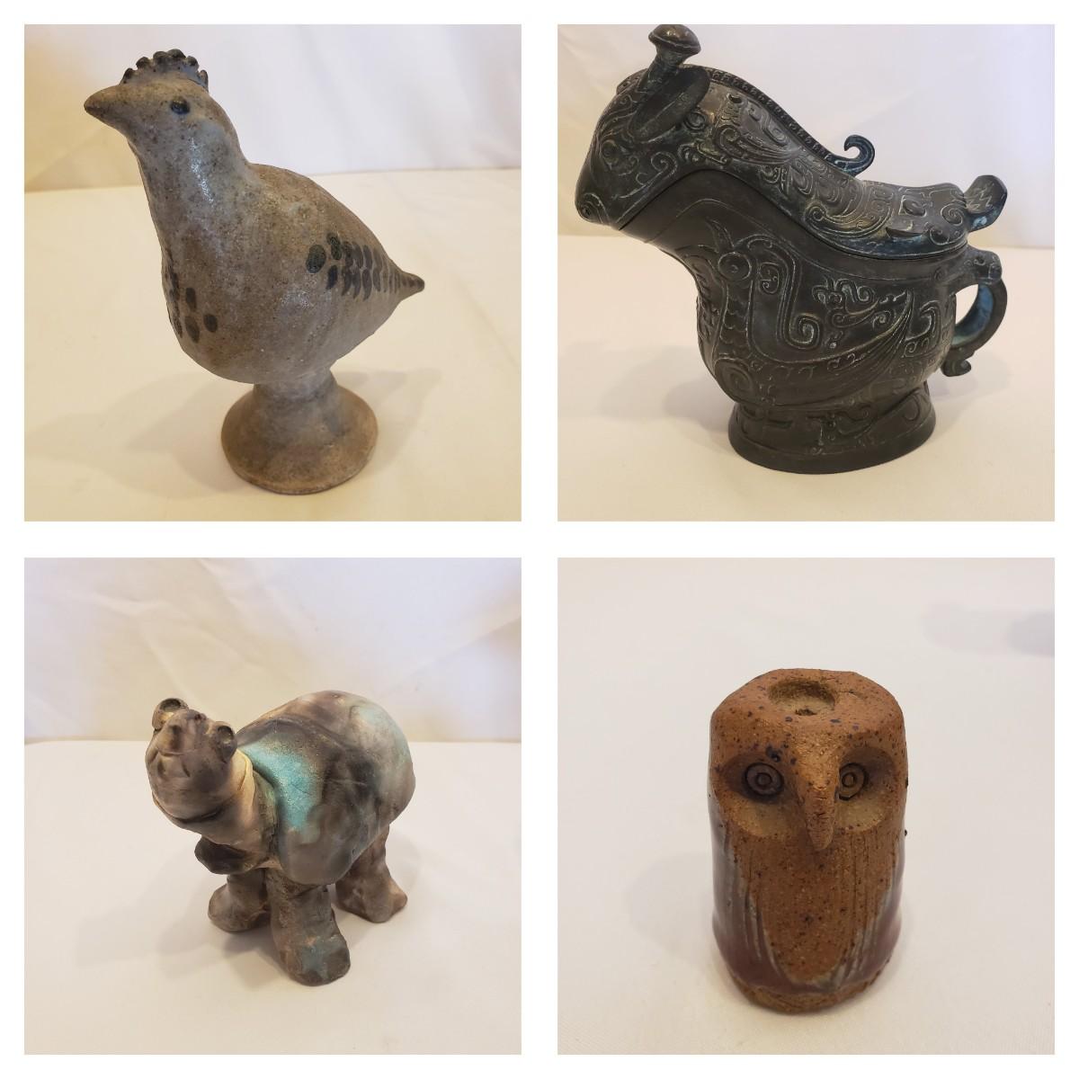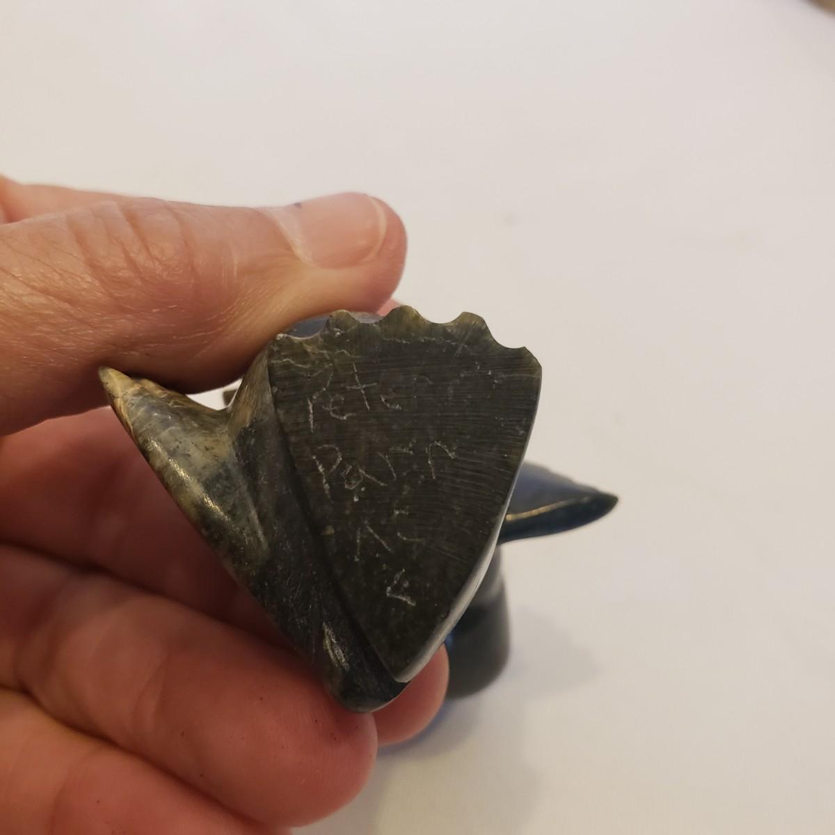 This animal themed lot features seven pieces of art. Lot includes a pottery turtle, owl, dog and bird, while the horse and bird on a marble block are metal. The bird has a tag from Alva Museum Replicas. The walrus appears to be signed by Inuit artist Peter Parr. The metal horse-like creature is stamped; it has a removable lid and measures 7" x 3" x 7"H. The owl has a hole for a possible incense stick.