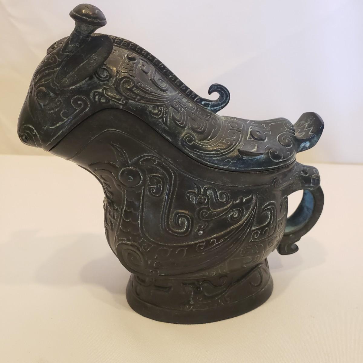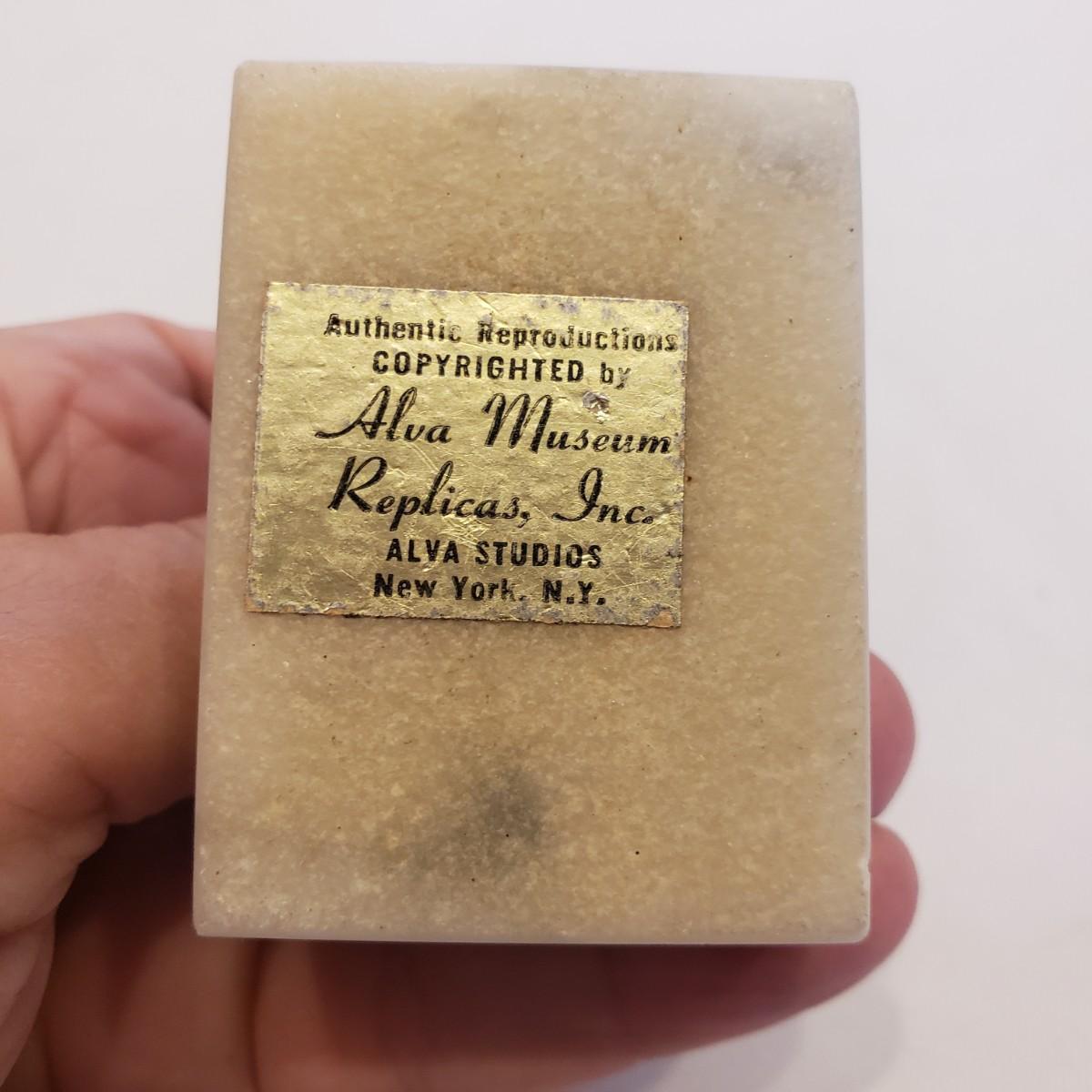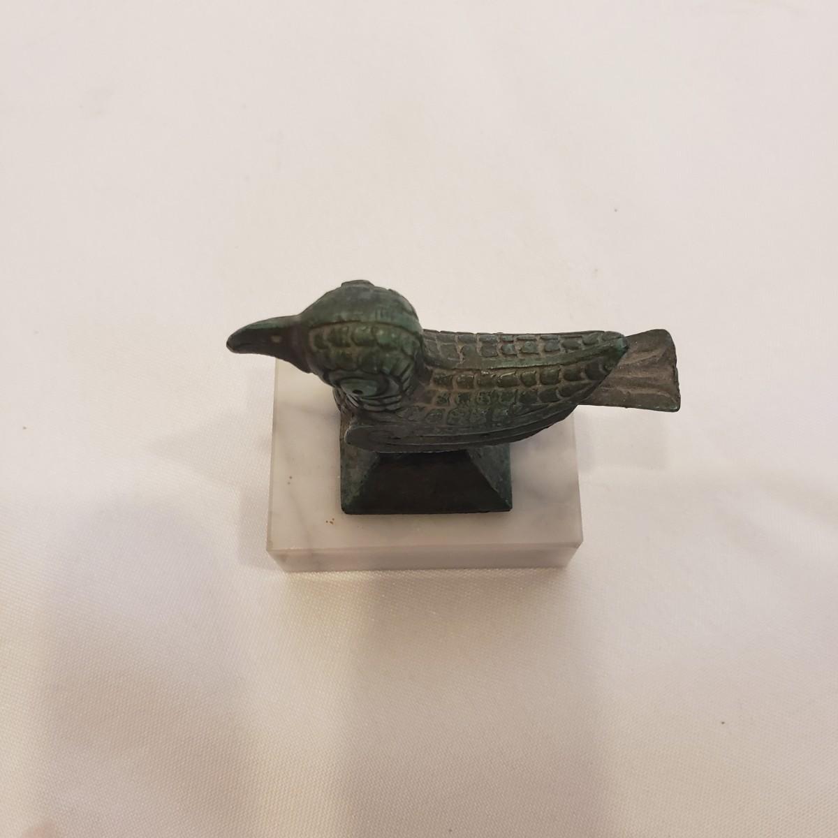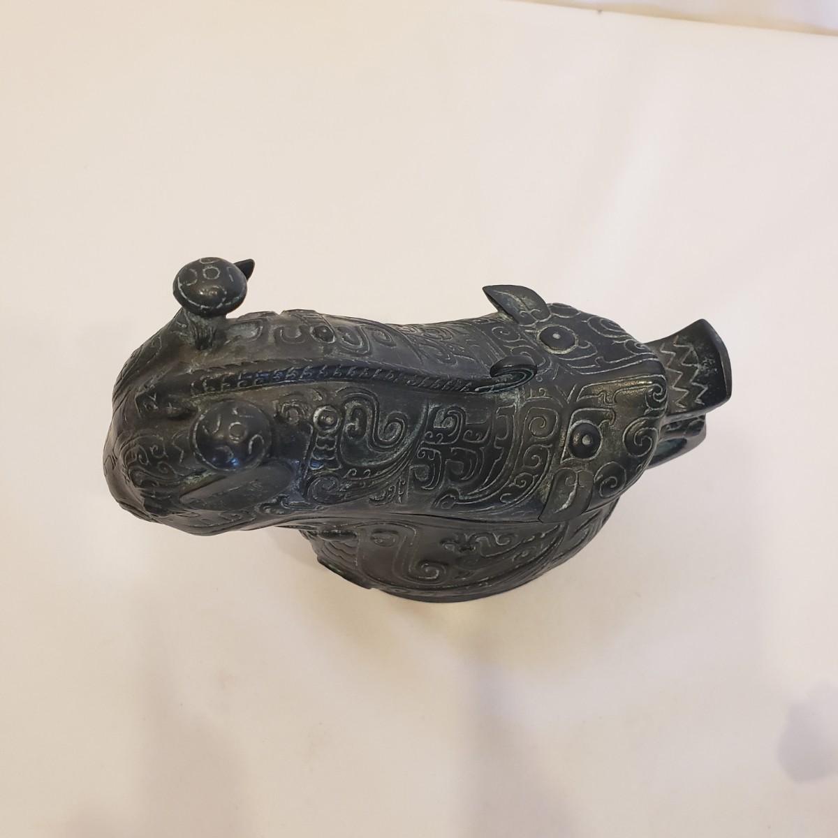 This animal themed lot features seven pieces of art. Lot includes a pottery turtle, owl, dog and bird, while the horse and bird on a marble block are metal. The bird has a tag from Alva Museum Replicas. The walrus appears to be signed by Inuit artist Peter Parr. The metal horse-like creature is stamped; it has a removable lid and measures 7" x 3" x 7"H. The owl has a hole for a possible incense stick.