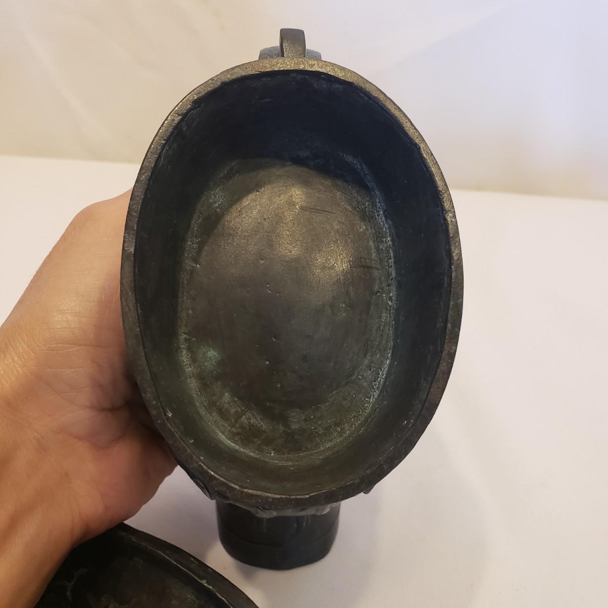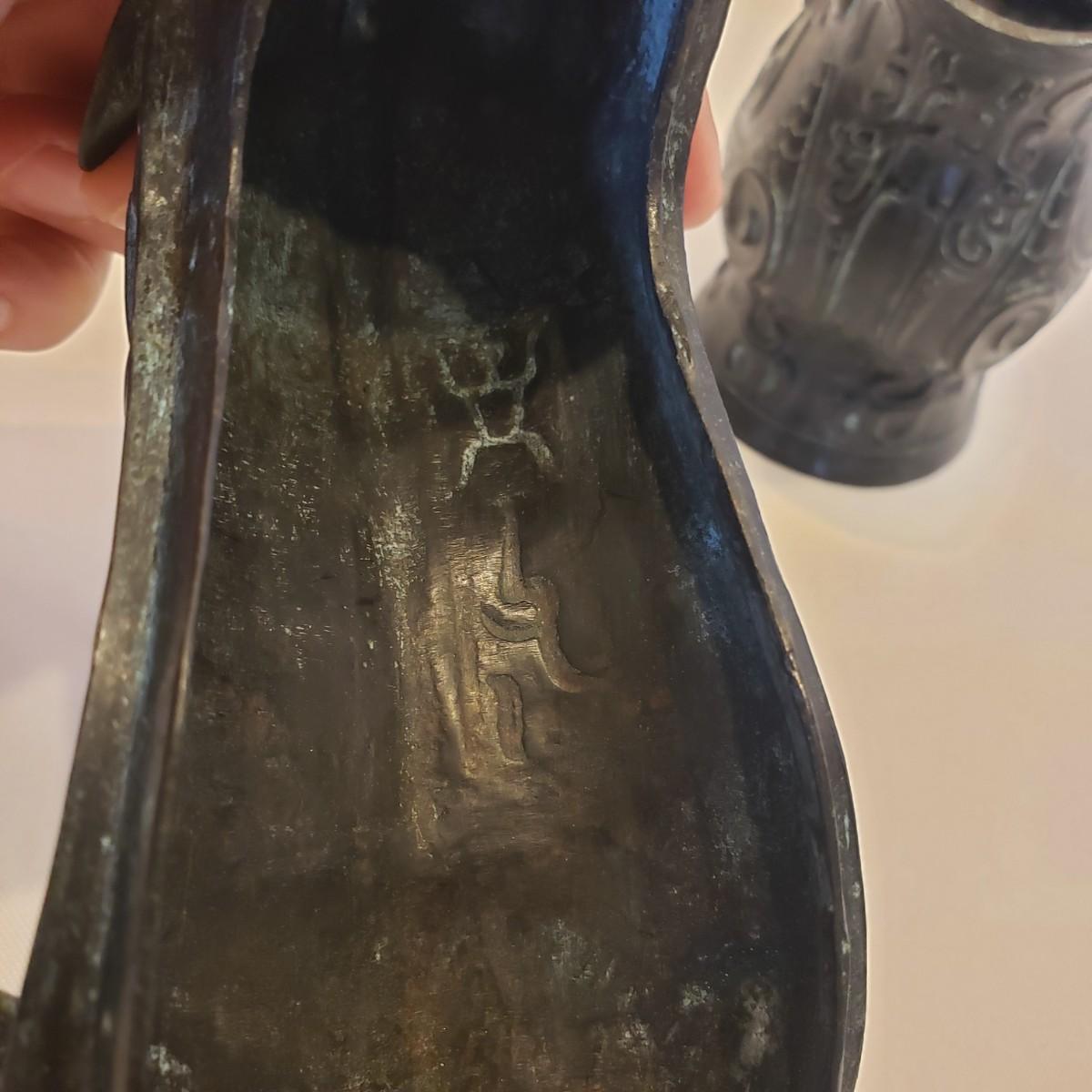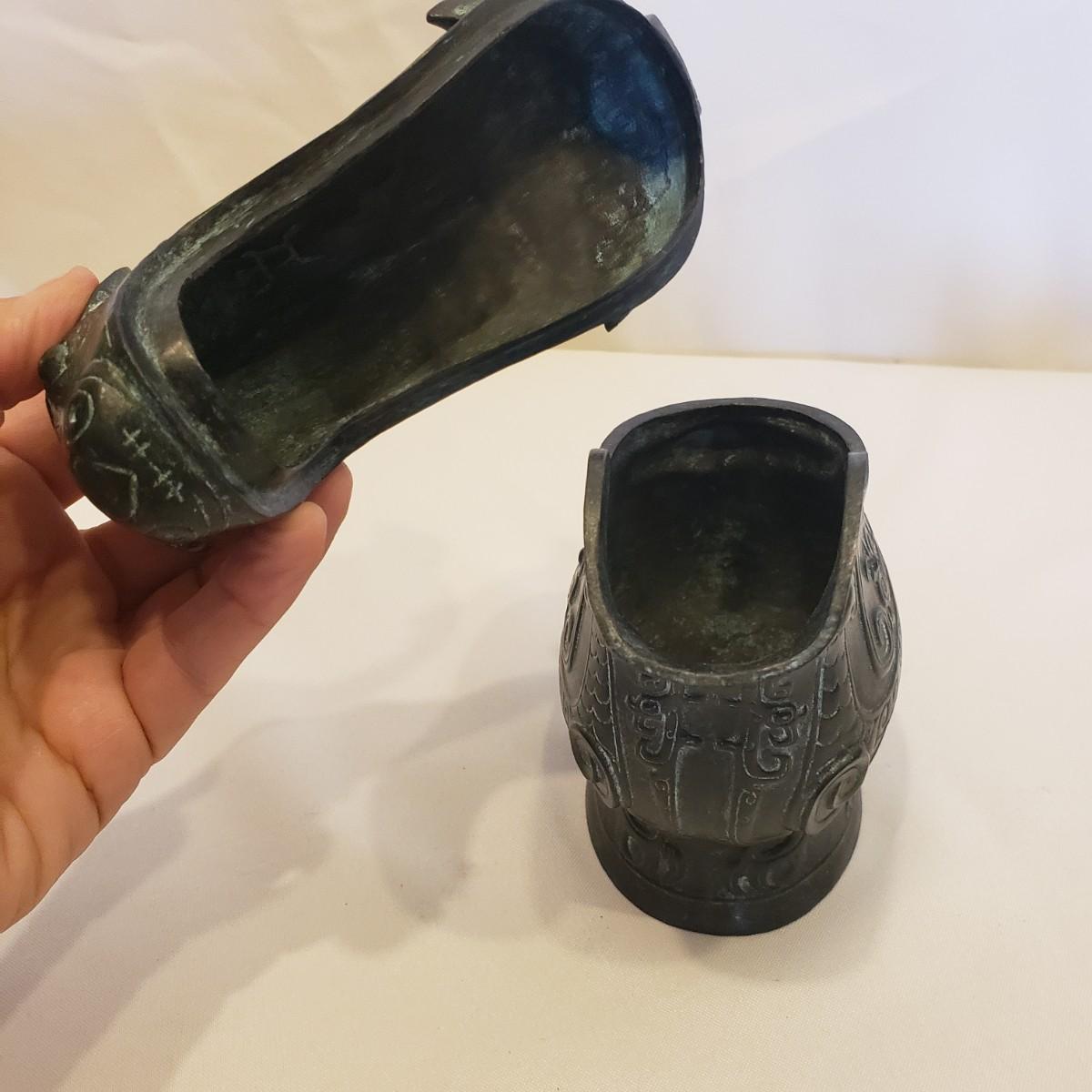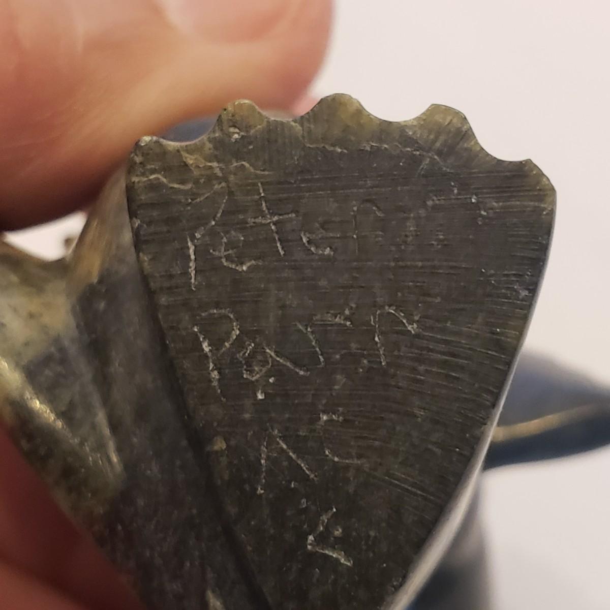 This animal themed lot features seven pieces of art. Lot includes a pottery turtle, owl, dog and bird, while the horse and bird on a marble block are metal. The bird has a tag from Alva Museum Replicas. The walrus appears to be signed by Inuit artist Peter Parr. The metal horse-like creature is stamped; it has a removable lid and measures 7" x 3" x 7"H. The owl has a hole for a possible incense stick.