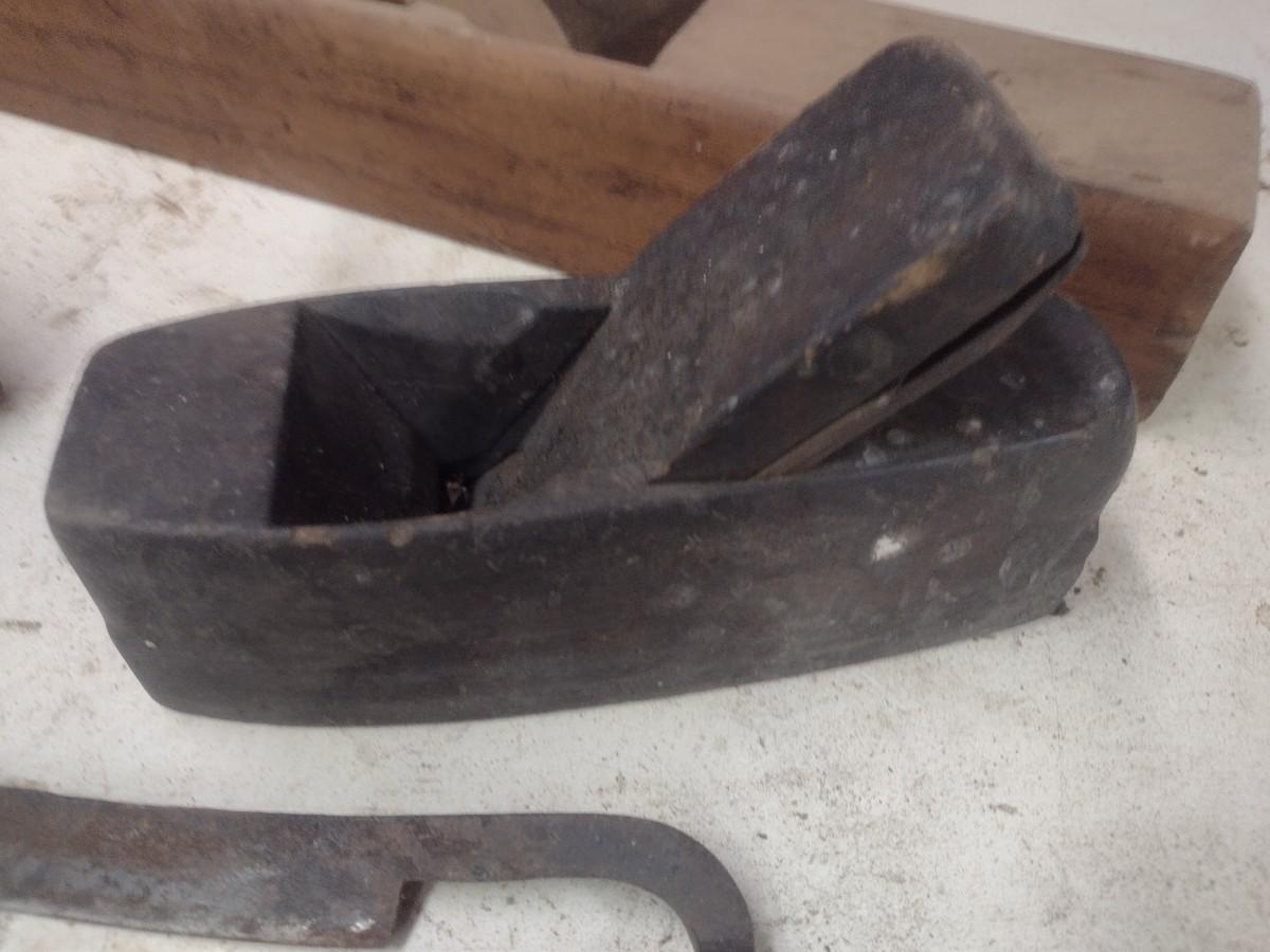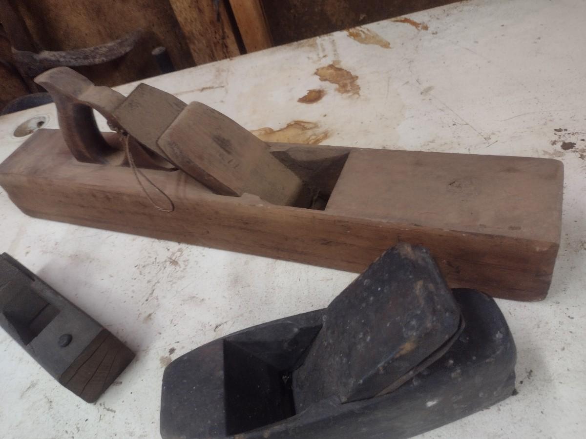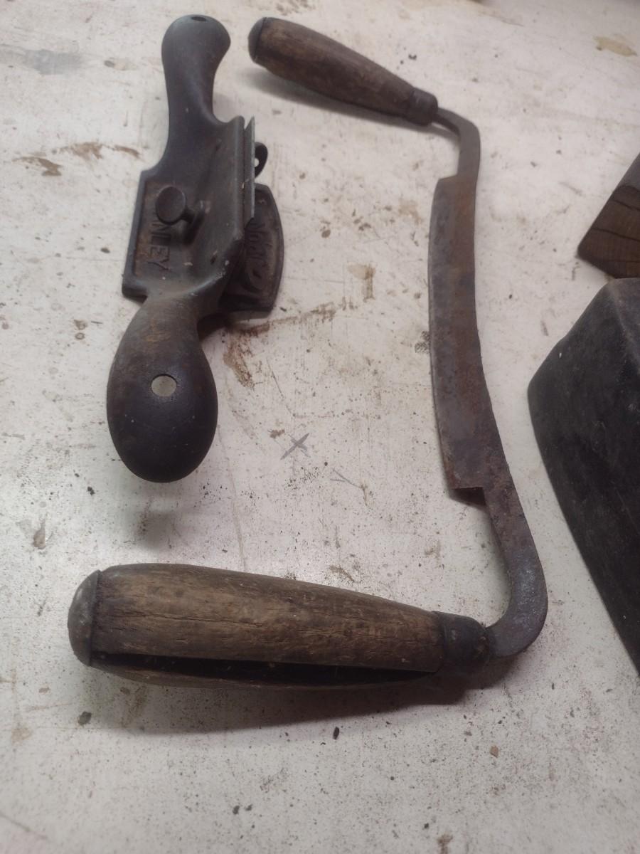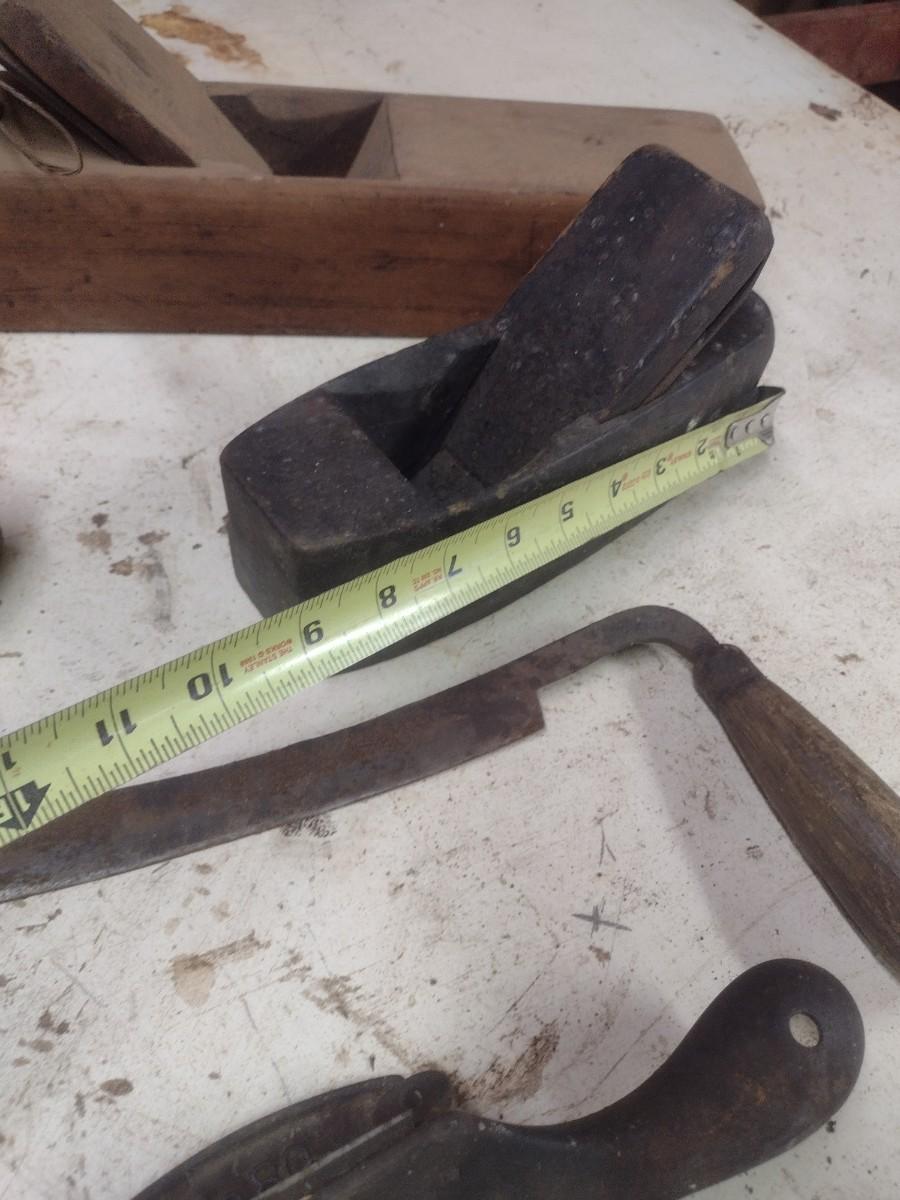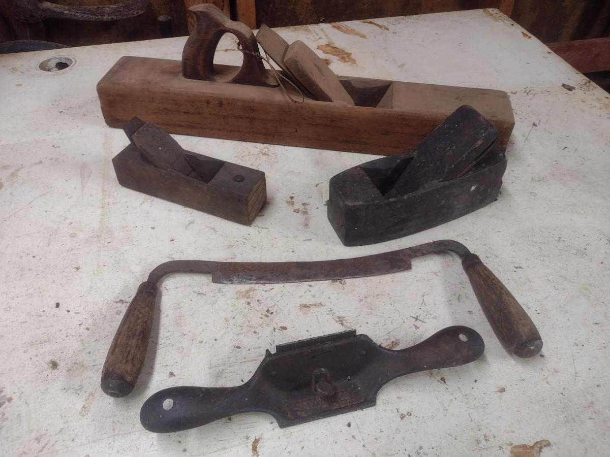 Collection of Antique and Vintage Wood Shaping Tools Includes Hand Planes and Draw Knife