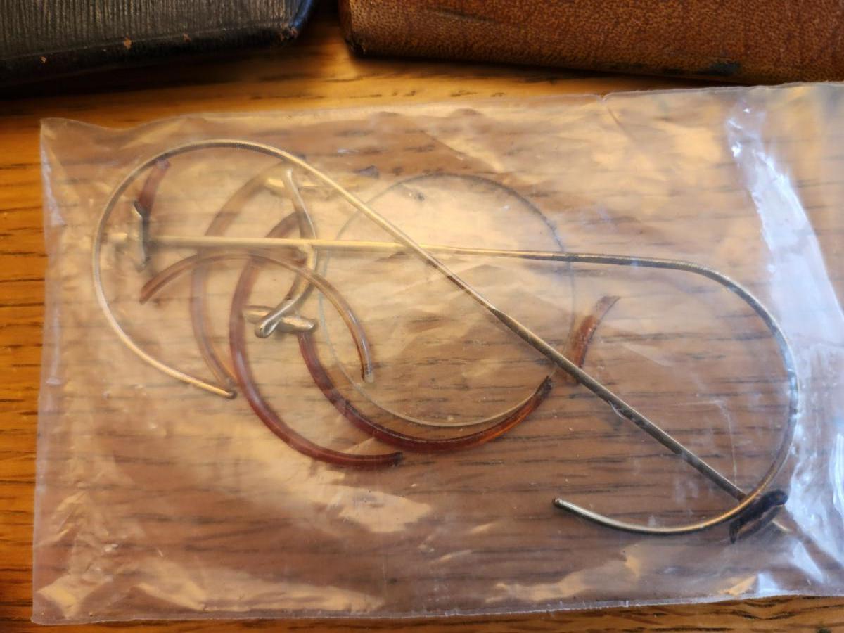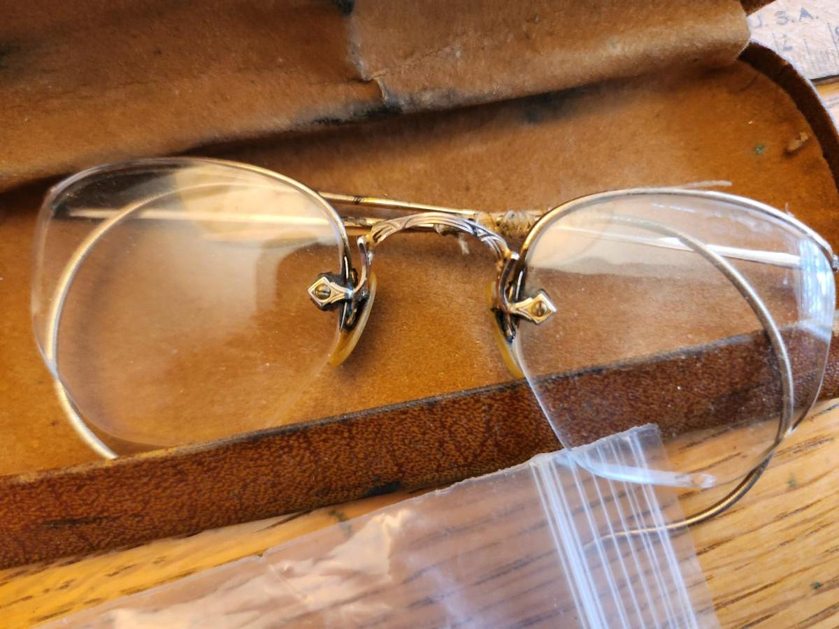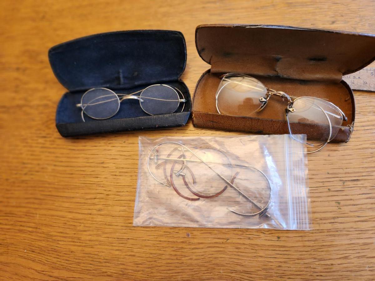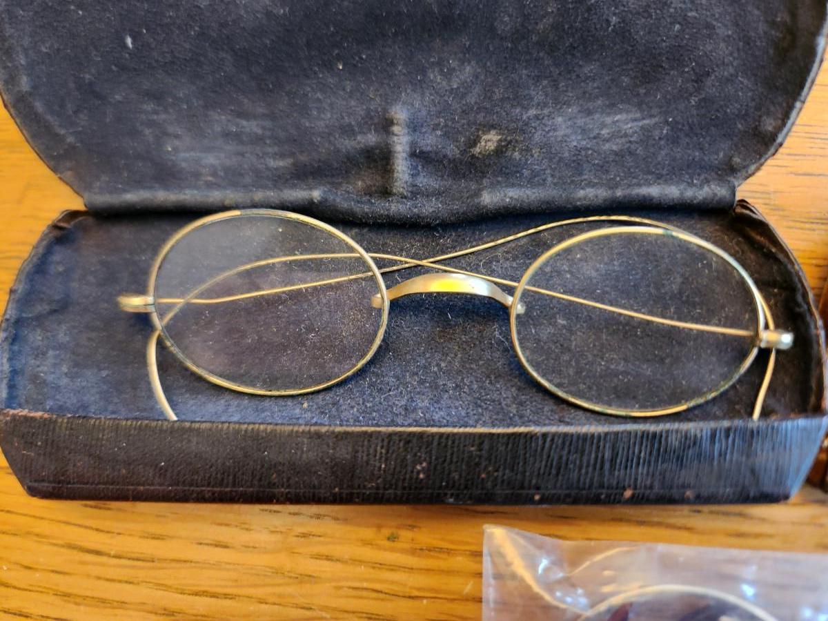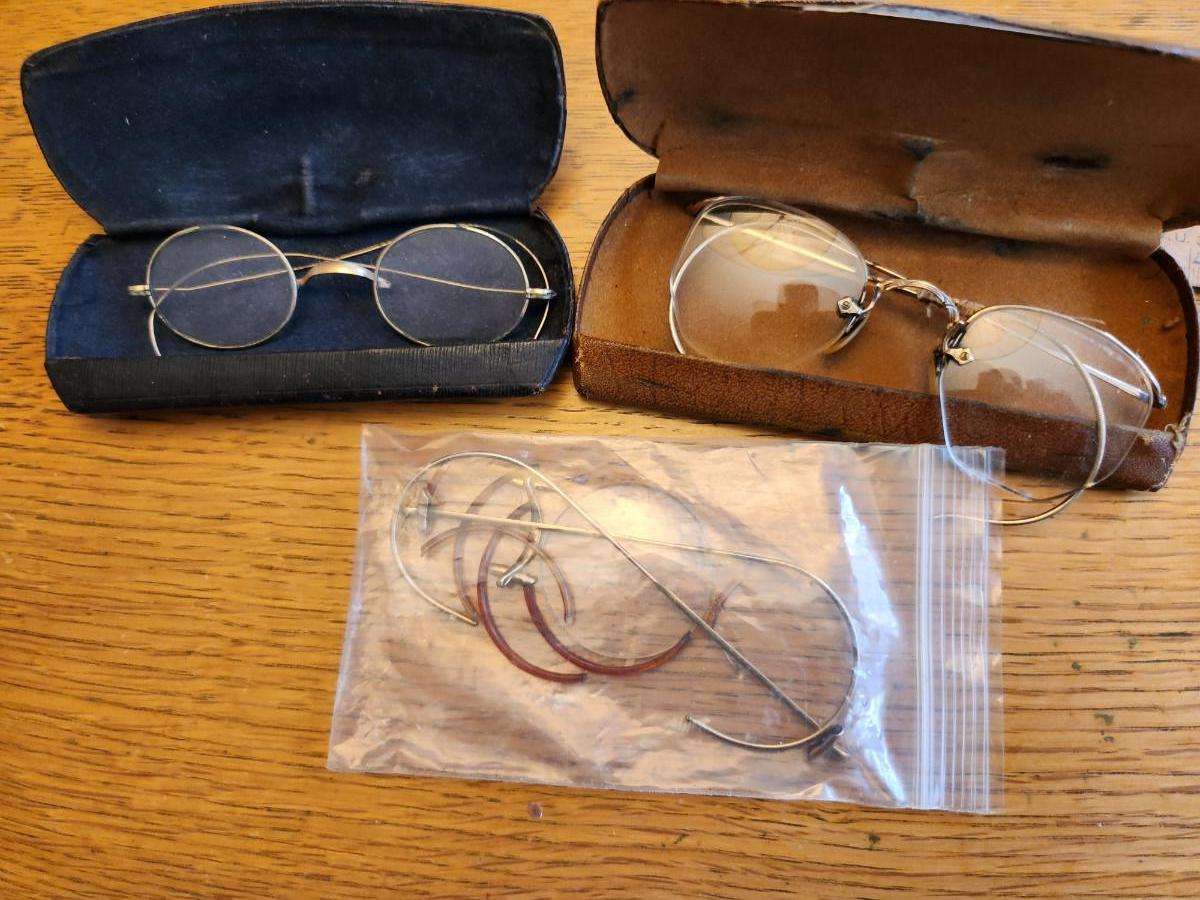 This auction lot is for a Collection of Antique Eyewear. Consisting of one "gold-toned" oval frames with thin wire earpieces in a black case. This set is marked with a left-pointing arrow over the letter M. We believe these to be 10K, but only you can be the judge. The second set is a thicker glass with an more octagonal shape lens. The "gold-toned" frame is marked Huron - 1/10 12KGF. They have been repaired with twine and toothpick to reinforce and are in a brown case. The final set is not together and held in a plastic bag. It is missing one of the lenses and is in many parts The bridge piece is marked "G.F. Shur-On". Does that mean gold-filled? You be the judge and jury with your bid.