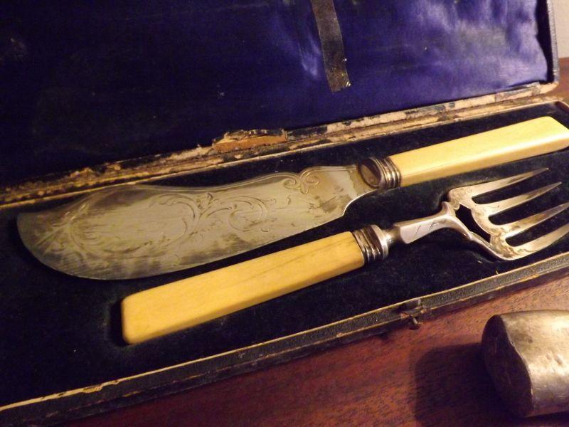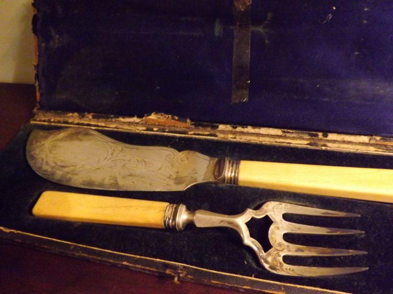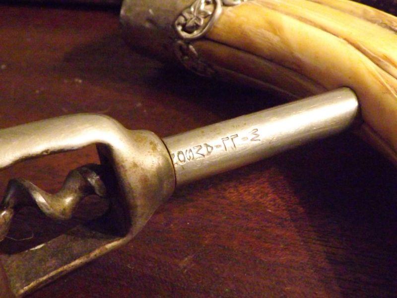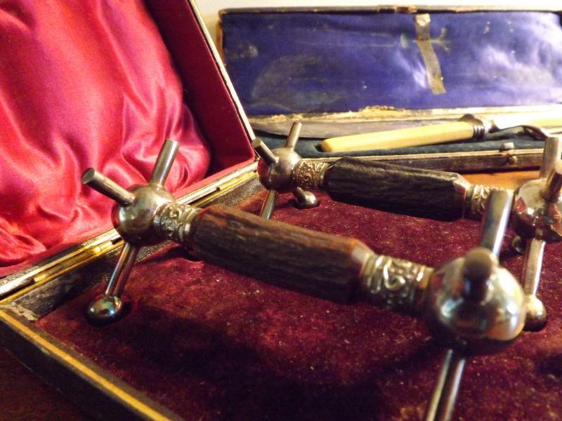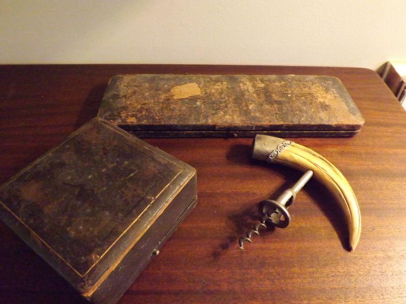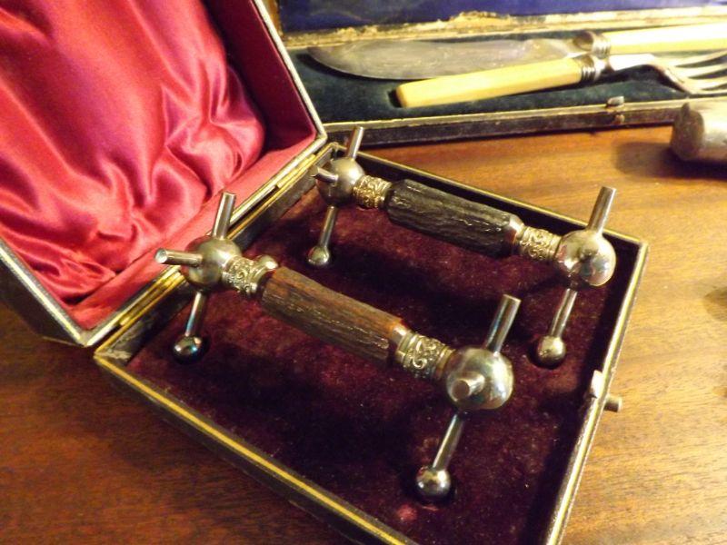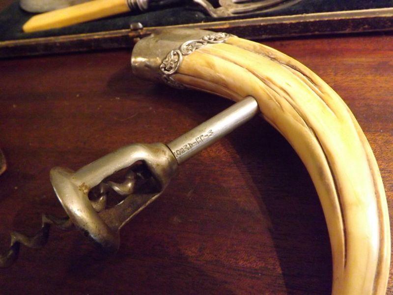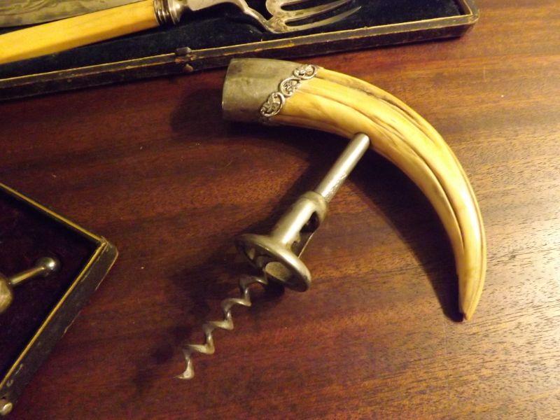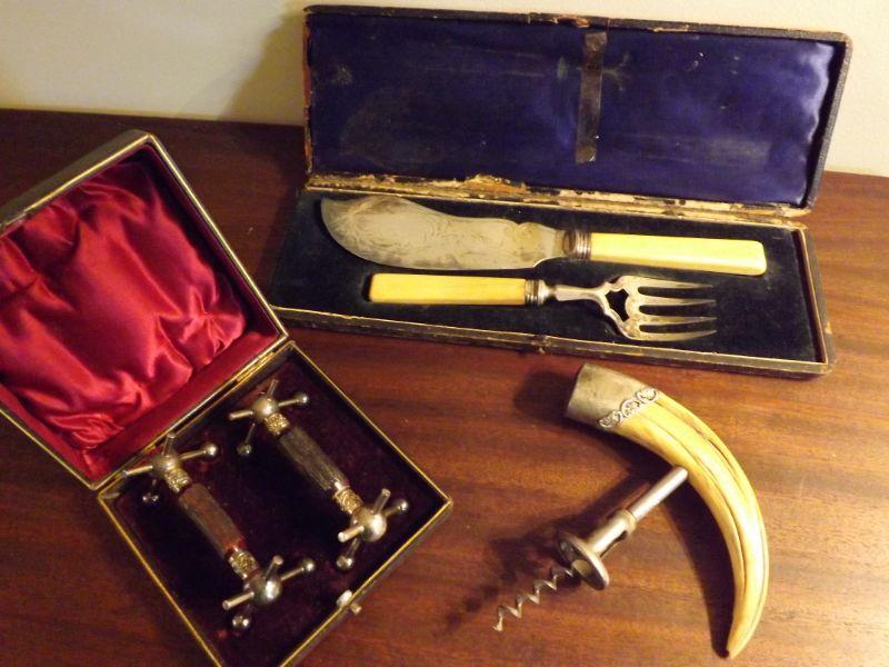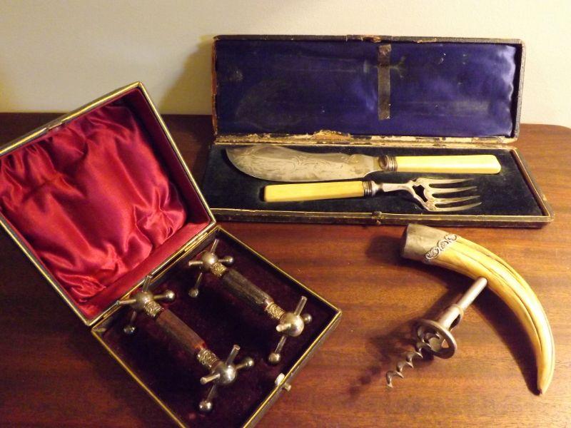 Set includes corkscrew with boar's tusk and silver, set of bone handled knife and fork, and a set of 2 knife rests. **Please read Terms and Conditions before placing a bid. Pick up is Sunday, September 1, 2019 from 10am to 4pm in Williamstown. All sales are final. All sales are as is, where is. Please review all photos. Any props included in photos are not included in listing. All measurements are approximate. From home with cats.